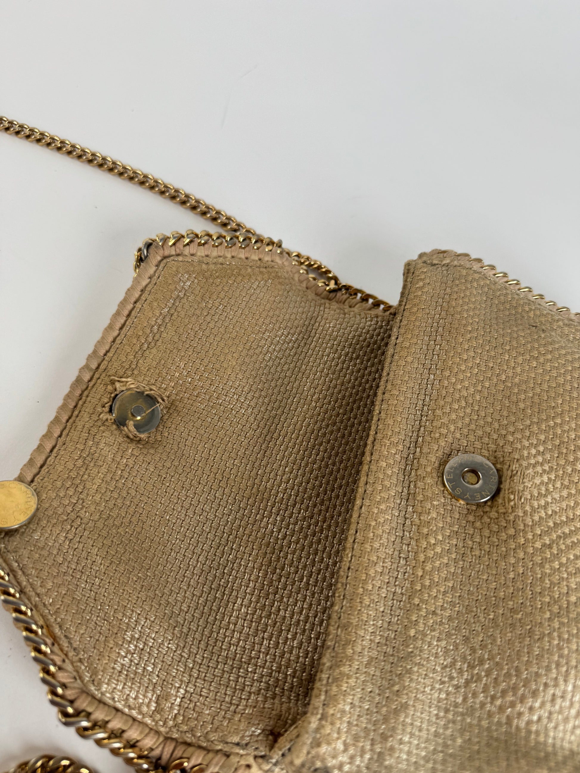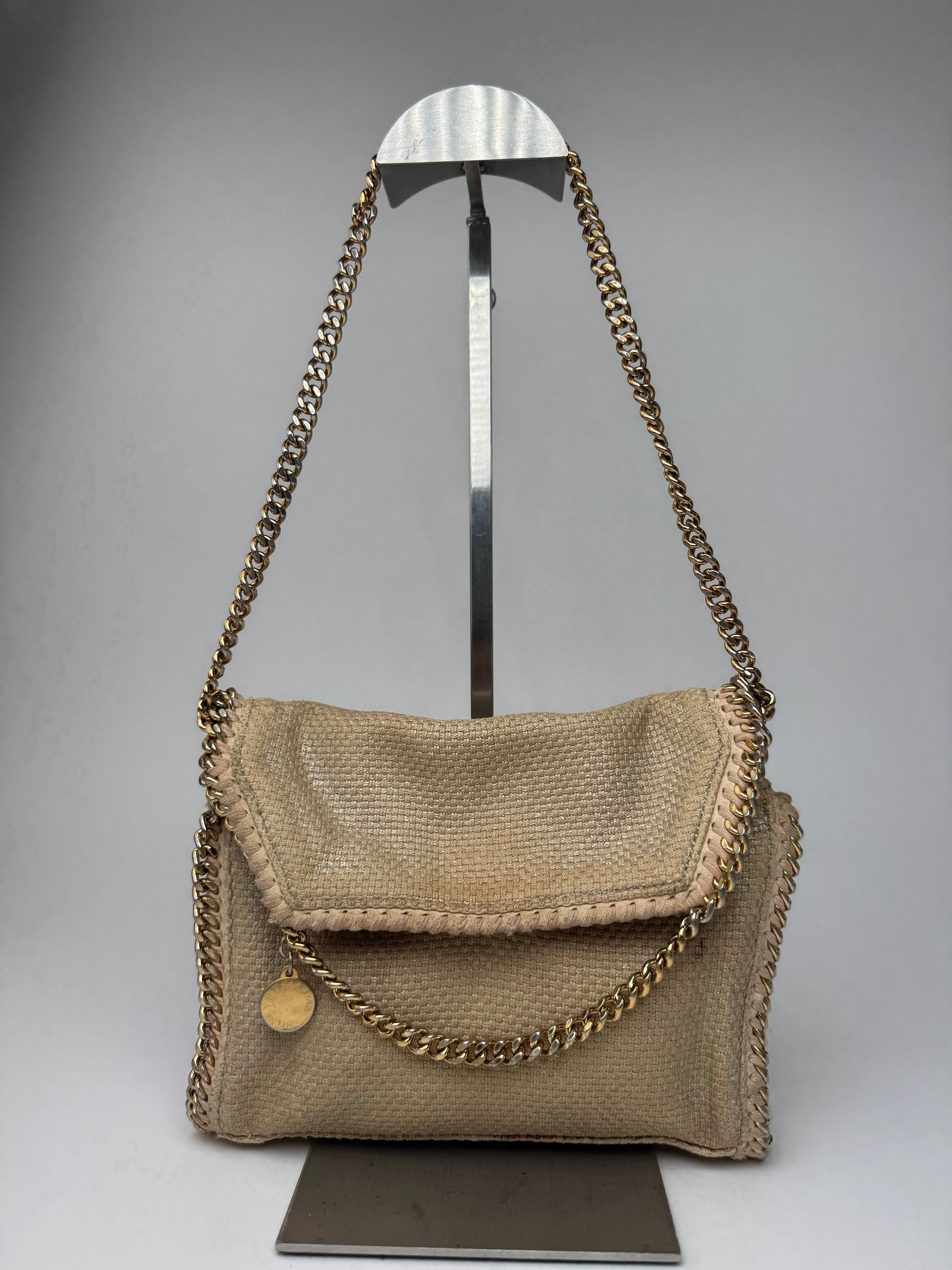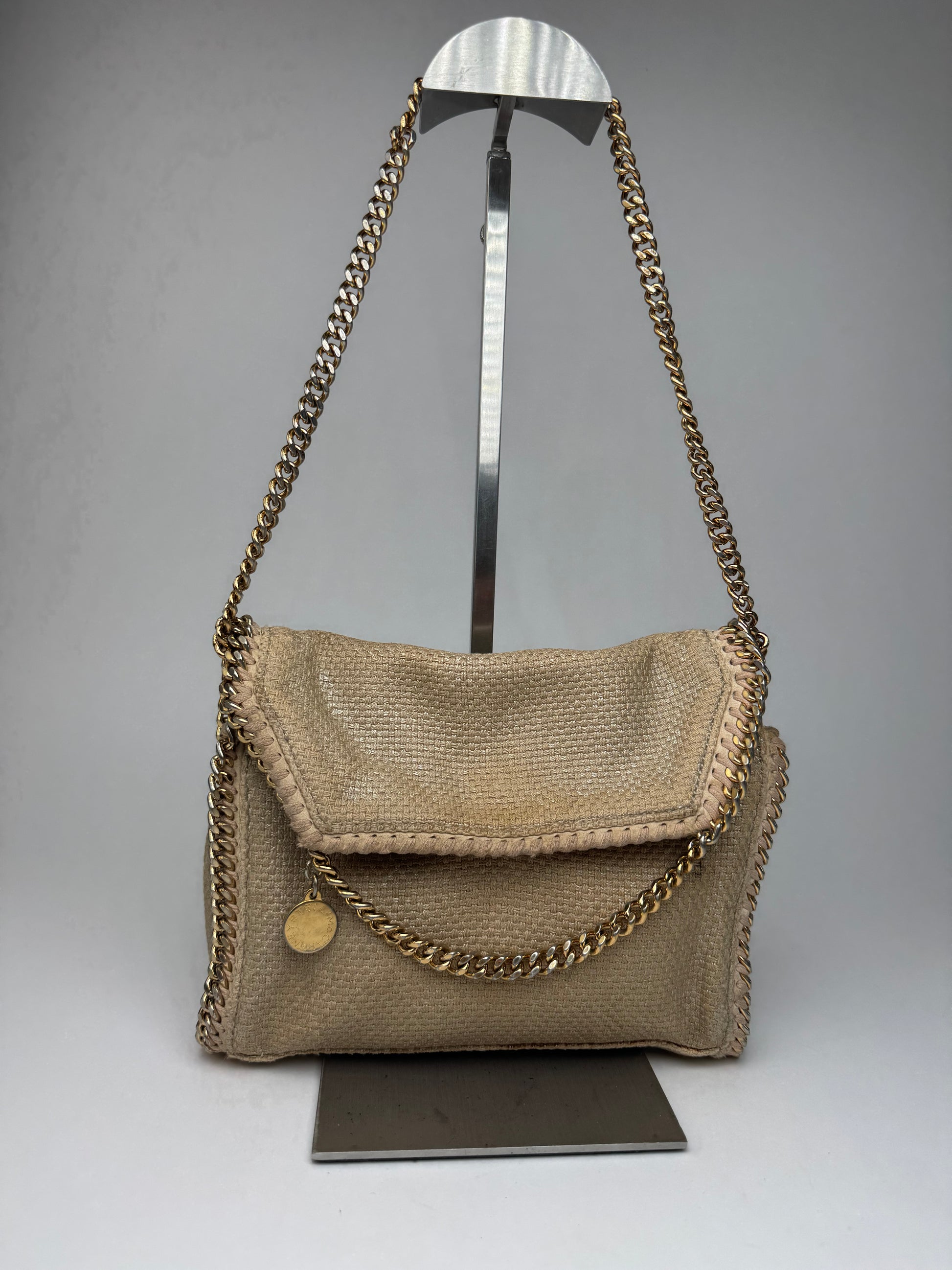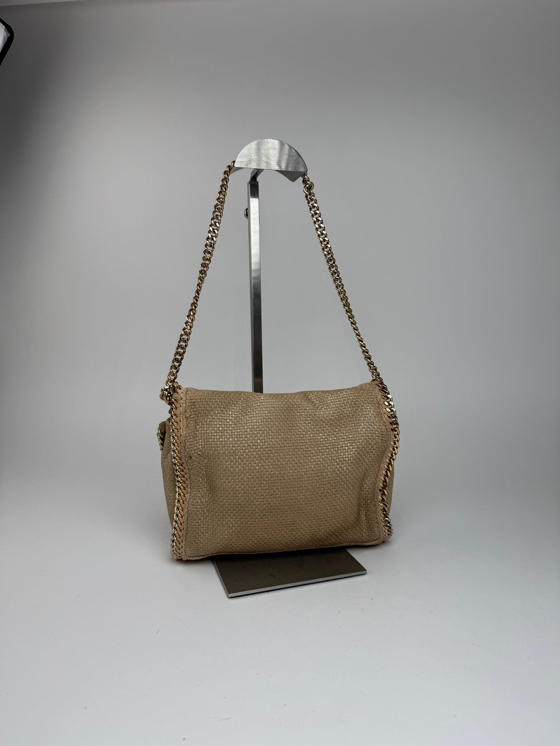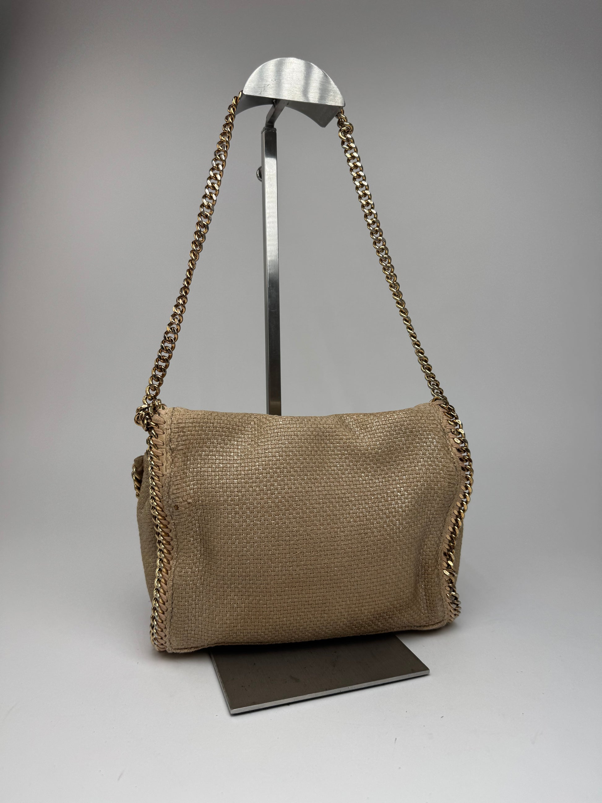 STELLA McCARTNEY Falabella Vintage Shoulder Bag. This stylish handbag is finely crafted from straw-like woven vegan leather in a golden tone. The bag features a gold-tone steel chain shoulder strap that can also be styled as a top handle.
