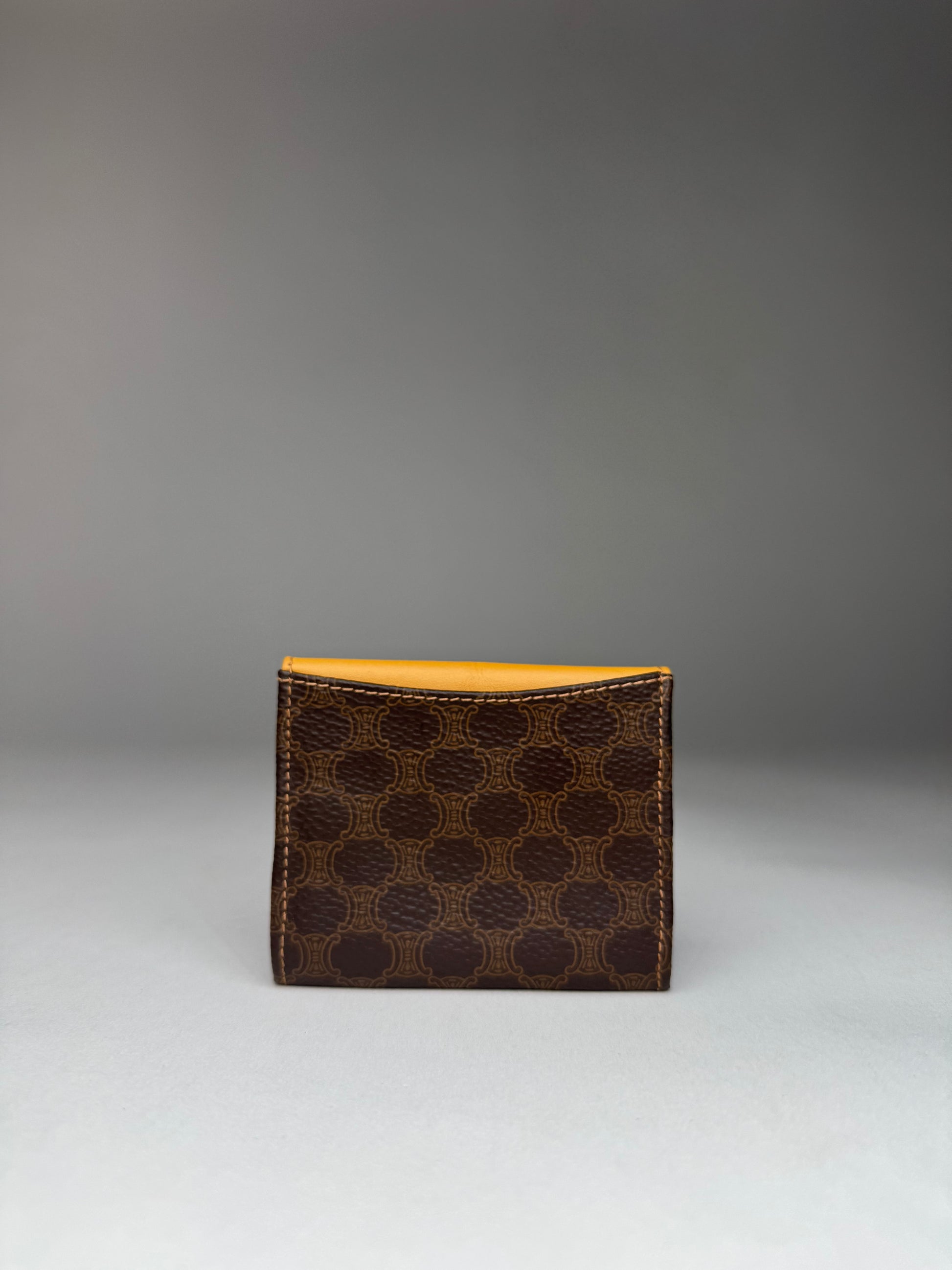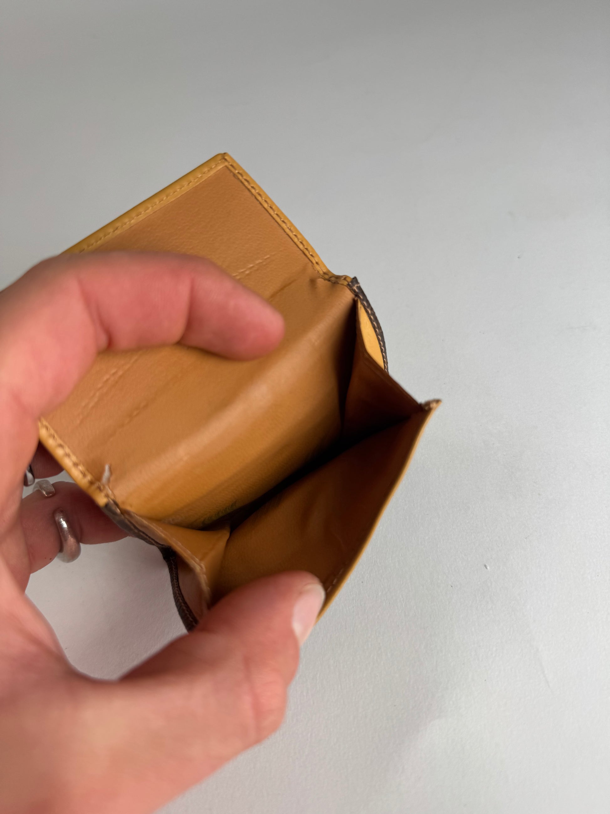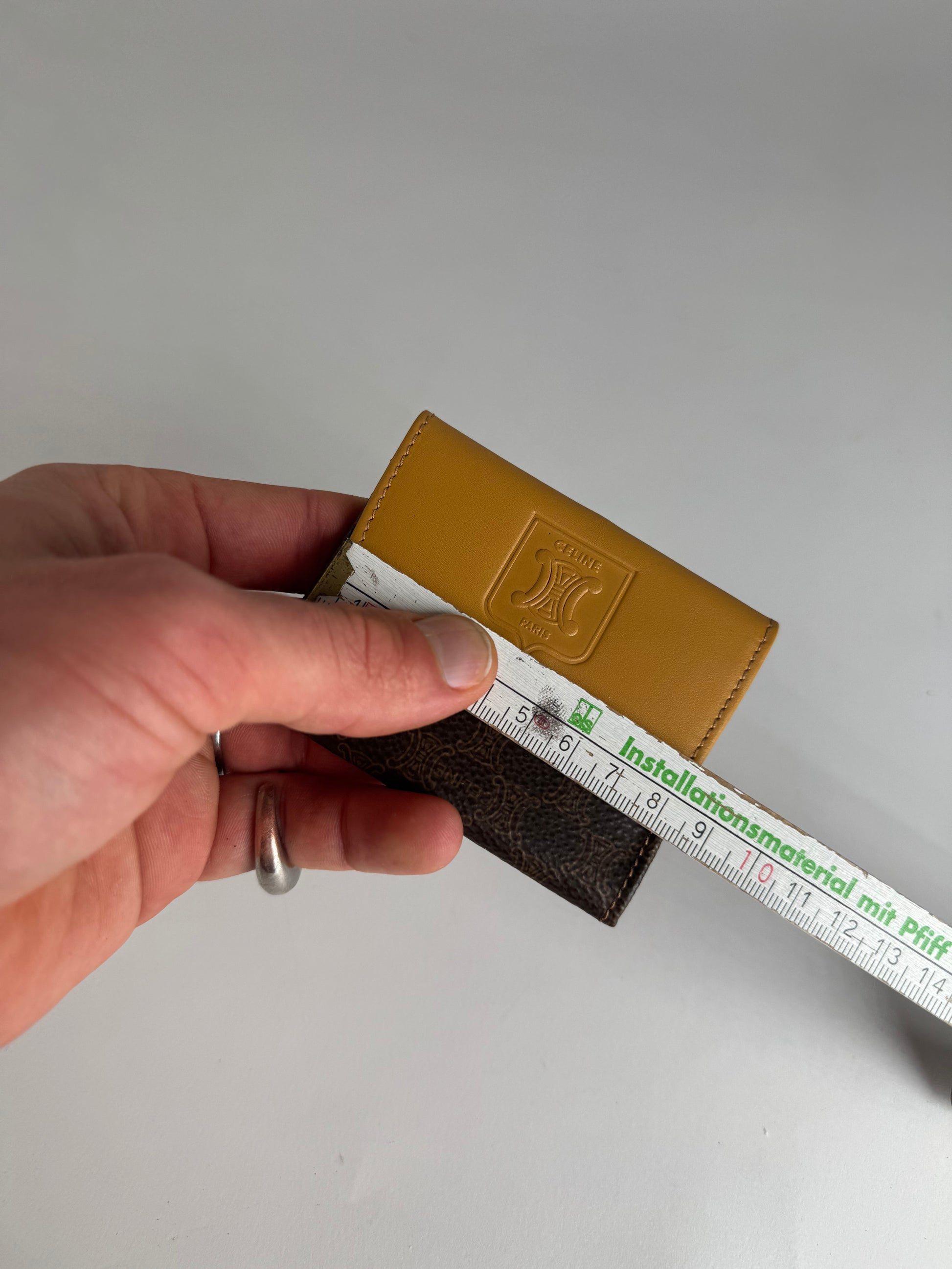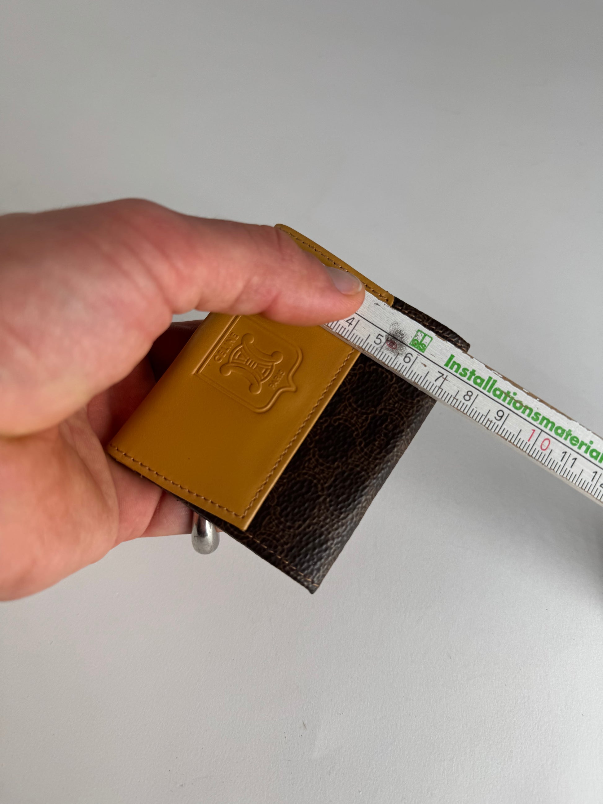 CELINE PARIS Vintage Card Holder. This vintage Celine Paris card holder is crafted from dark brown monogram leather with mustard-colored leather accents , creating a timeless and sophisticated contrast. The Celine logo is displayed on the front, and the gold-tone hardware adds a refined touch. Despite minor scratches, the card holder remains in very good condition . A stylish unisex accessory from 2016 .