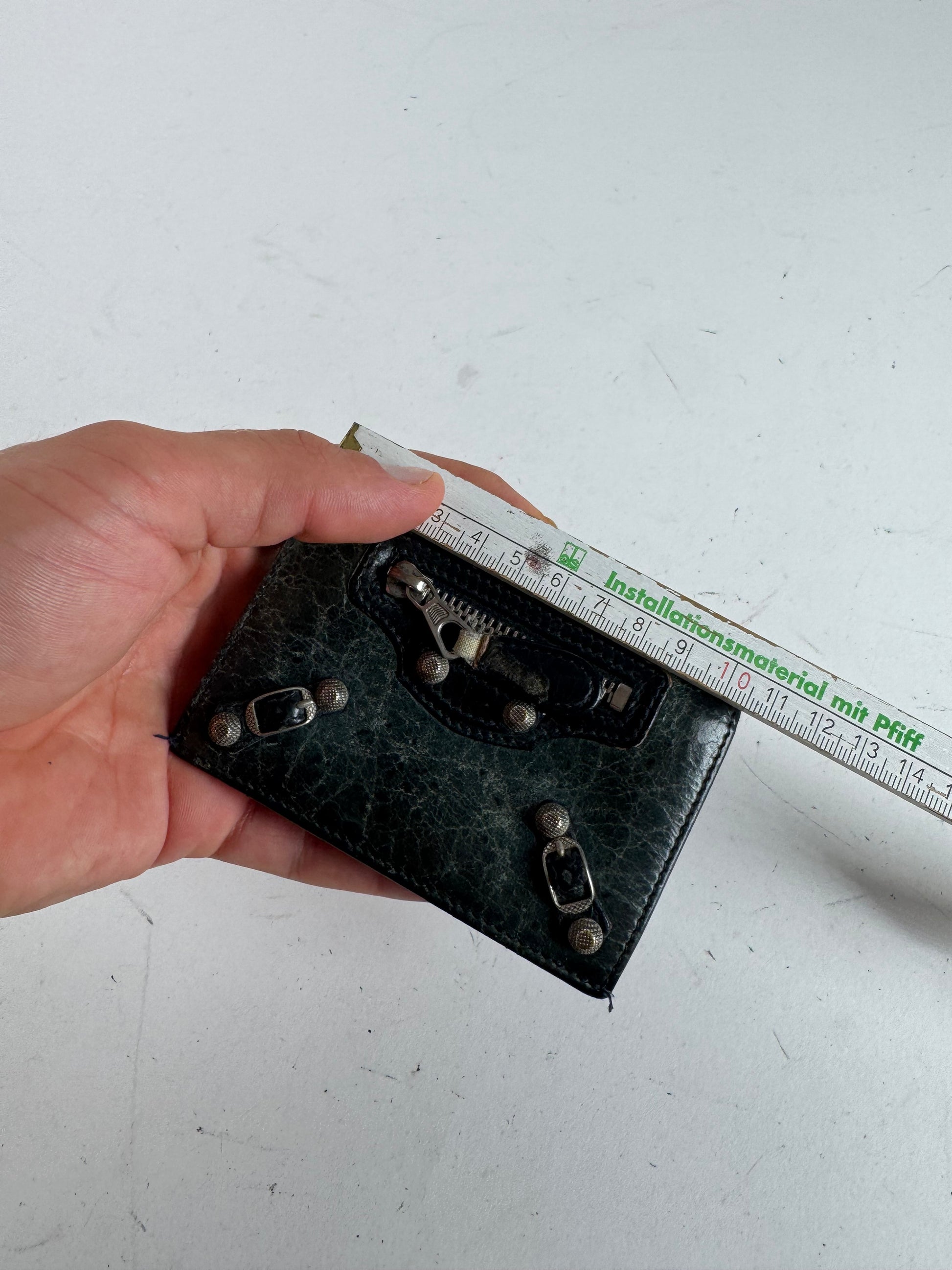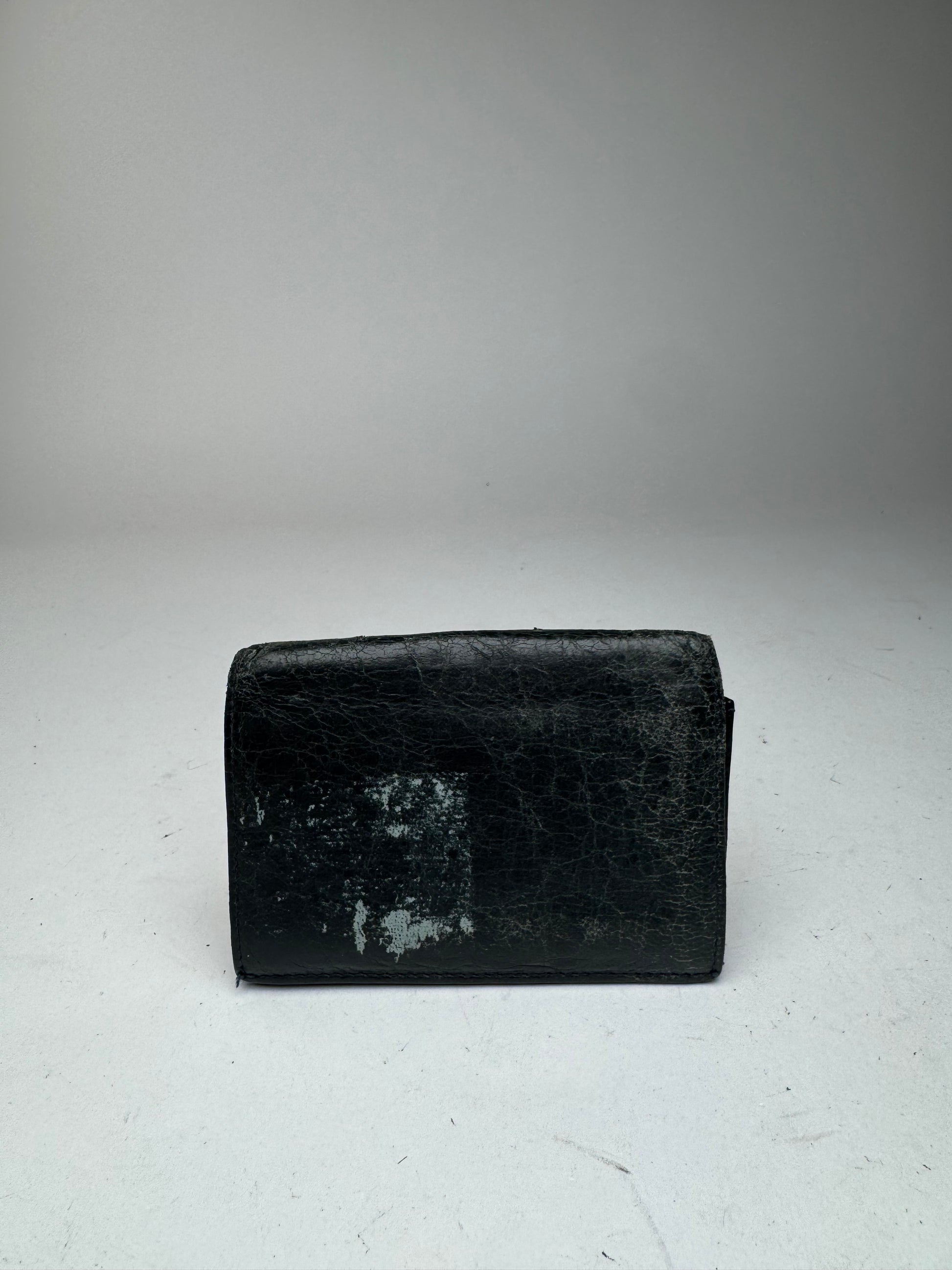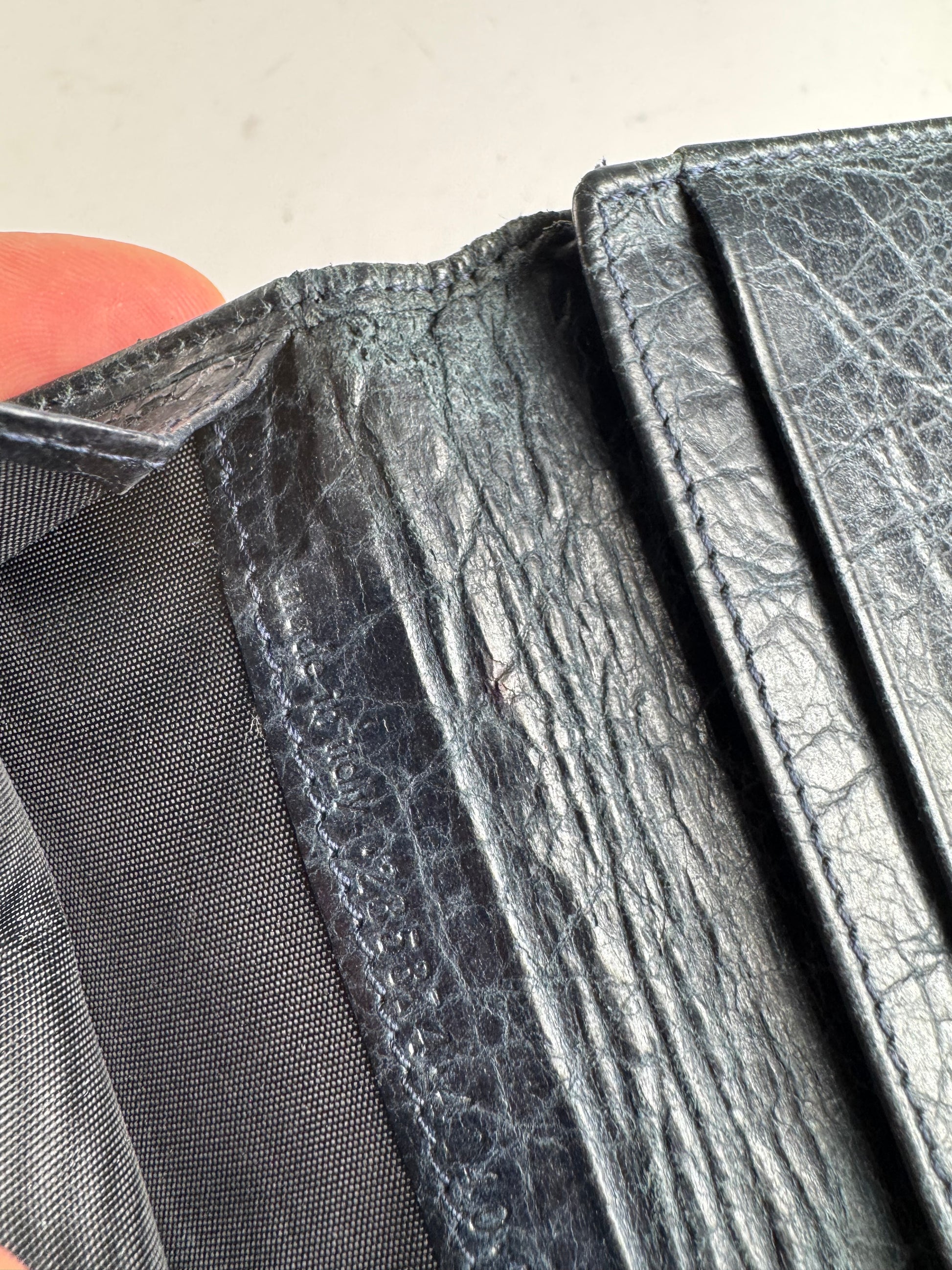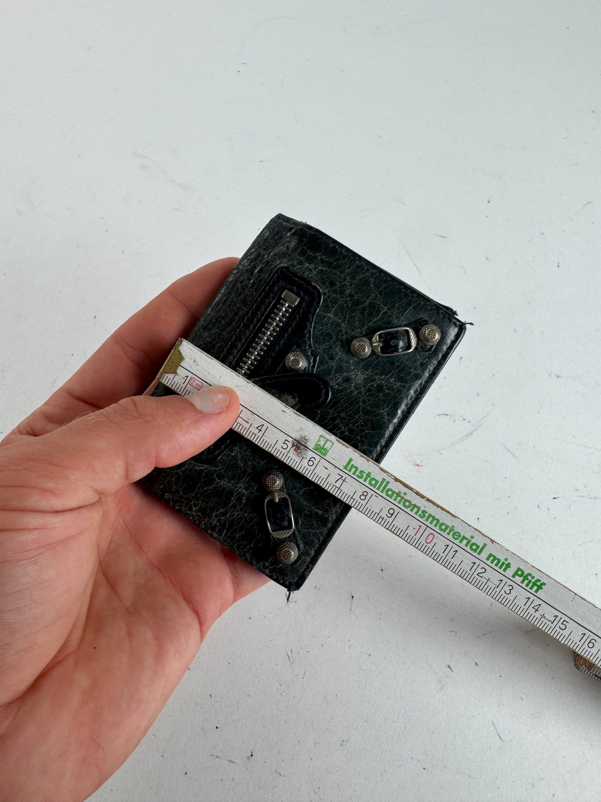 This stylish cardholder is finely crafted from black-blue leather in a stone-textured finish, designed in the style of the iconic Balenciaga City bag. First introduced in 2001 by Nicolas Ghesquière, the City bag became one of Balenciaga's most celebrated designs, instantly recognizable for its edgy hardware and urban aesthetic. The cardholder features silver-tone steel hardware and a foldable design.