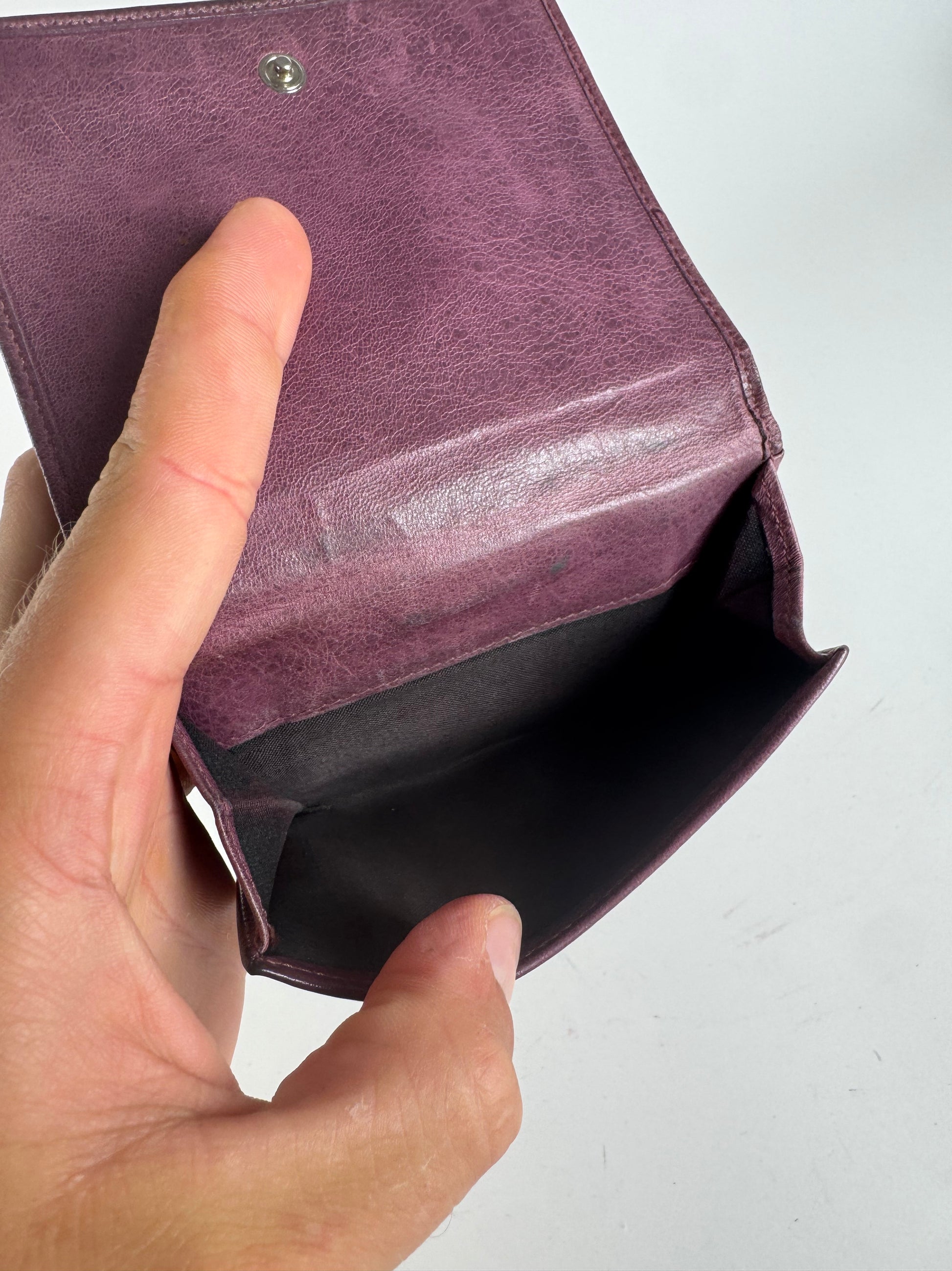 This vintage wallet is finely crafted of purple leather with silver-tone steel hardware, echoing the iconic City Bag design. Originally launched in 2001 under Nicolas Ghesquière, the City Bag became a modern classic, known for its soft leather, exposed hardware, and edgy yet practical style—elements subtly reflected in this wallet's structure. The design features dual snap-button closures and a compact, functional interior.