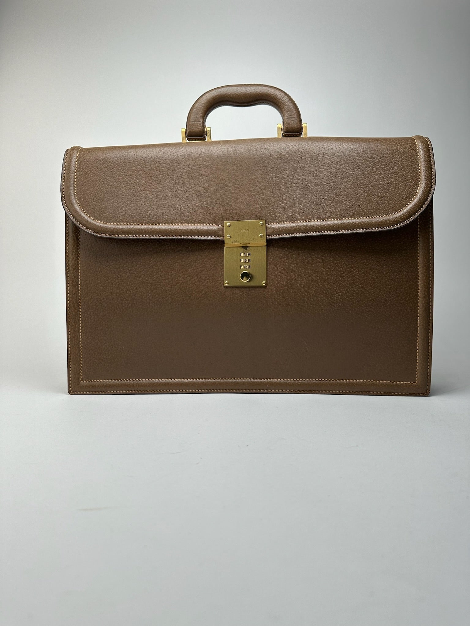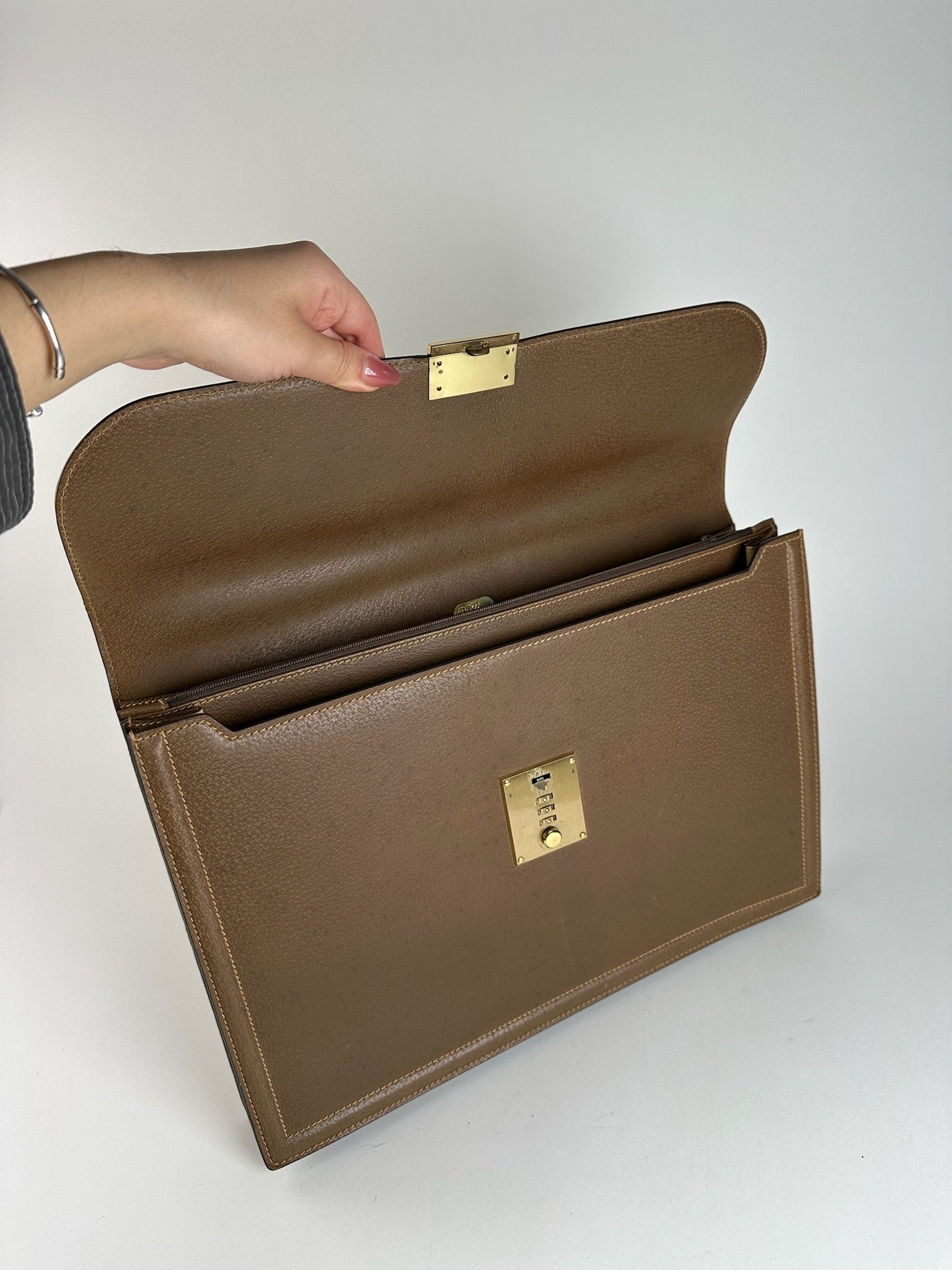 GUCCI Vintage Leather Travel Case. This chic travel case is finely crafted of brown leather. The accessory features a structured top handle, gold-tone steel hardware, and a combination lock closure. The interior includes approximately three compartments.