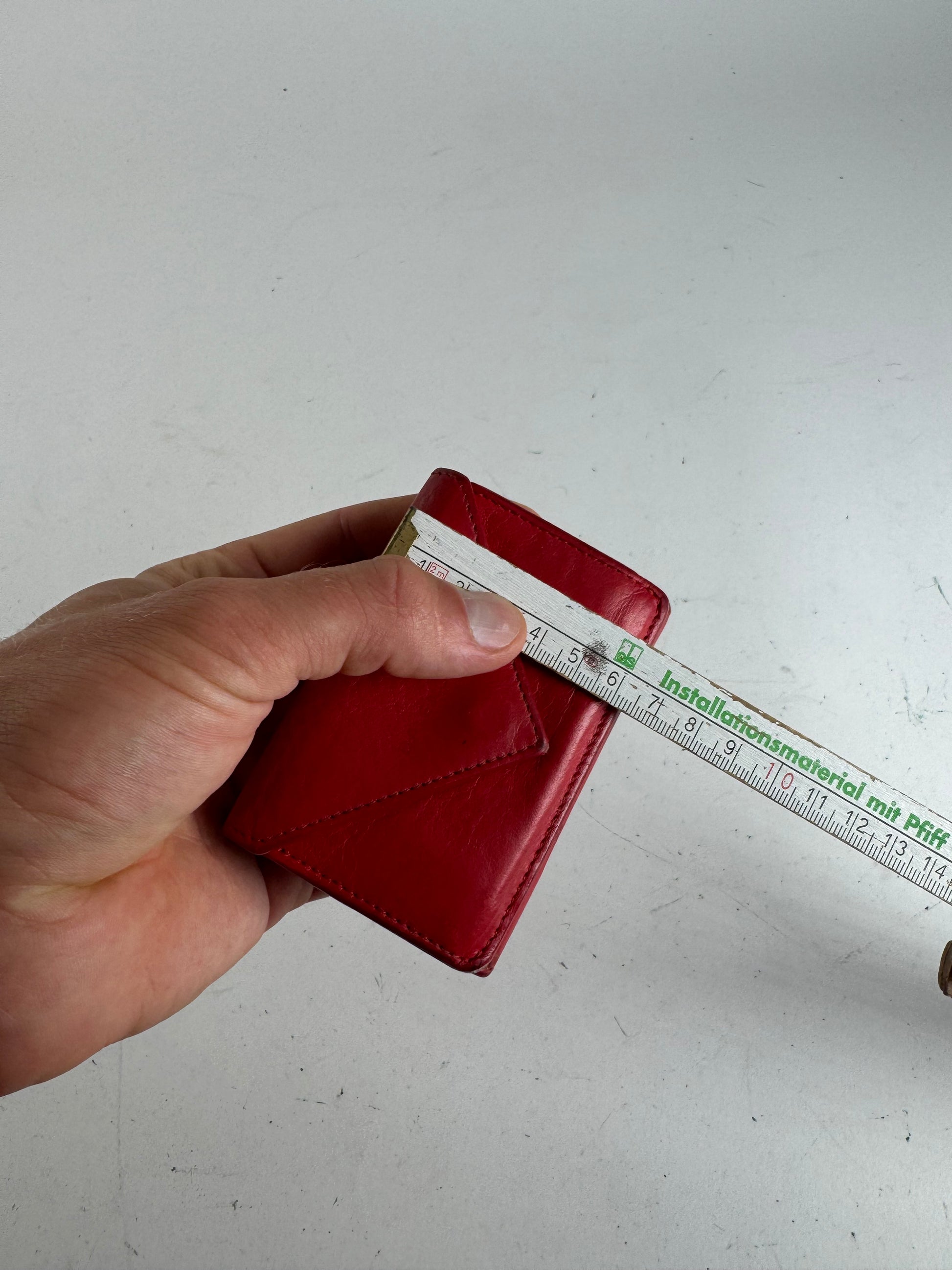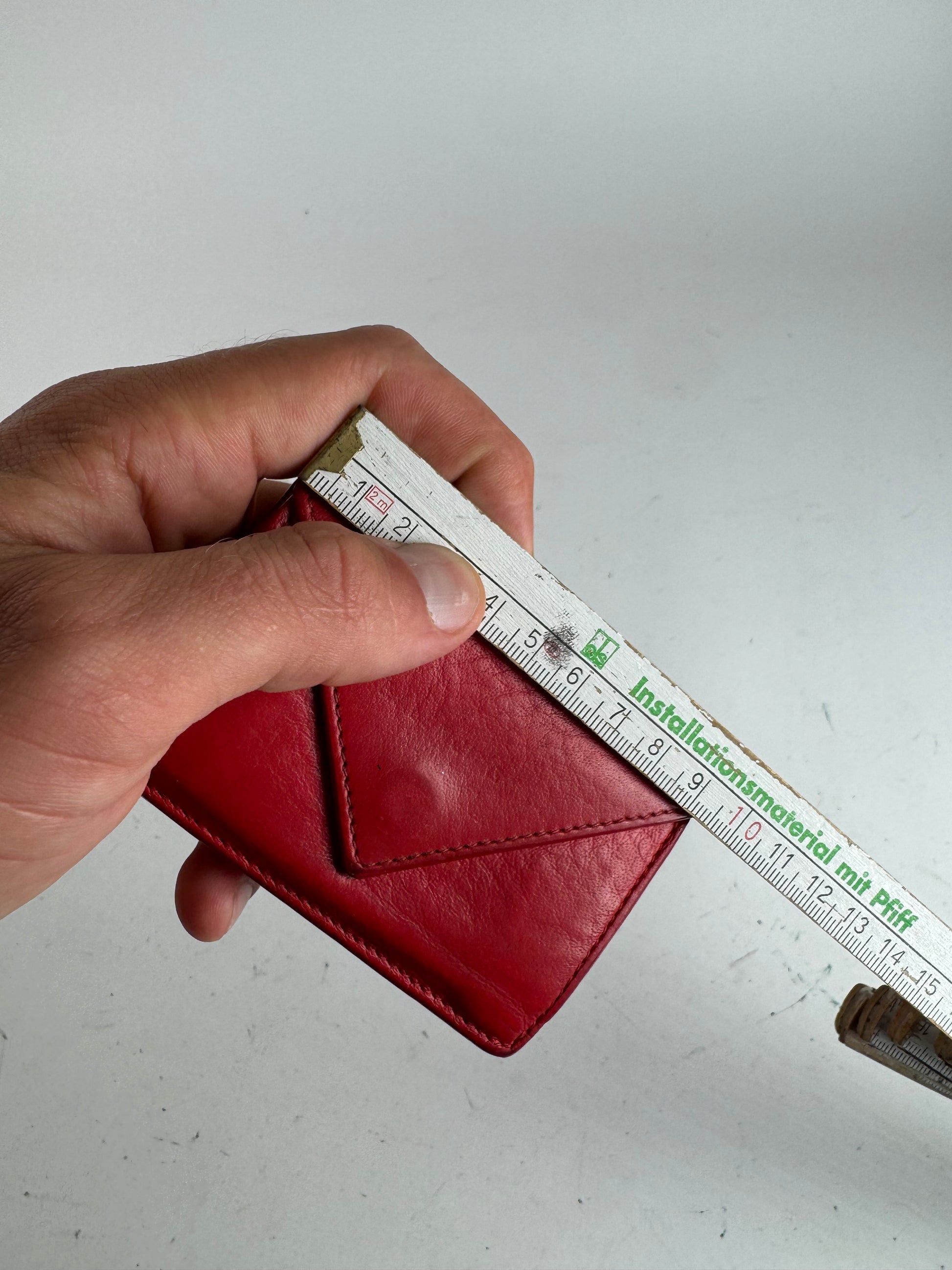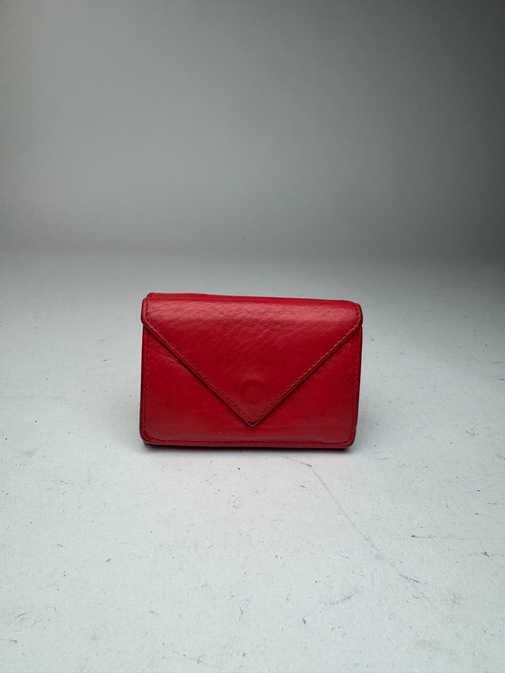 This elegant cardholder is finely crafted in red leather in the shape of an envelope and features a snap button closure on the exterior and interior. The design is foldable and provides multiple compartments for cards and essentials.