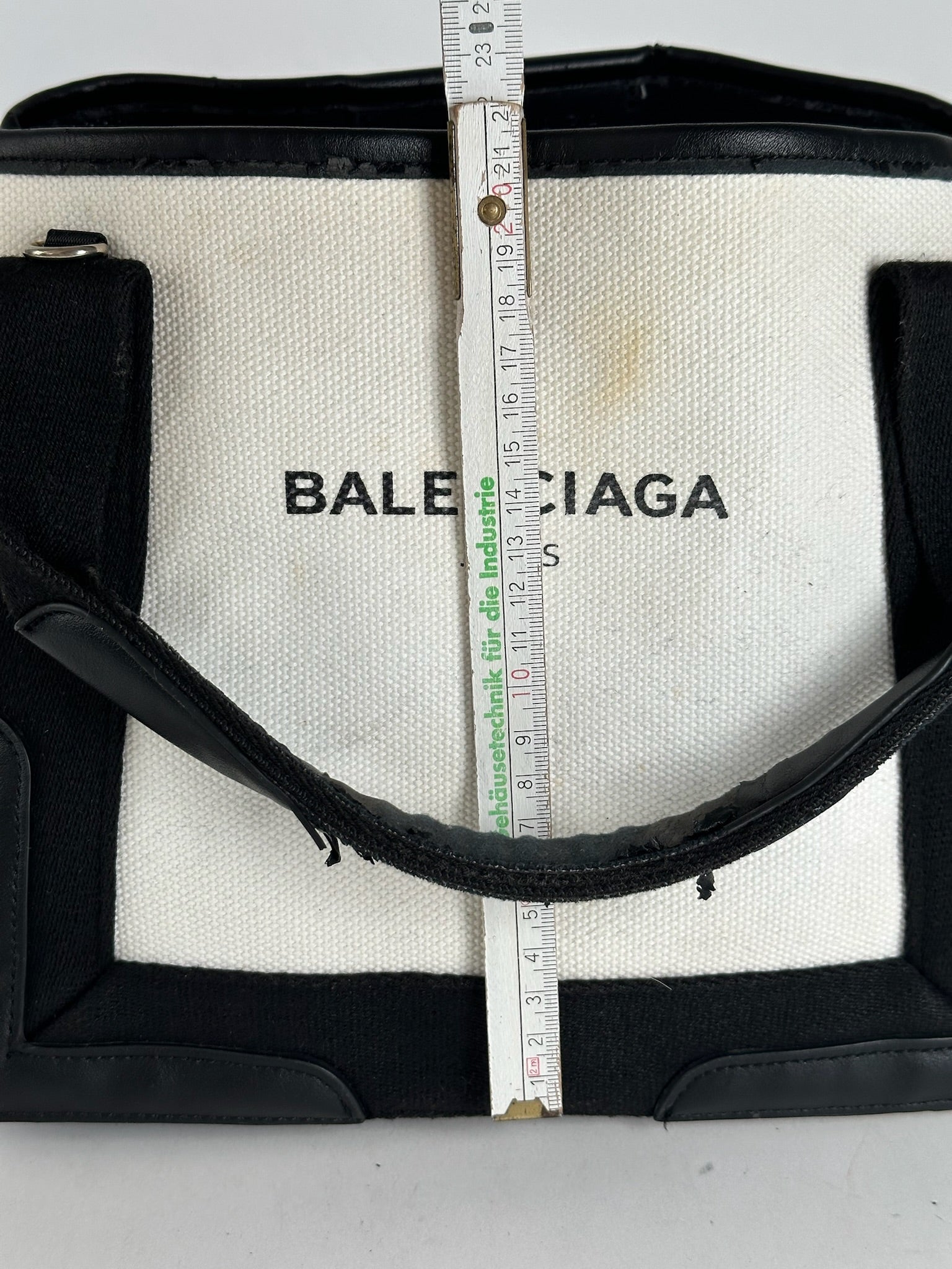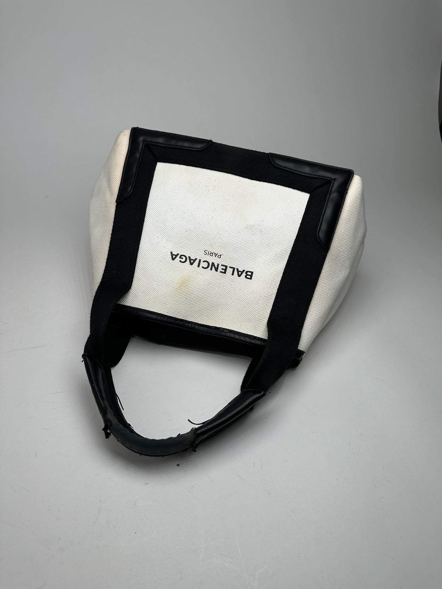 BALENCIAGA Cabas Canvas Tote. This chic handbag is finely crafted of white canvas with black canvas accents and black leather trim. The shoulder bag features a black leather handle and silver-tone hardware. The open top leads to a spacious interior.
