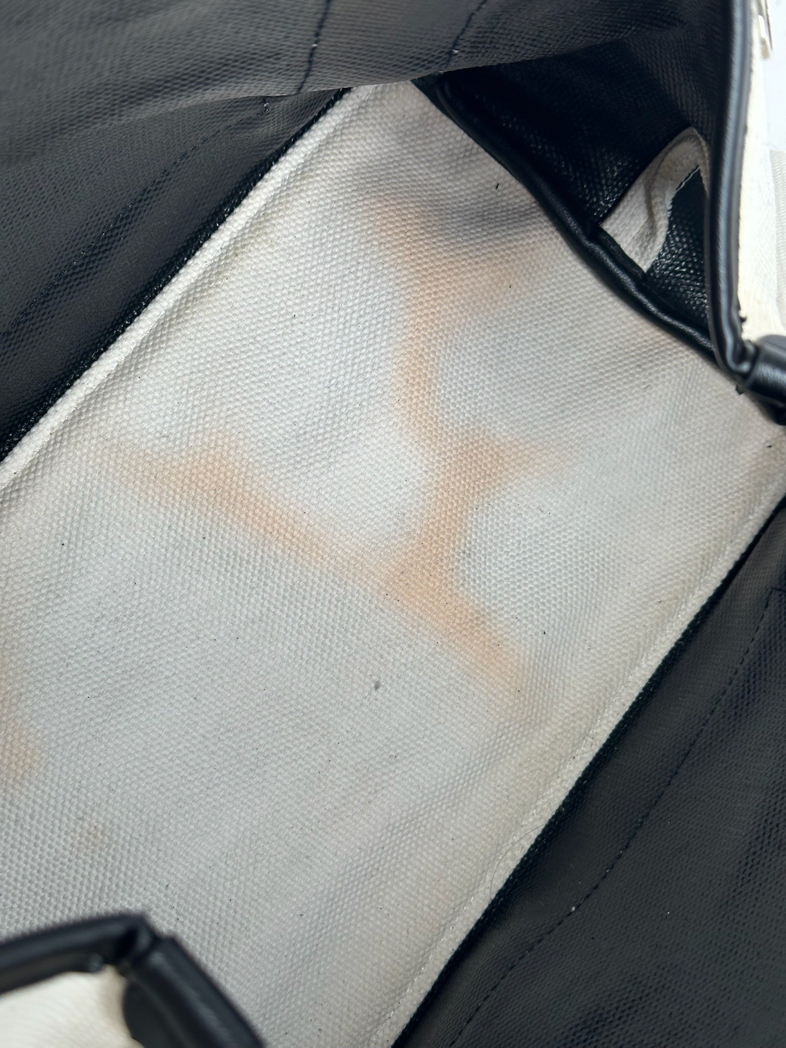 Condition Details: The exterior canvas is clean and beautiful in very good condition, but shows some marks. The leather handle shows signs of wear and partial damage. The hardware is bright with minor signs of use. The interior is in great shape with light wear.
