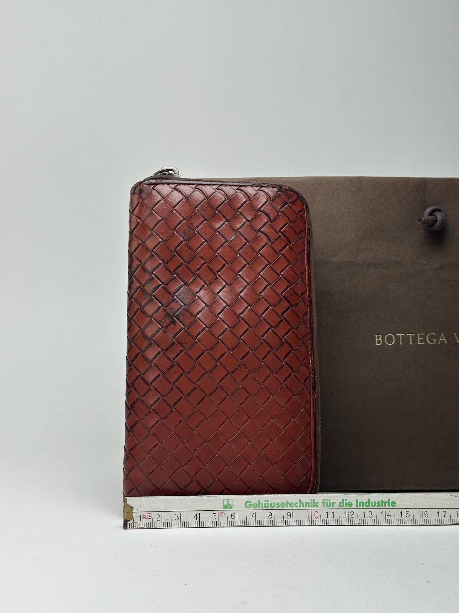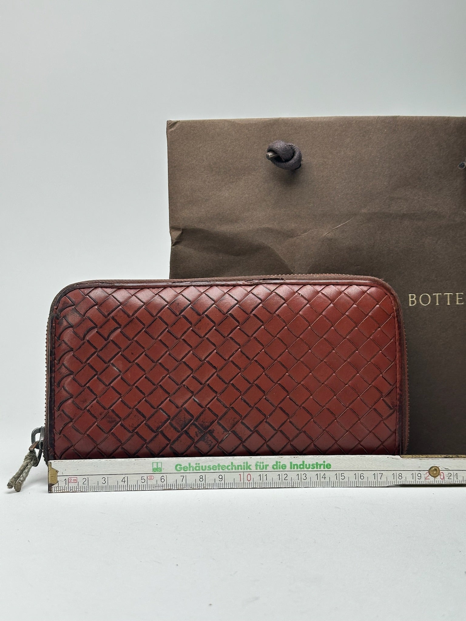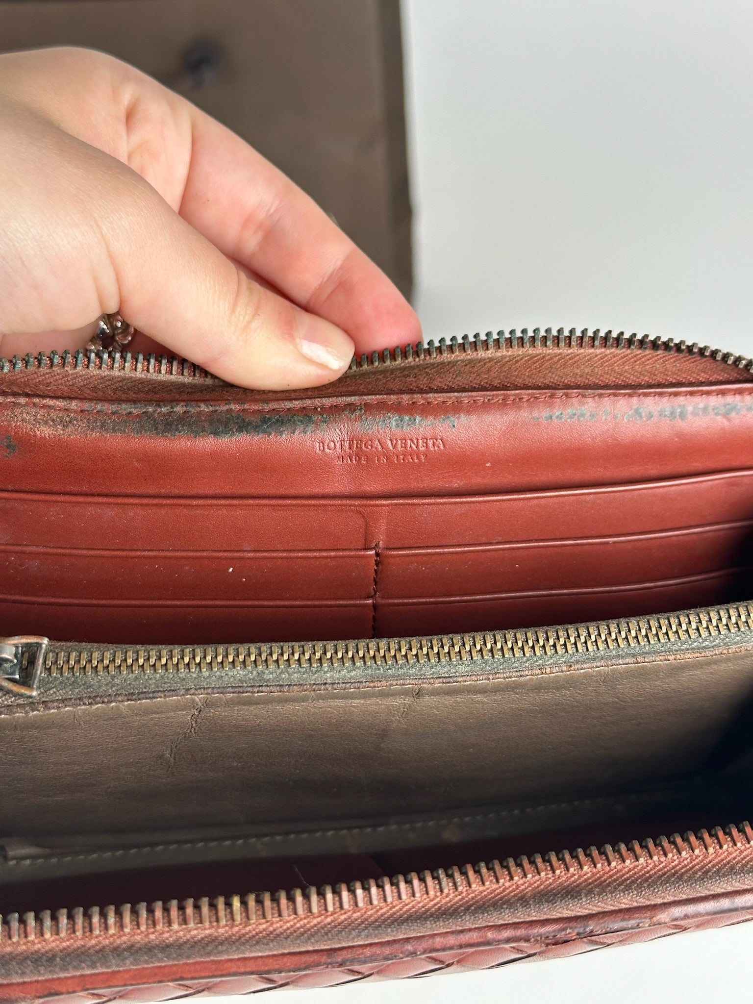 BOTTEGA VENETA Vintage Intrecciato Leather Wallet. This vintage wallet is finely crafted of red-brown leather in Bottega Veneta's iconic Intrecciato weave – a hand-woven leather technique that has become a symbol of the brand's craftsmanship and understated luxury. It features a top zipper closure.