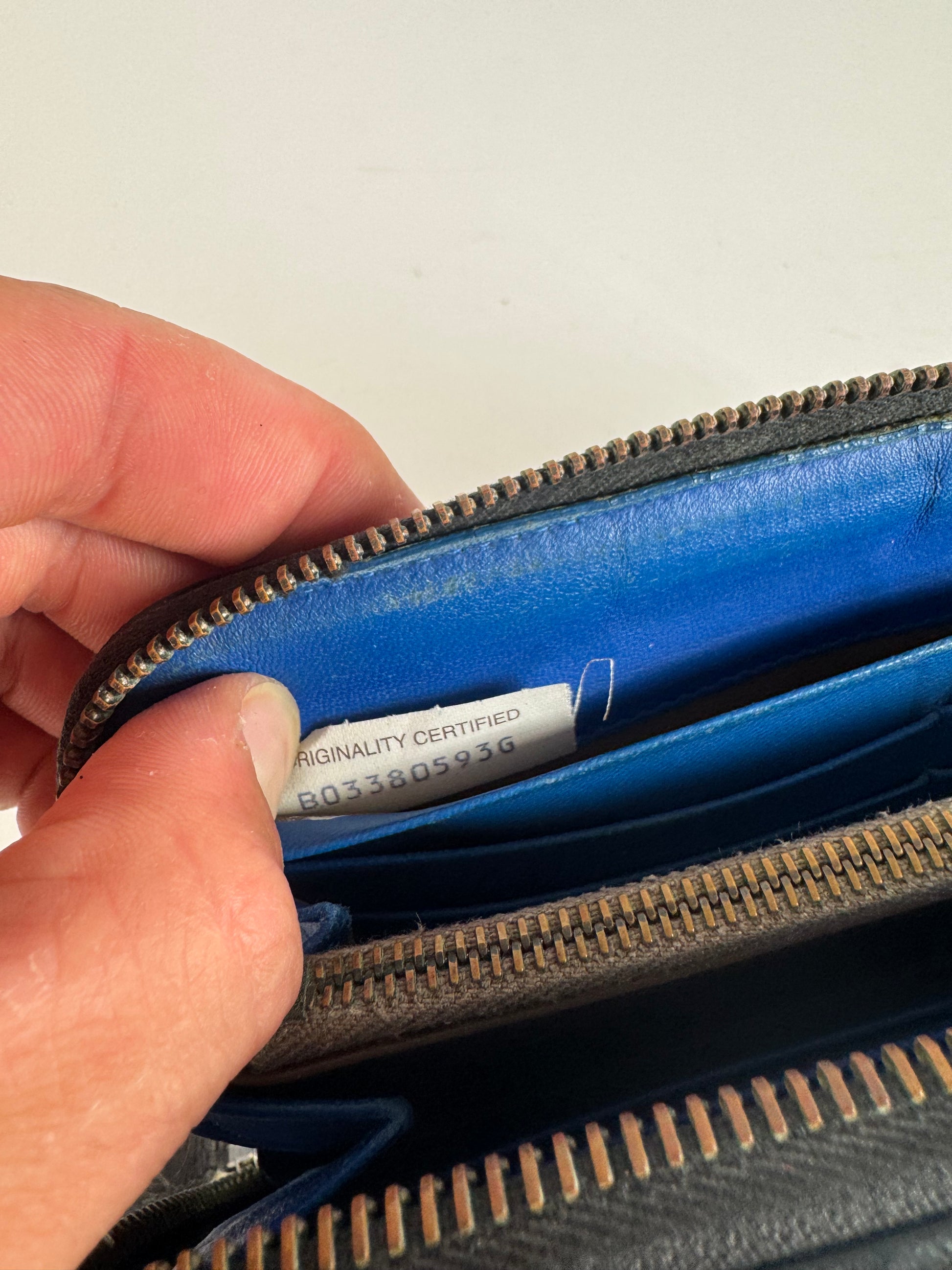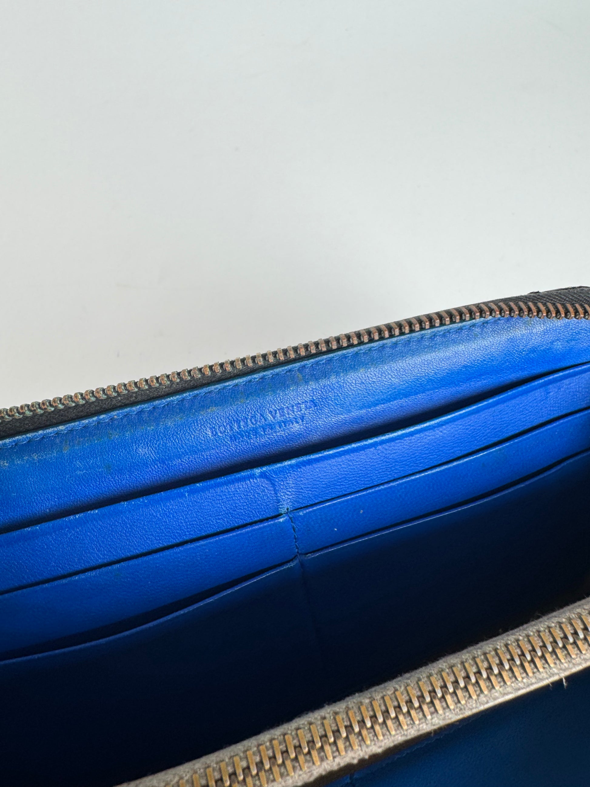 This elegant vintage wallet from Bottega Veneta is crafted in black leather featuring the brand's signature Intrecciato weave. Developed in the 1970s, the Intrecciato technique was born out of necessity—woven leather was used to reinforce thin hides and quickly became a symbol of quiet luxury and artisanal craftsmanship. The wallet features a top zipper with silver-toned steel hardware and opens to a smooth blue leather interior. Made in Italy. The authenticity code reads: B03380593G.
