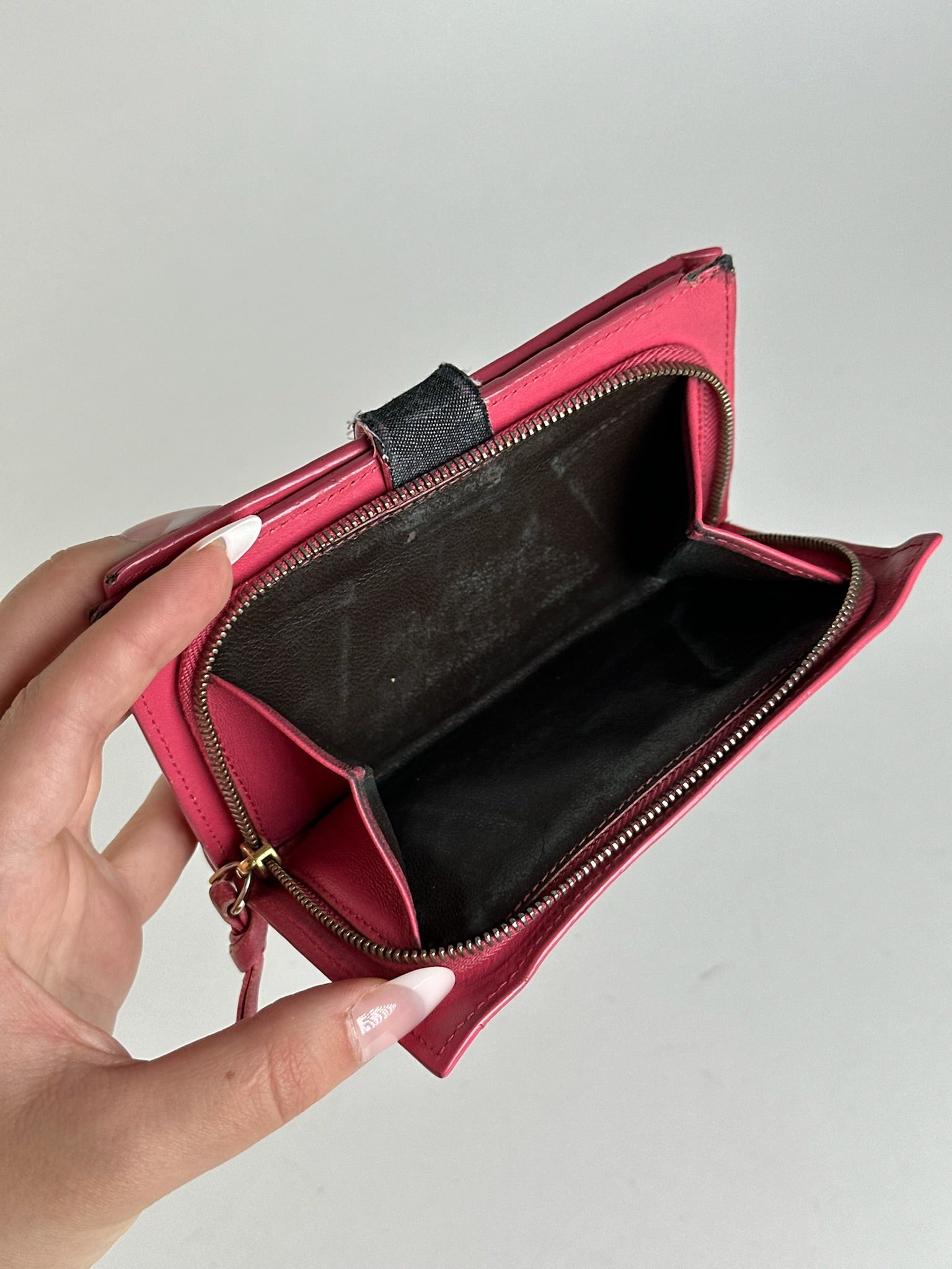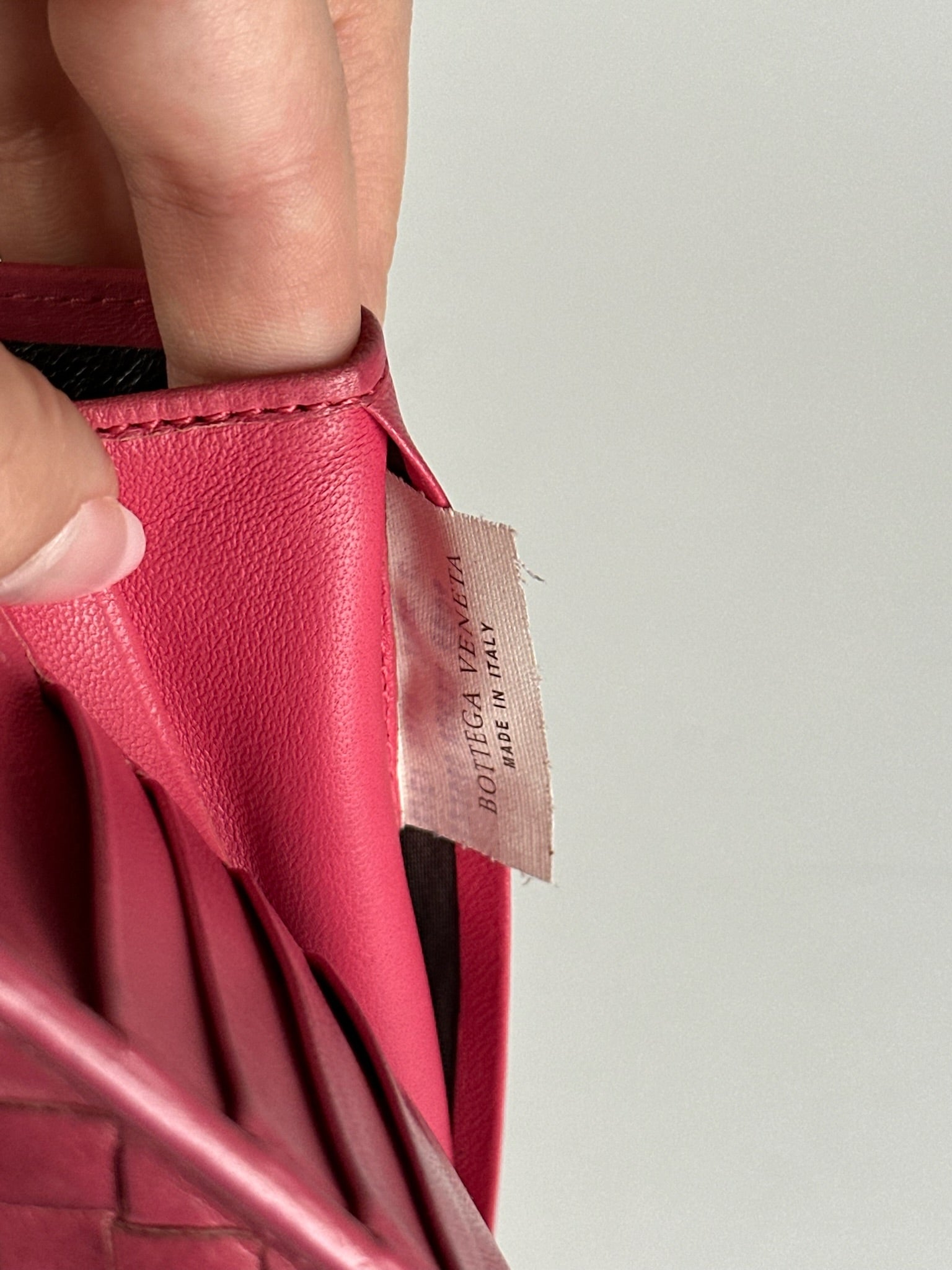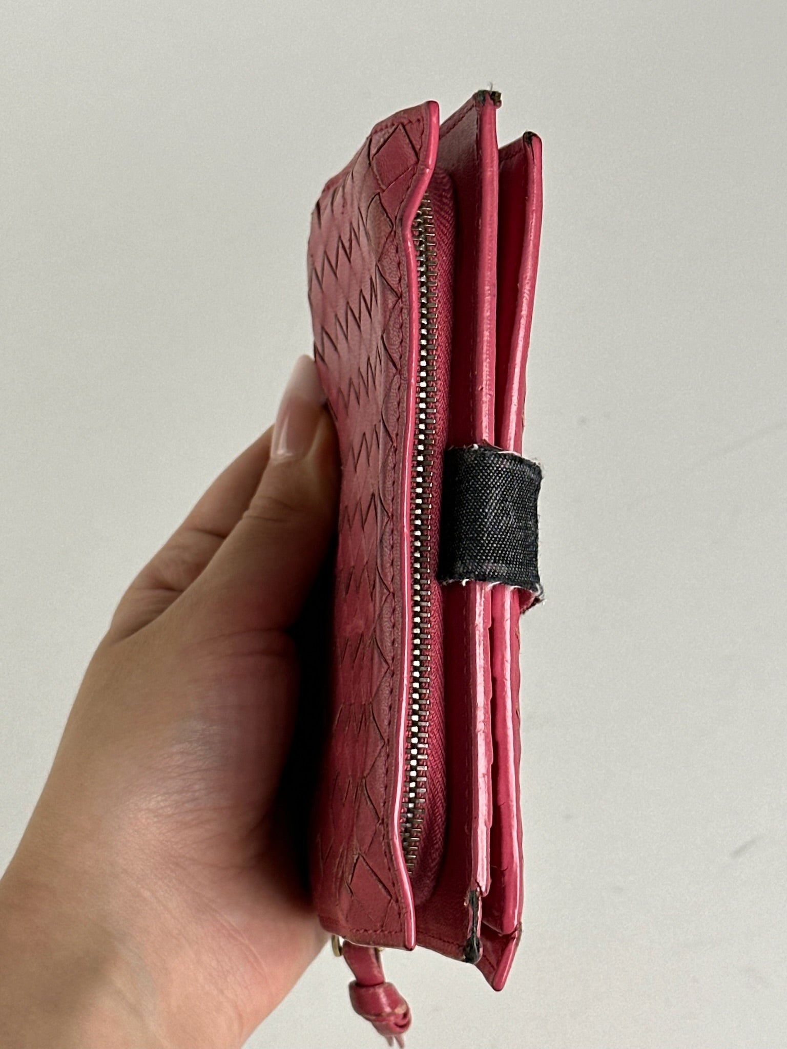BOTTEGA VENETA Vintage Red Intrecciato Leather Wallet. This refined vintage wallet is crafted from red leather in Bottega Veneta's signature Intrecciato weave, with dark brown leather accents and black canvas trimming. It features a snap button closure and a smooth red leather interior. Made in Italy, this elegant piece showcases the brand's artisanal precision and minimalist aesthetic. The Intrecciato technique was developed in the 1970s to reinforce delicate leather by weaving it, and has since become a hallmark of Bottega Veneta's identity—celebrating craftsmanship over conspicuous branding.