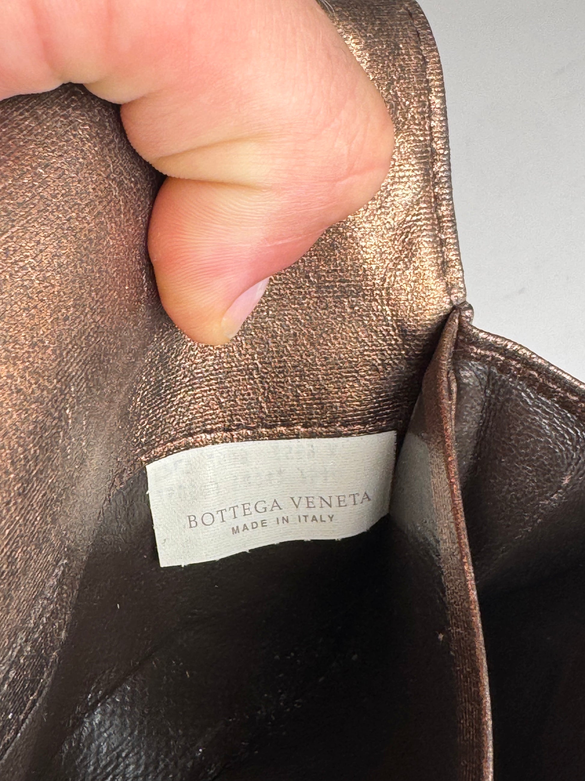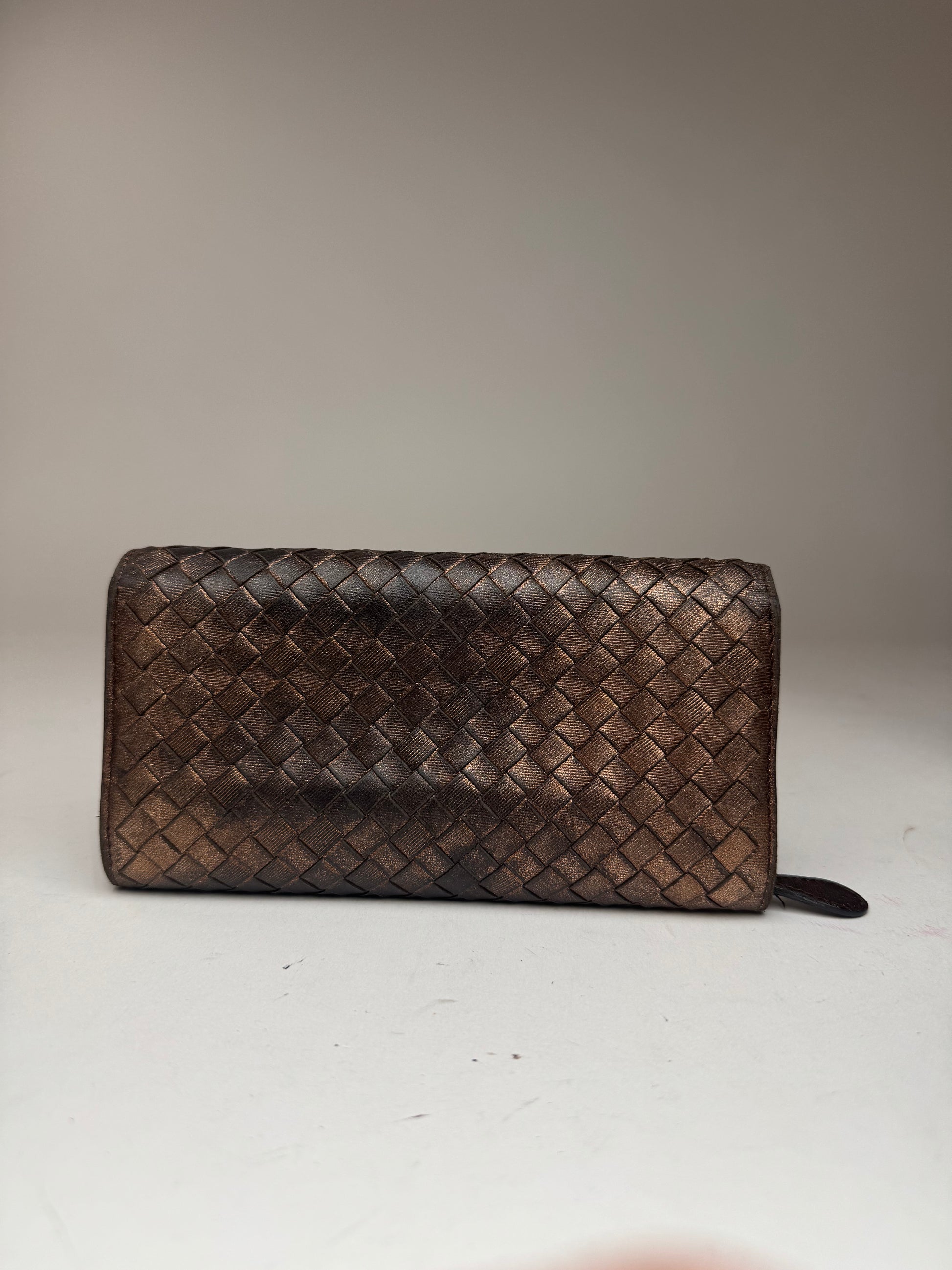 BOTTEGA VENETA Vintage Intrecciato Leather Wallet. This refined wallet is finely crafted of bronze-toned leather in Bottega Veneta's iconic Intrecciato weave. It features a snap button closure and bronze-tone steel hardware.