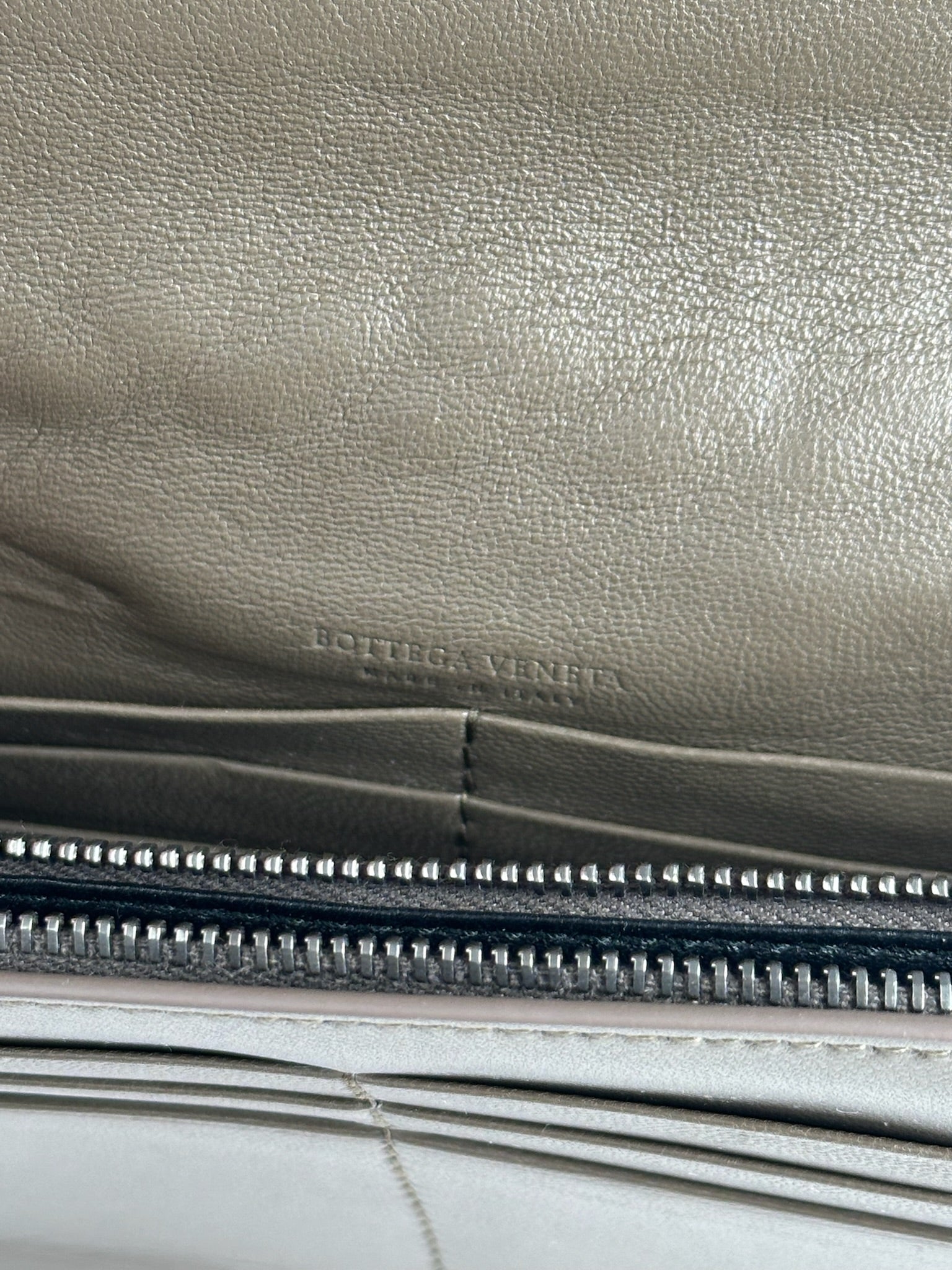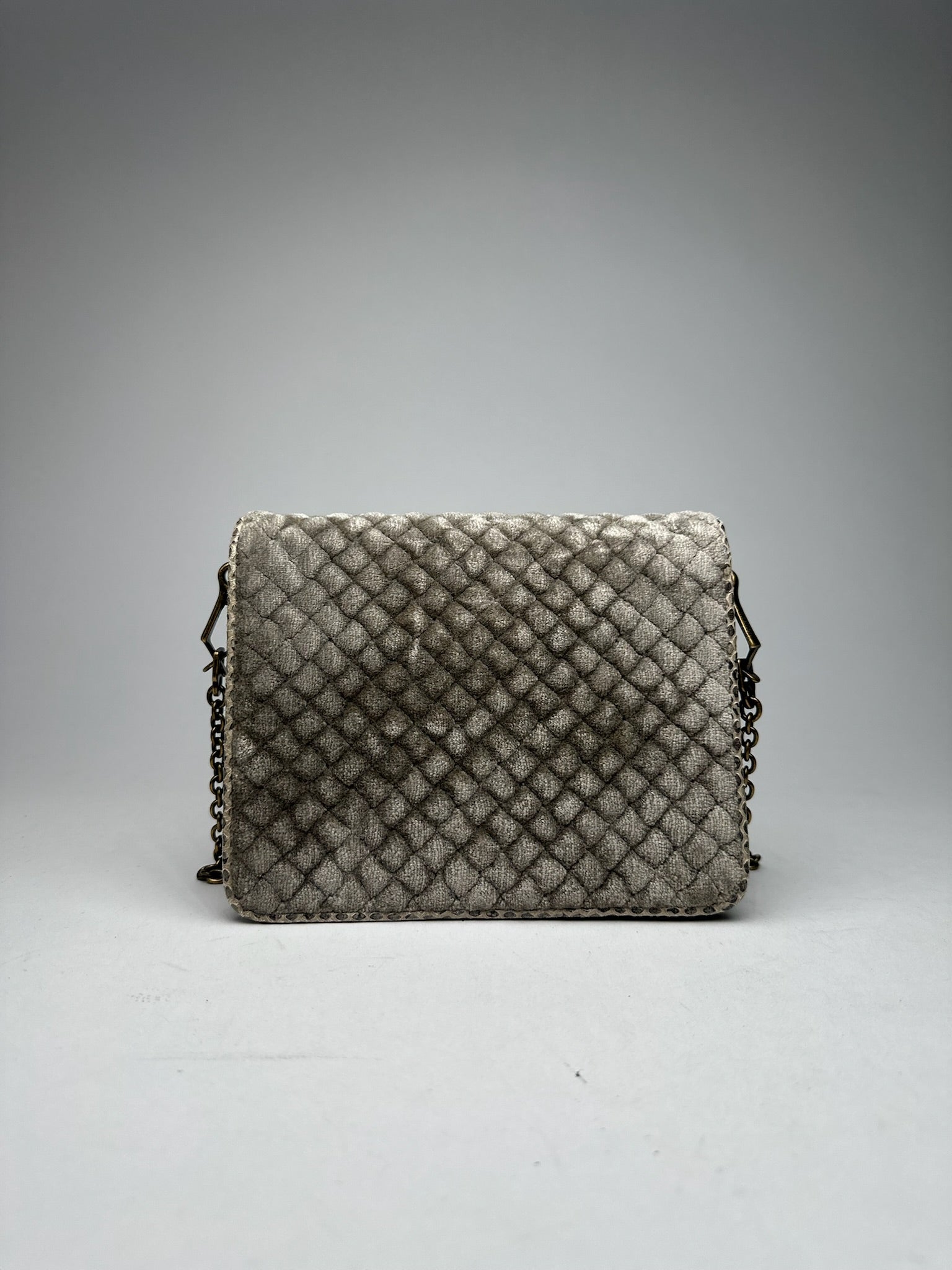 BOTTEGA VENETA Vintage Wool Chain Shoulder Bag. This chic shoulder bag is finely crafted of anthracite wool and features a chain strap in anthracite and bronze tones. A butterfly emblem adorns the front. The bag has a snap button closure and opens to an interior with multiple compartments, lined in taupe-grey leather.