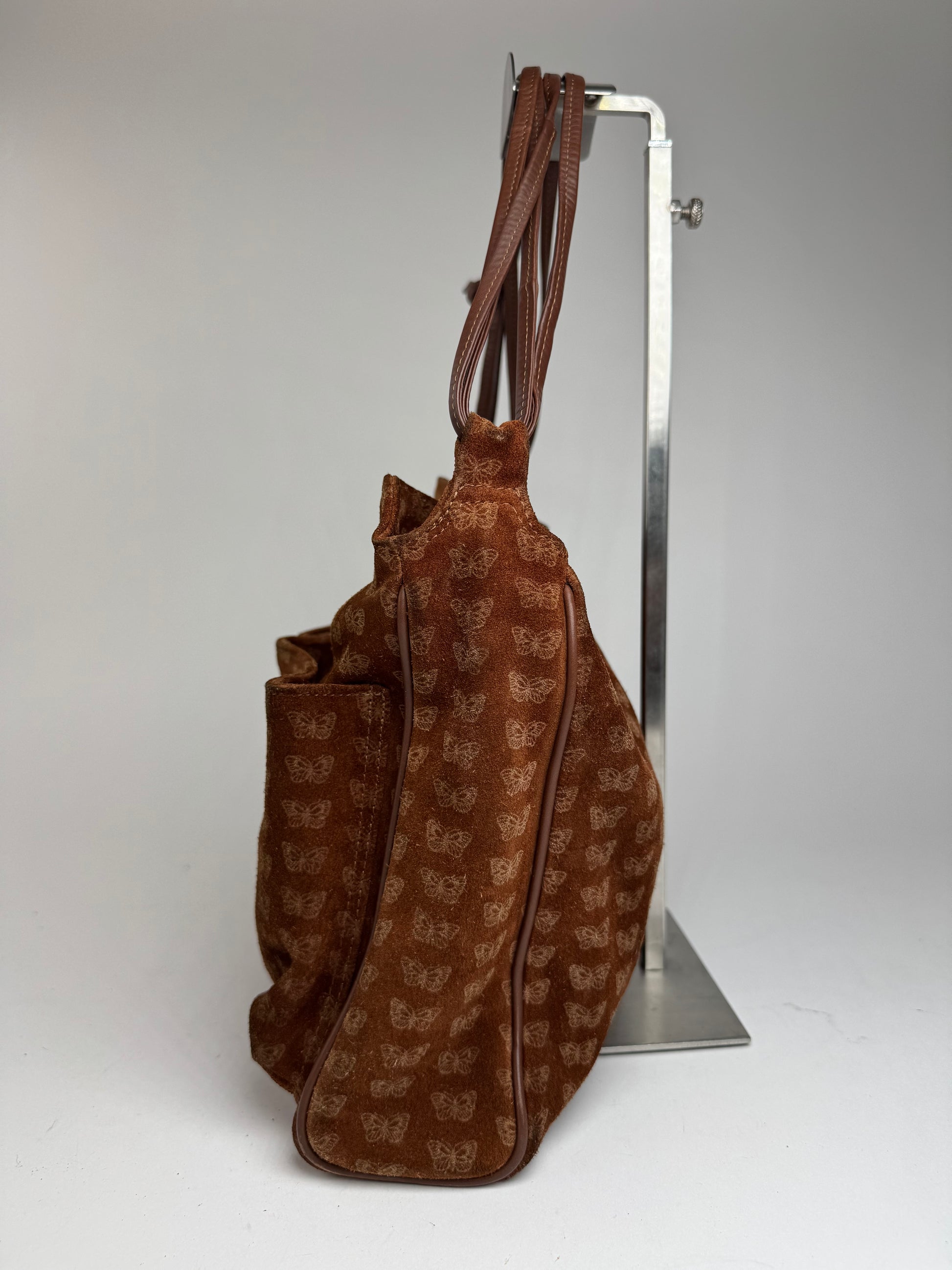 BOTTEGA VENETA Vintage Butterfly Suede Tote. This unique tote is crafted from brown suede and features a beige butterfly monogram motif throughout. The bag includes brown leather handles and a top zipper closure.