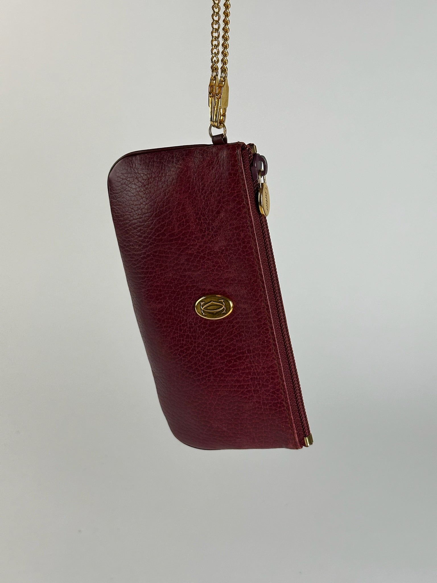 CARTIER vintage baguette bag. This elegant handbag is finely crafted of burgundy grained leather. The bag features a gold-tone steel chain strap and a polished Cartier logo plaque on the front. The iconic interlocking Cartier logo, first introduced in the early 20th century, reflects the brand's heritage of timeless luxury and refined design. The flap opens to a burgundy canvas interior with the Cartier logo monogram throughout.