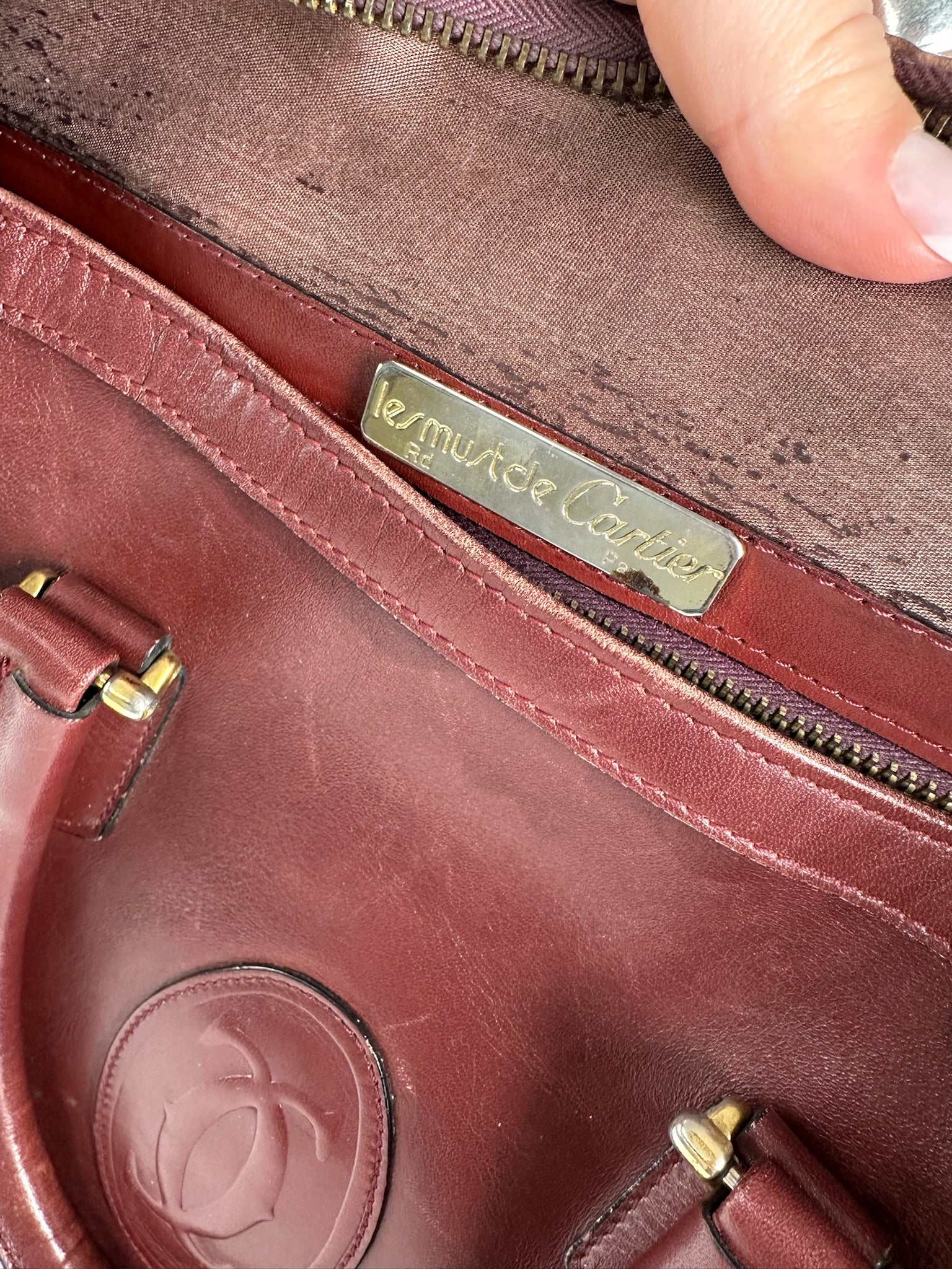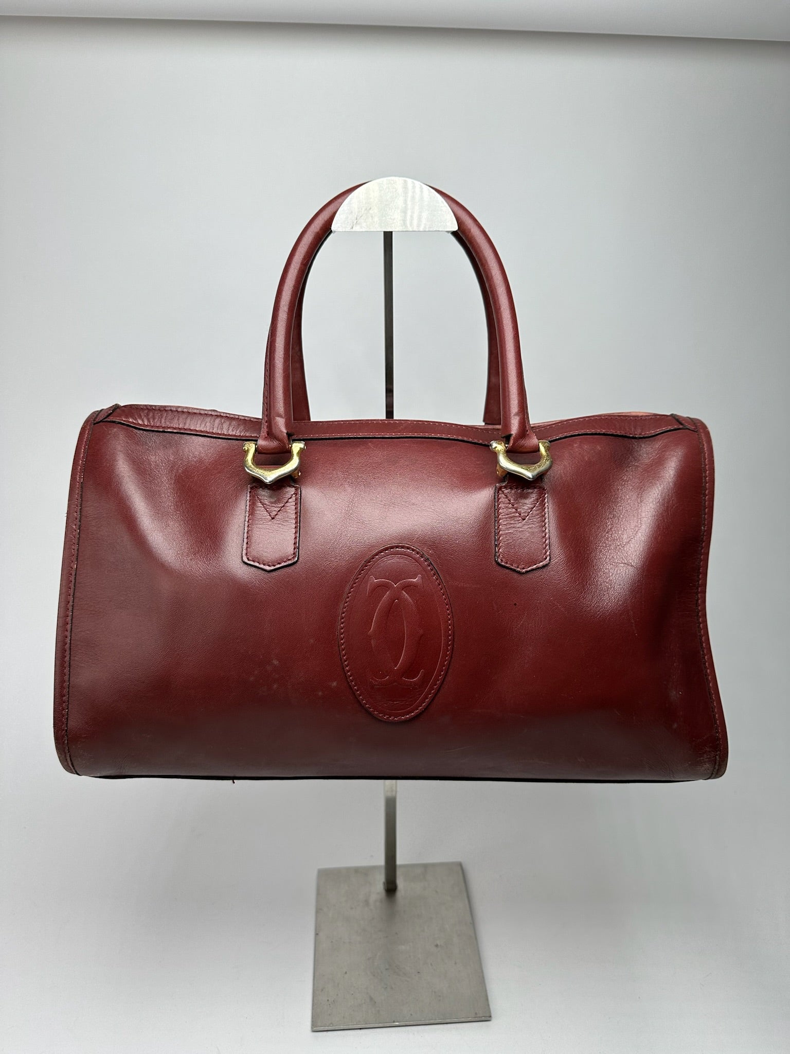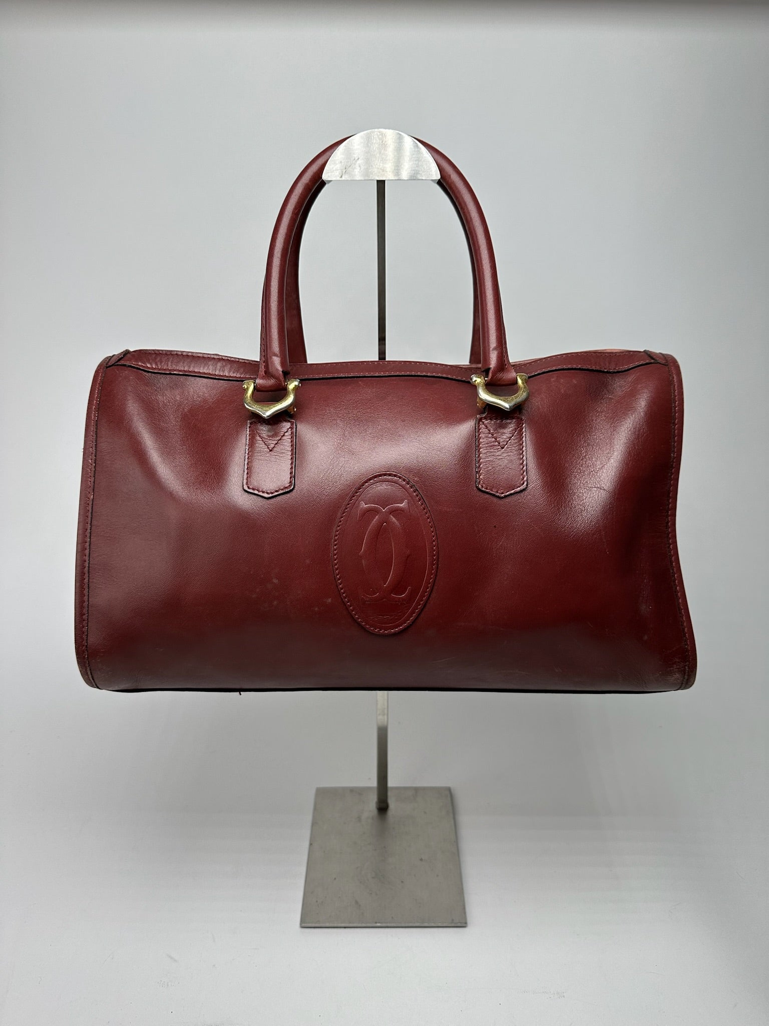 CARTIER Vintage Leather Travel Bag. This chic travel bag is finely crafted of burgundy leather. It features two top handles, gold-tone steel hardware, and an embossed Cartier logo on the front.