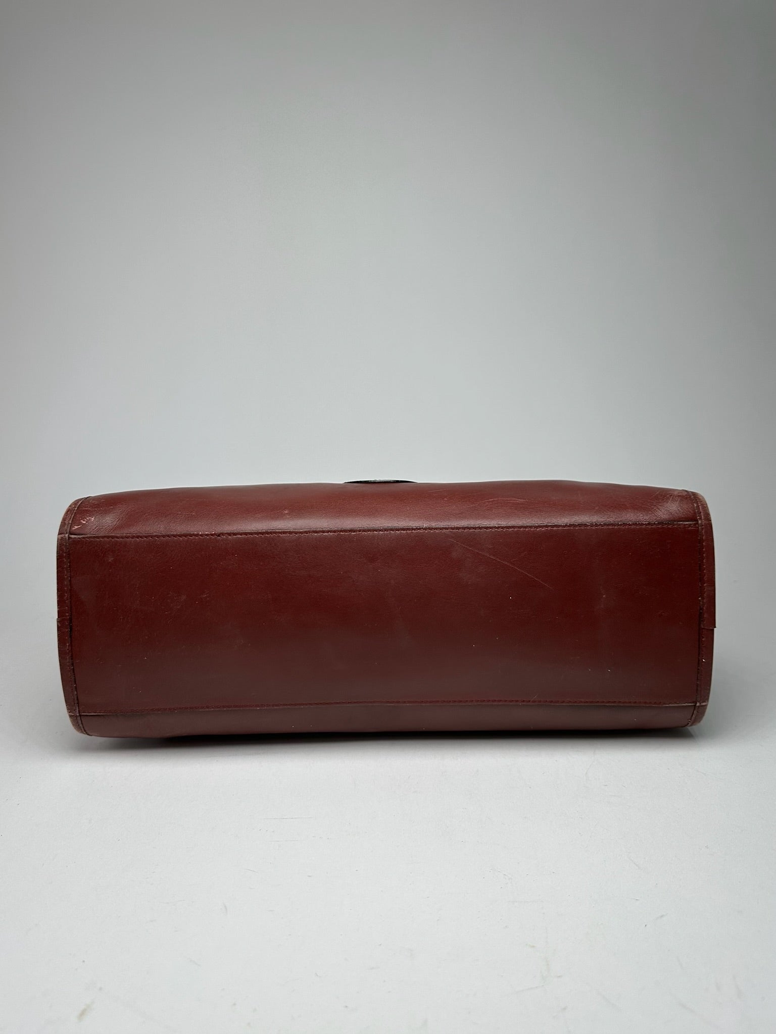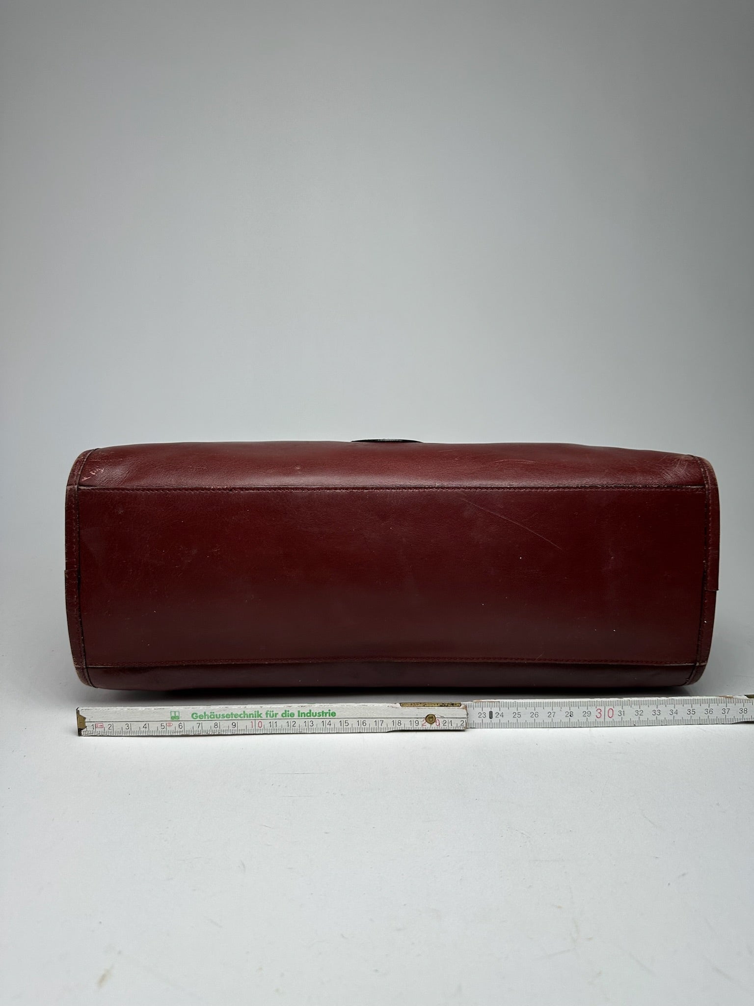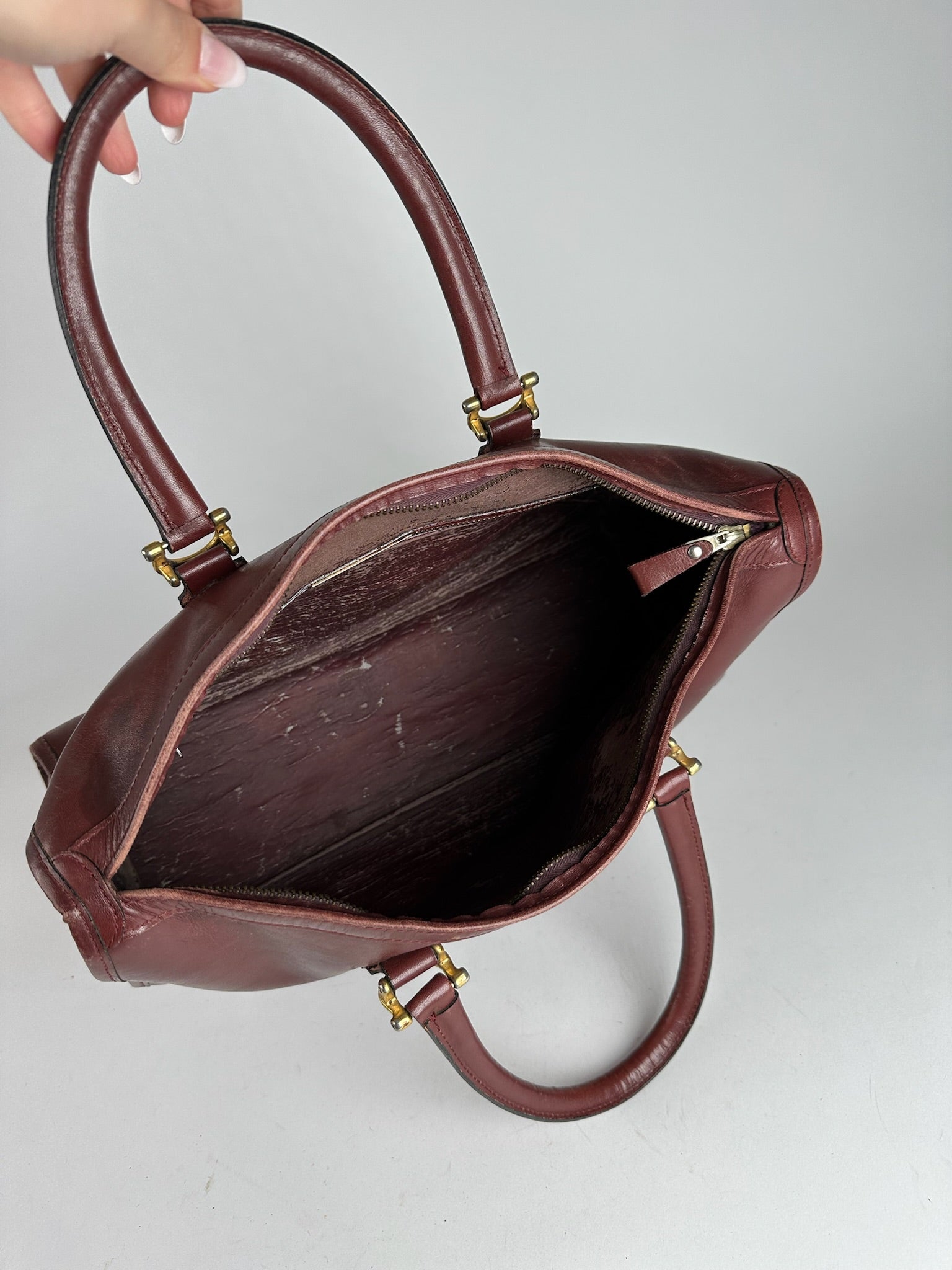 CARTIER Vintage Leather Travel Bag. This chic travel bag is finely crafted of burgundy leather. It features two top handles, gold-tone steel hardware, and an embossed Cartier logo on the front.