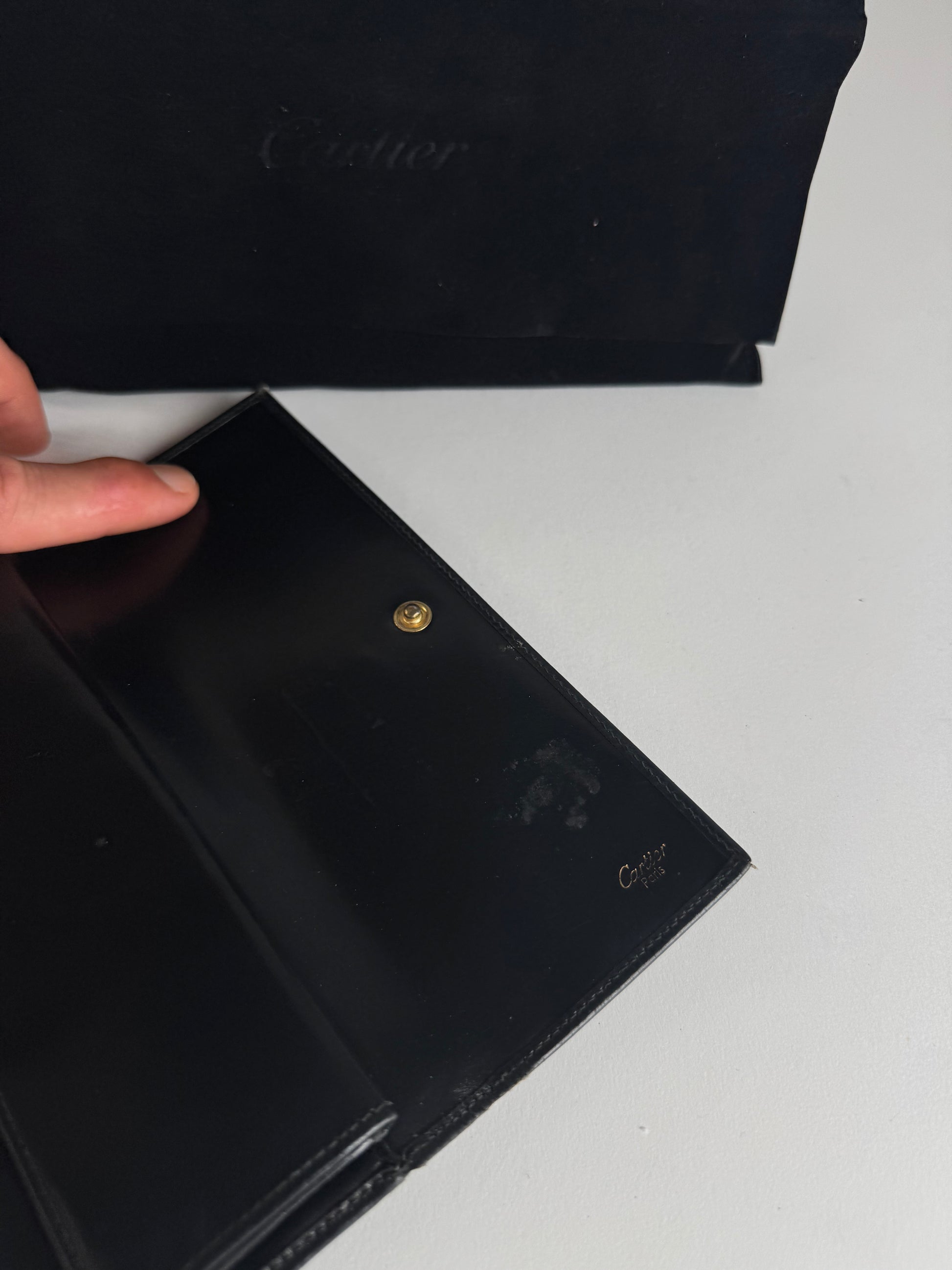 CARTIER Vintage Panthere Wallet. This vintage Cartier Panthère wallet is crafted from black patent leather , exuding a sleek and sophisticated look. The gold-tone steel hardware adds a luxurious touch. Despite minor scratches and scuffs, the wallet remains in very good condition . The sale includes the Cartier box and dust bag .
