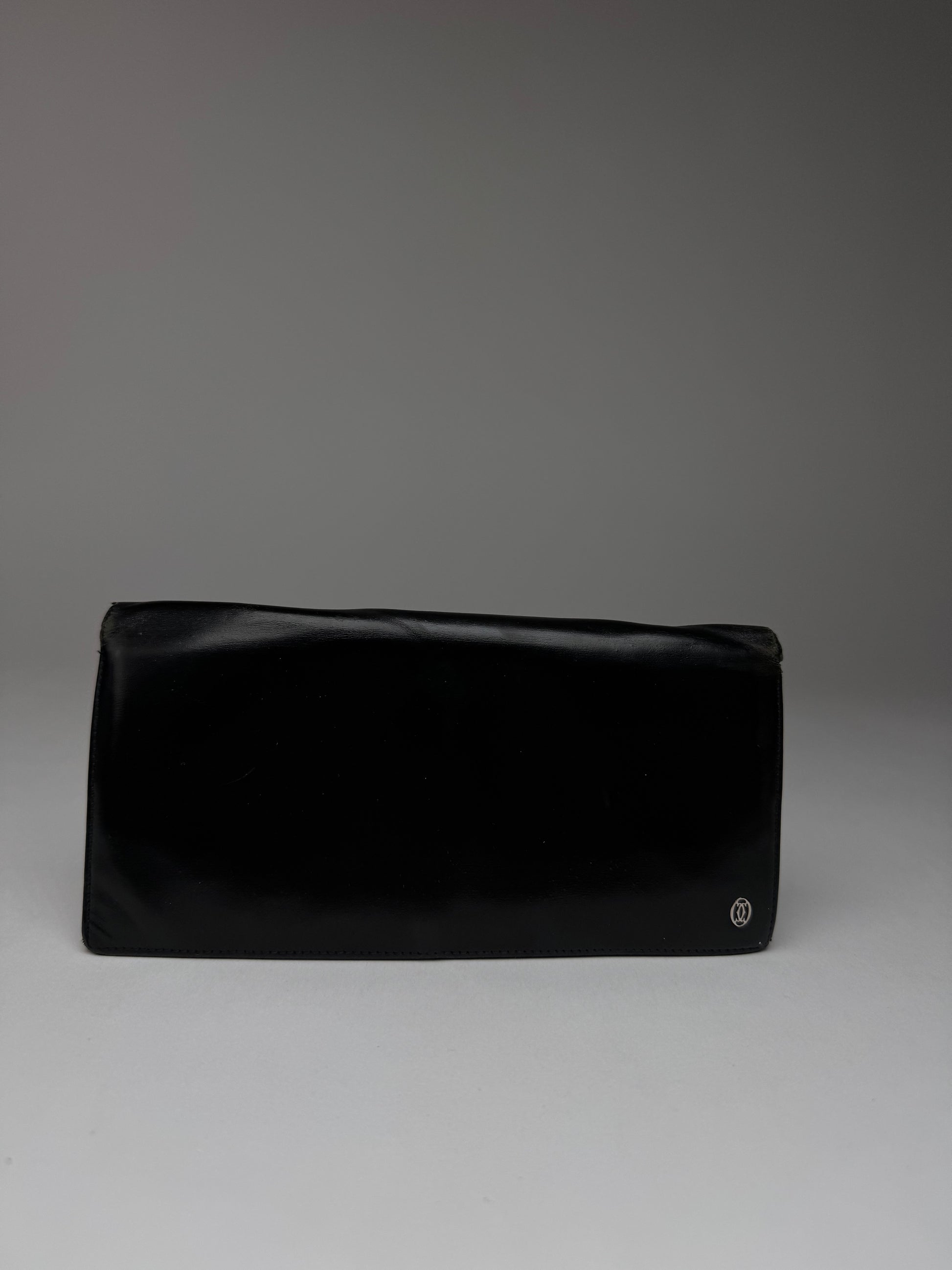 CARTIER Vintage ID & Card Holder. This vintage Cartier ID and card holder is crafted from black patent leather , exuding a sleek and sophisticated look. The silver-tone steel hardware adds a refined touch. The interior is lined with black leather for a luxurious finish. Despite bent material, scratches, and a missing zipper pull , the holder remains in very good condition inside . A timeless unisex accessory.