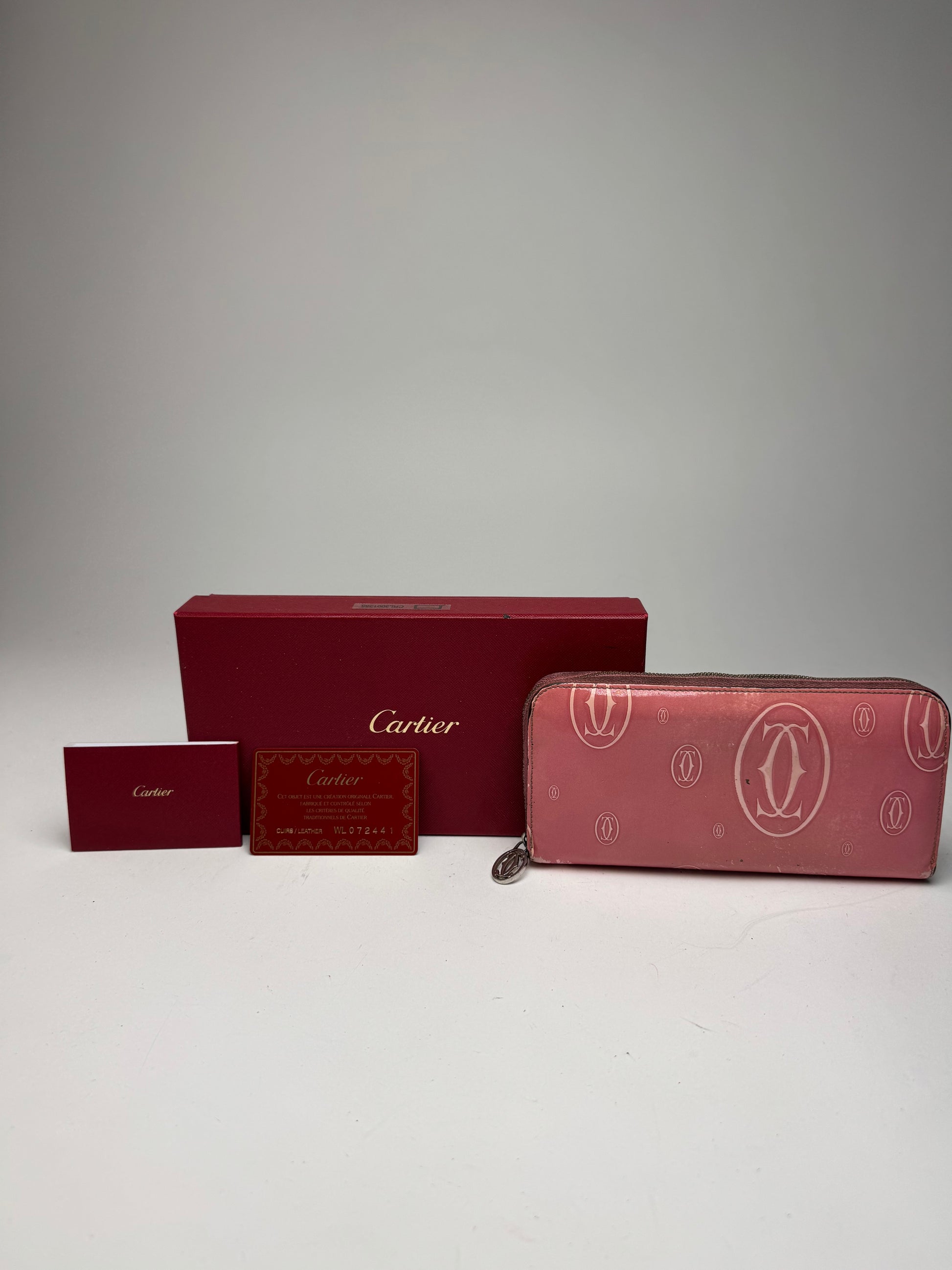 CARTIER Pink Monogram Patent Leather Wallet. This vintage wallet is crafted of glossy pink patent leather with a white Cartier monogram print. Cartier, founded in 1847 in Paris, is renowned for its timeless luxury accessories and iconic French elegance. The top zipper opens with a silver and steel Cartier logo pull to a pink leather interior. The wallet features silver and steel hardware throughout.