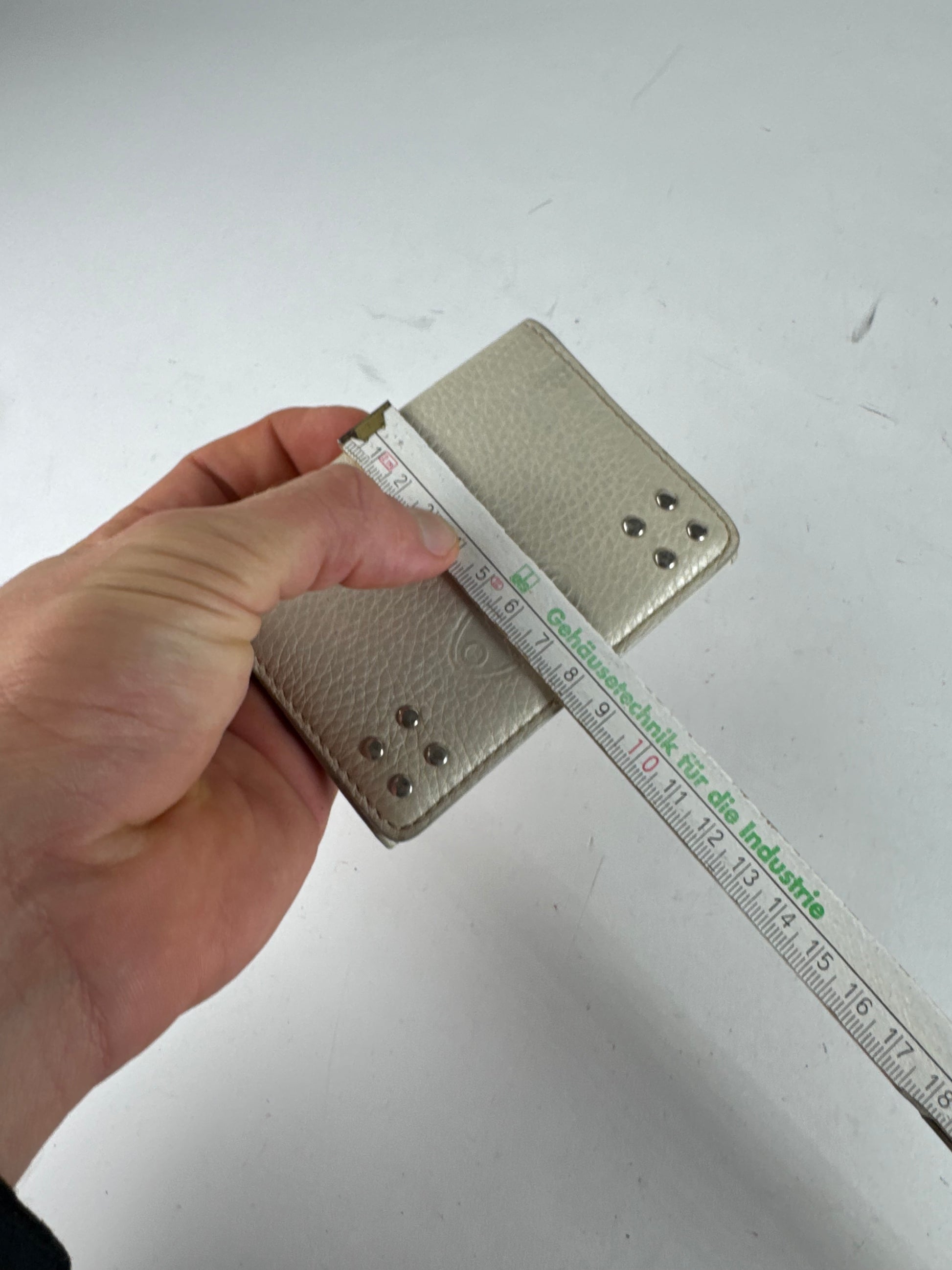This refined vintage card holder is crafted from smooth white leather and features the iconic CELINE TRIUMPH logo embossed on the front. The design is accented with eight silver-tone steel studs, adding a modern edge to this timeless Parisian piece. First introduced in the 1970s, the TRIUMPH emblem was inspired by the Arc de Triomphe in Paris and has since become one of CELINE’s most enduring symbols of understated luxury and French elegance.