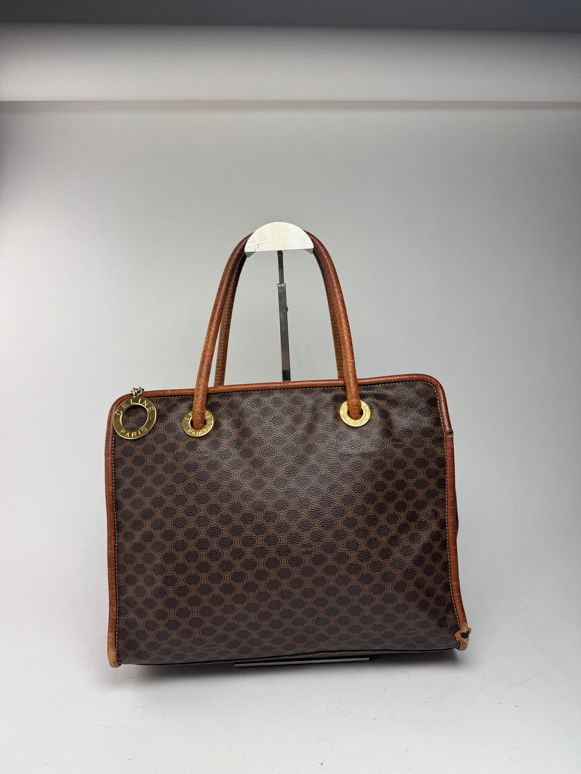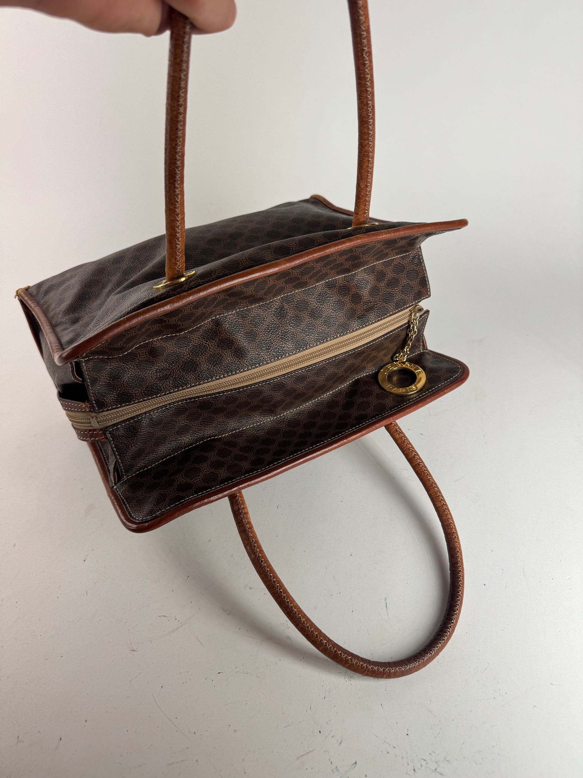 CÉLINE Paris Vintage Triomphe Handbag. This vintage handbag is finely crafted of brown leather canvas with the signature CÉLINE Triomphe monogram. The design is finished with red-brown leather handles and trim, as well as gold-toned ring logo accents of CÉLINE Paris on the zipper pull and handle attachments. The bag secures with a top zipper and opens to an orange-brown leather interior. First introduced in the 1970s by Céline Vipiana, the Triomphe motif was inspired by the chains surrounding the Arc de Triomphe in Paris and remains one of the house's most recognizable emblems.
