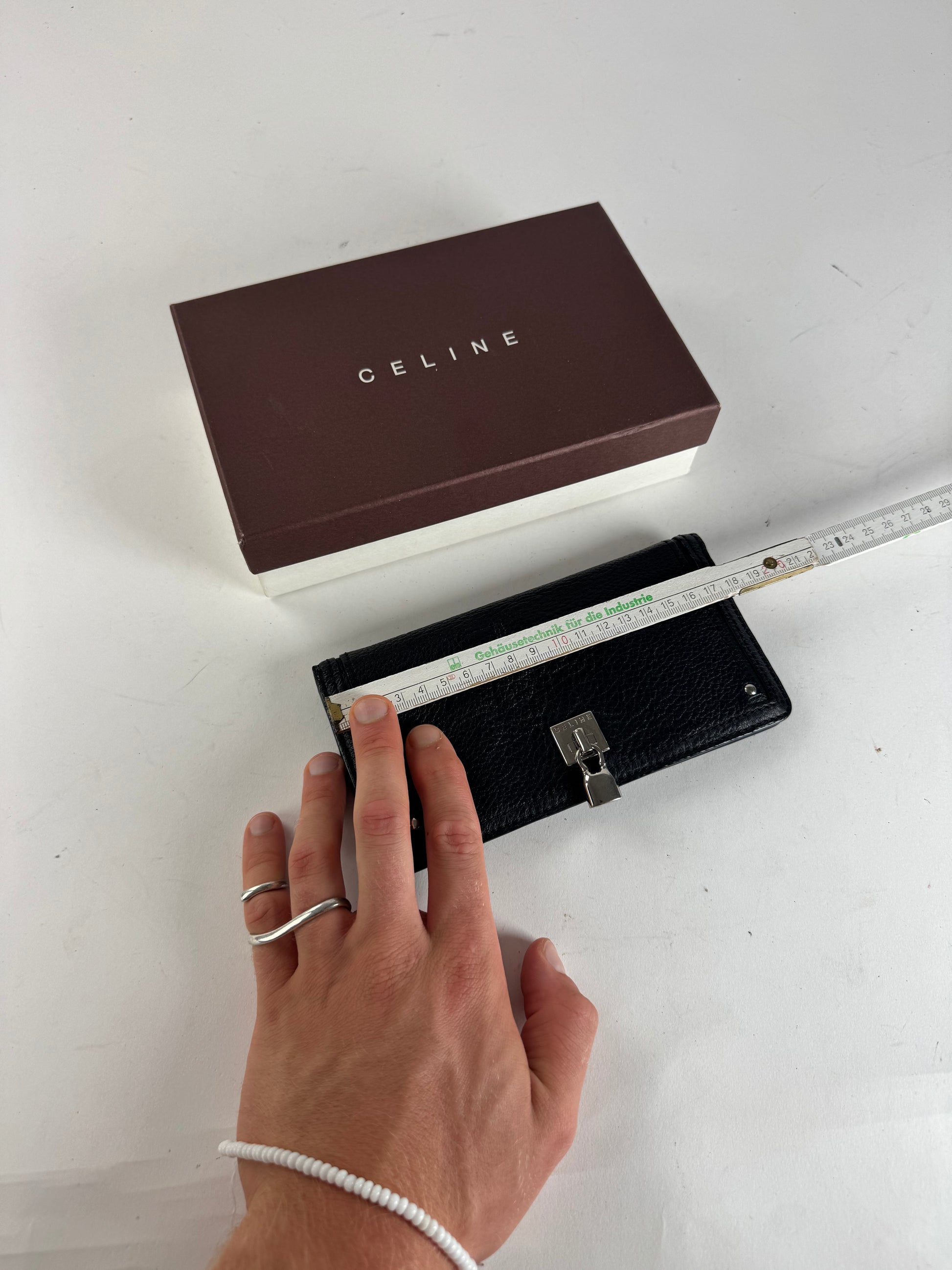 CELINE Paris Vintage Black Leather Wallet/ID Case. This elegant vintage piece is finely crafted of smooth black leather with two silver-tone steel studs on the front and a CELINE-branded lock. The interior features compartments for cards and IDs as well as a zippered pocket for coins or bills.