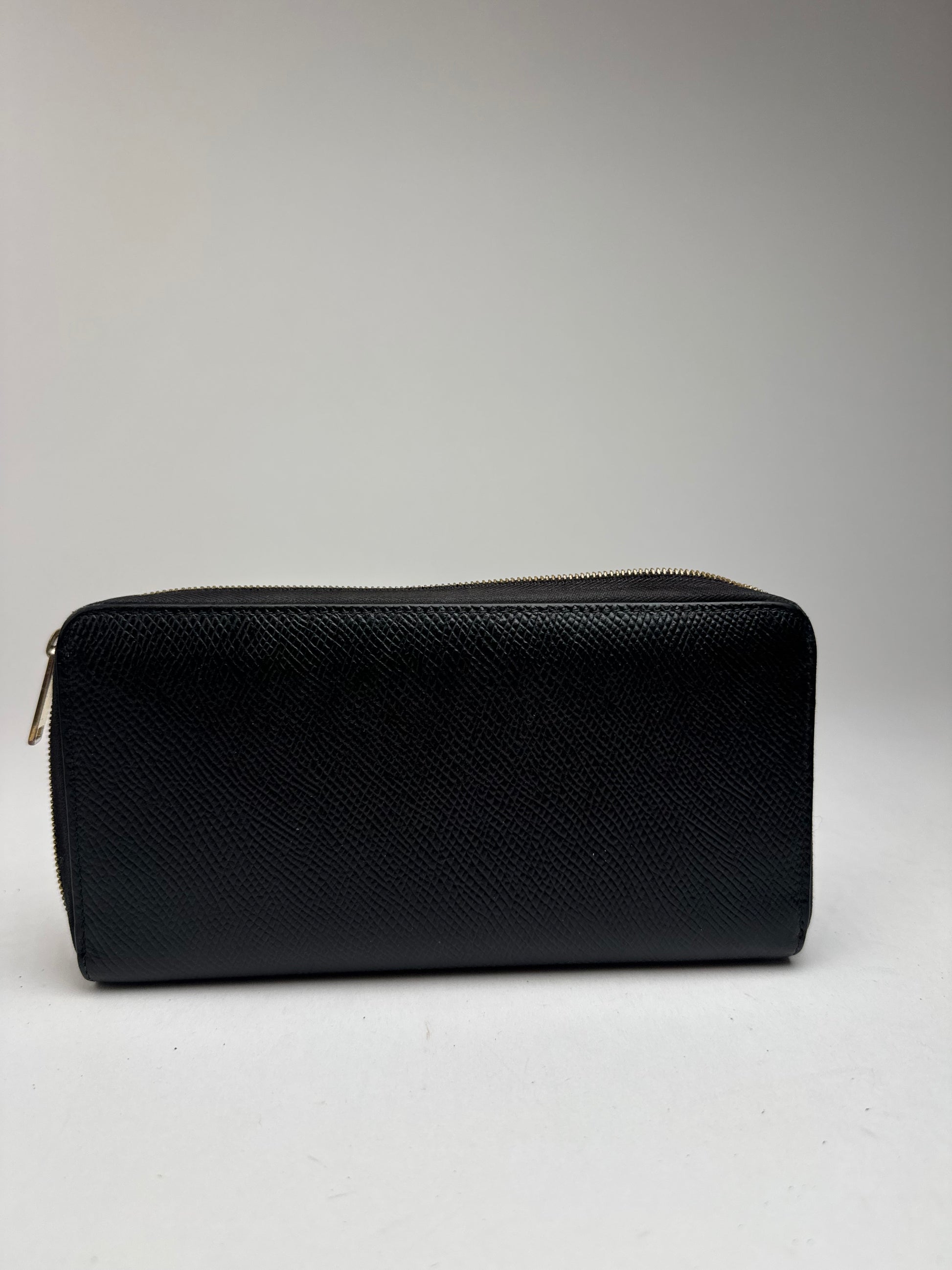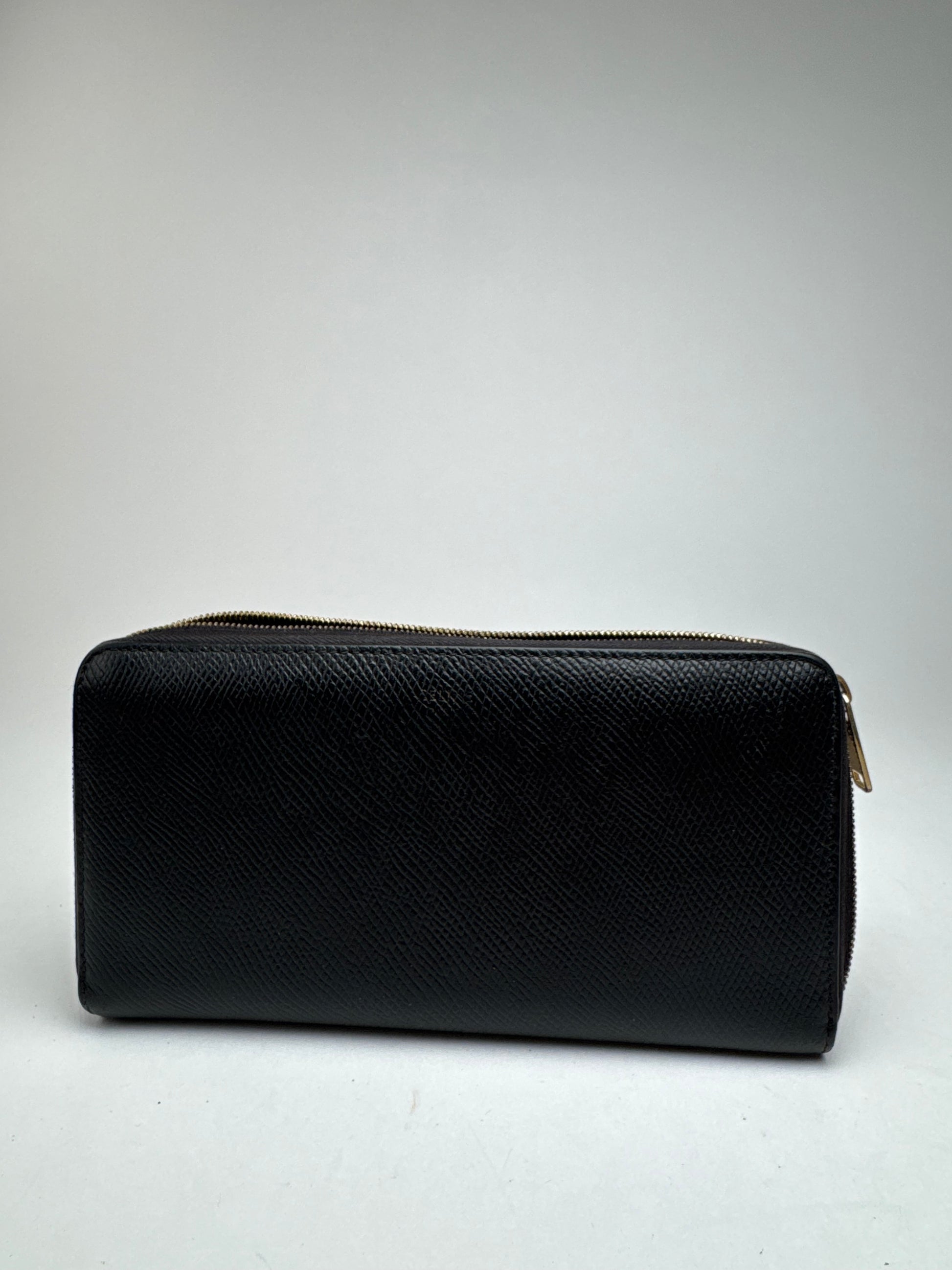 This classic vintage wallet is crafted from black textured leather and features elegant gold-tone steel hardware. Made in Italy, it showcases Celine's timeless minimalist design.