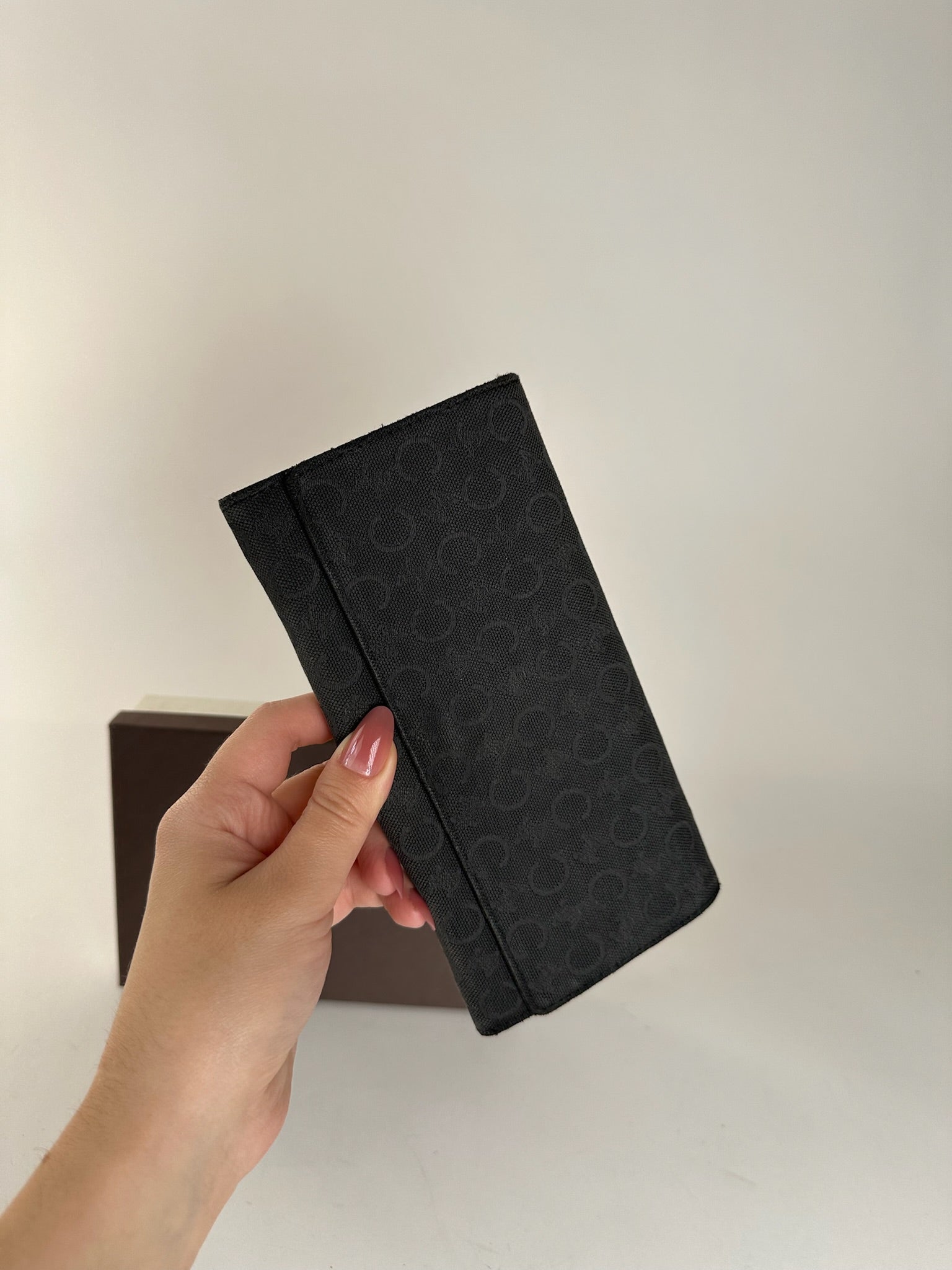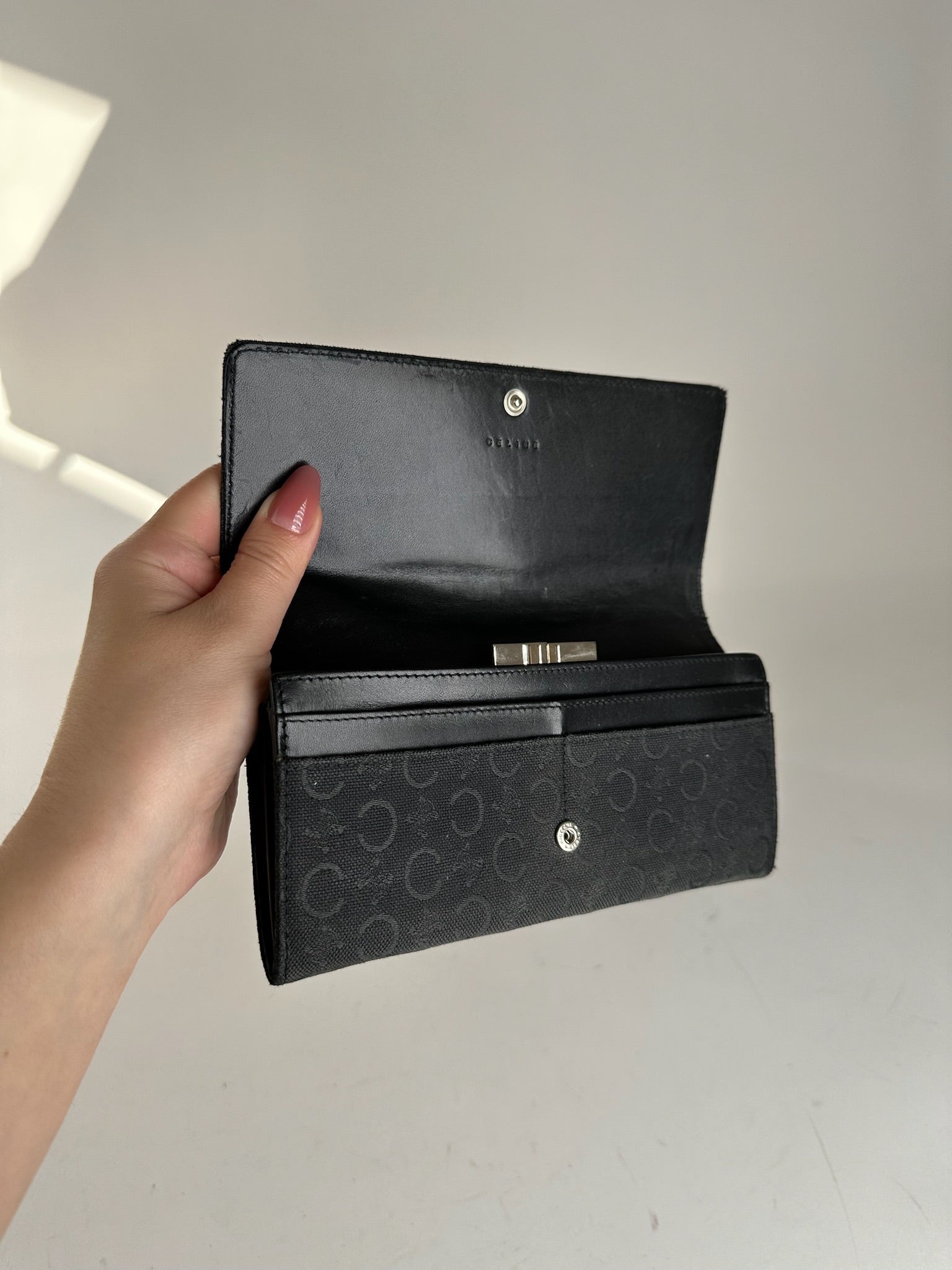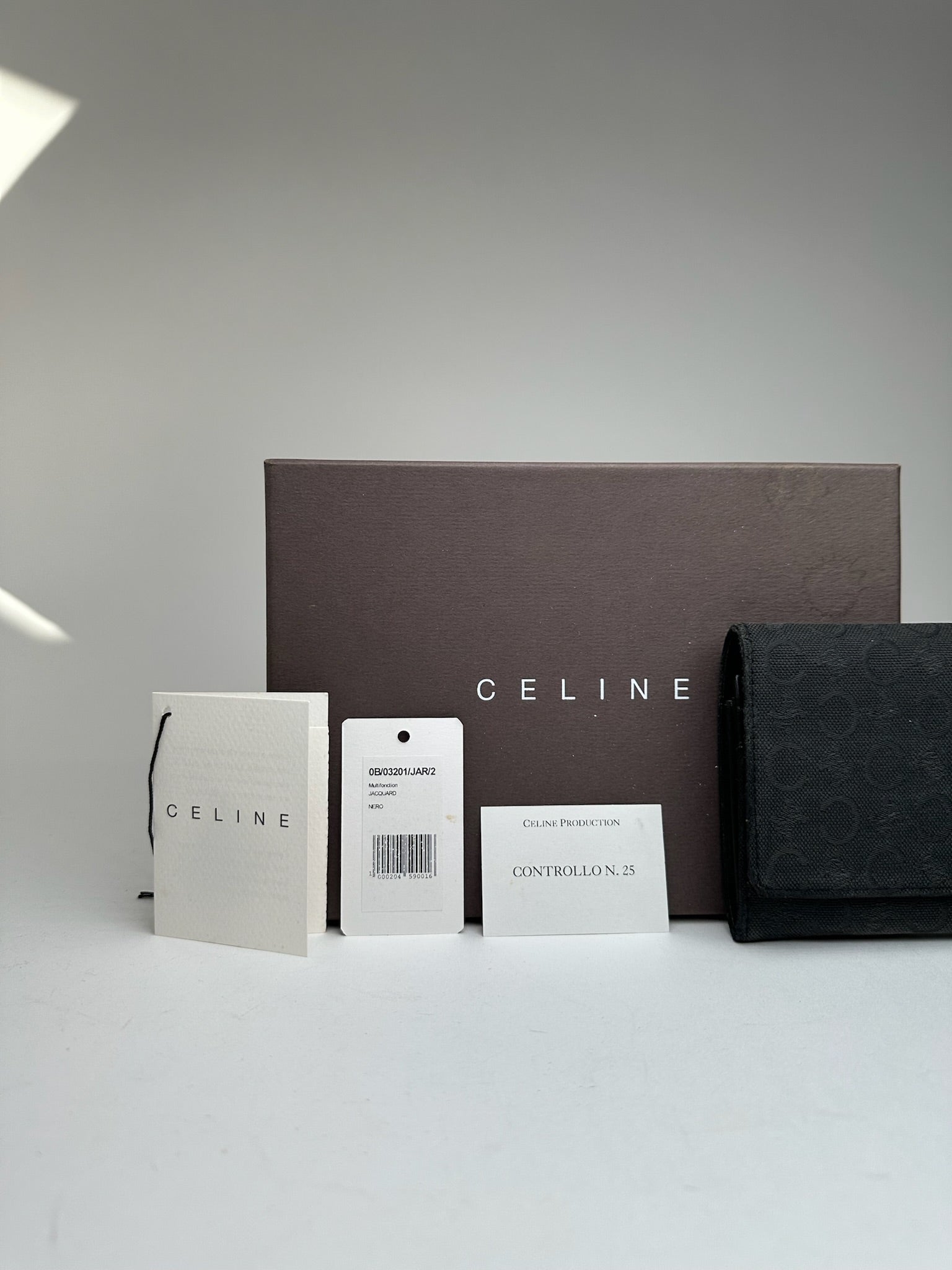 CELINE PARIS Macadam Wallet. This elegant wallet is finely crafted of black CELINE Macadam monogram canvas. The wallet features silver-tone steel hardware, a snap button closure, and a flap top. The interior is lined with black leather.