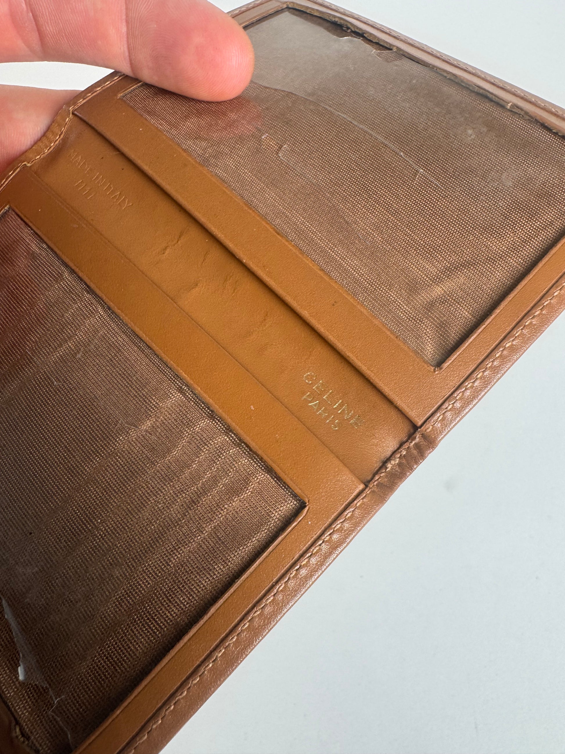 CELINE PARIS Triomphe Monogram Cardholder. This vintage cardholder is crafted from dark brown leather featuring the iconic Céline Triomphe monogram — a design introduced in the 1970s, inspired by the chain links surrounding the Arc de Triomphe in Paris. The trim is made of contrasting orange-brown leather, adding a refined touch. The foldable design includes two transparent PVC compartments. This piece is made in Italy and dates to 2011.