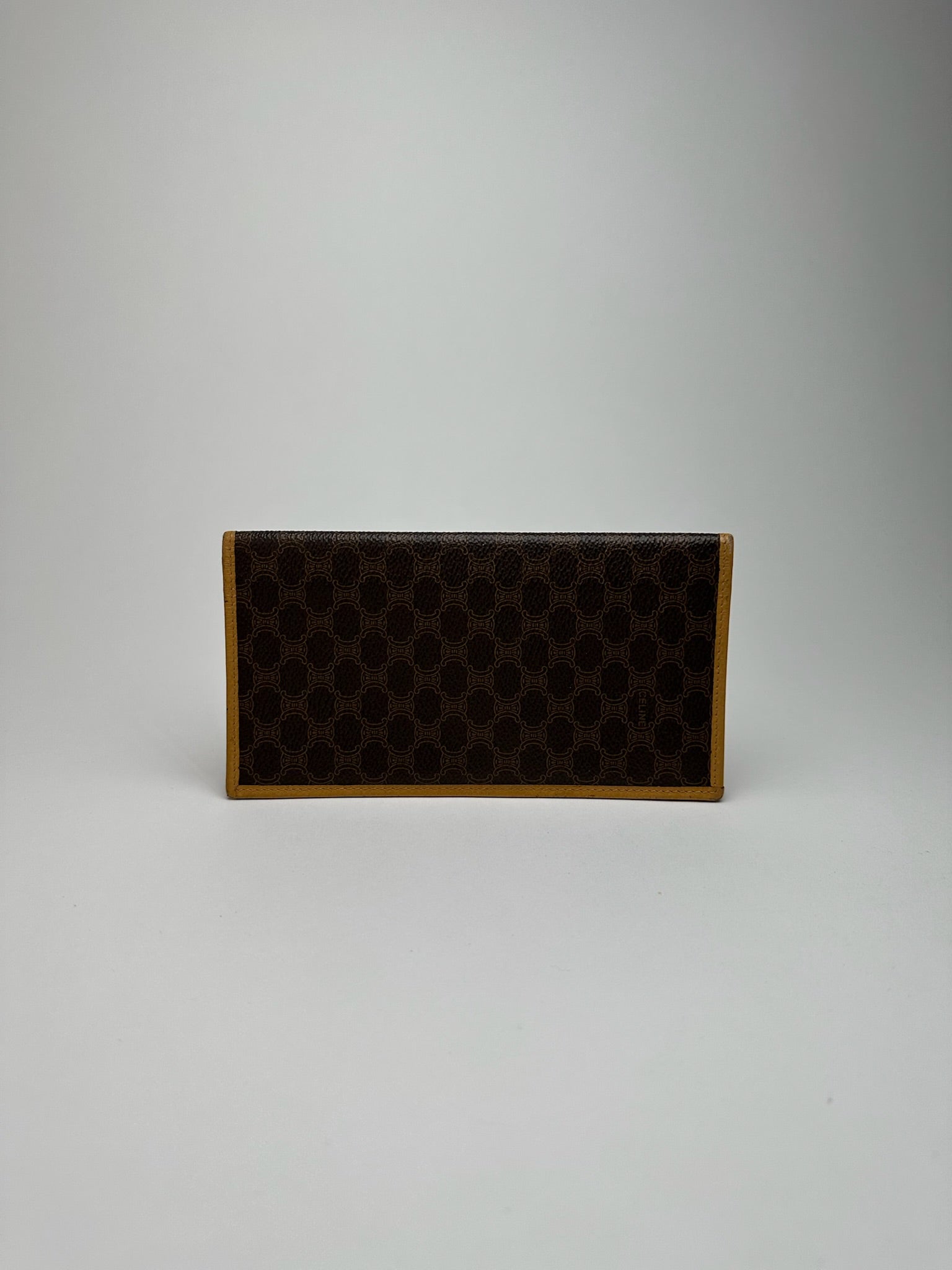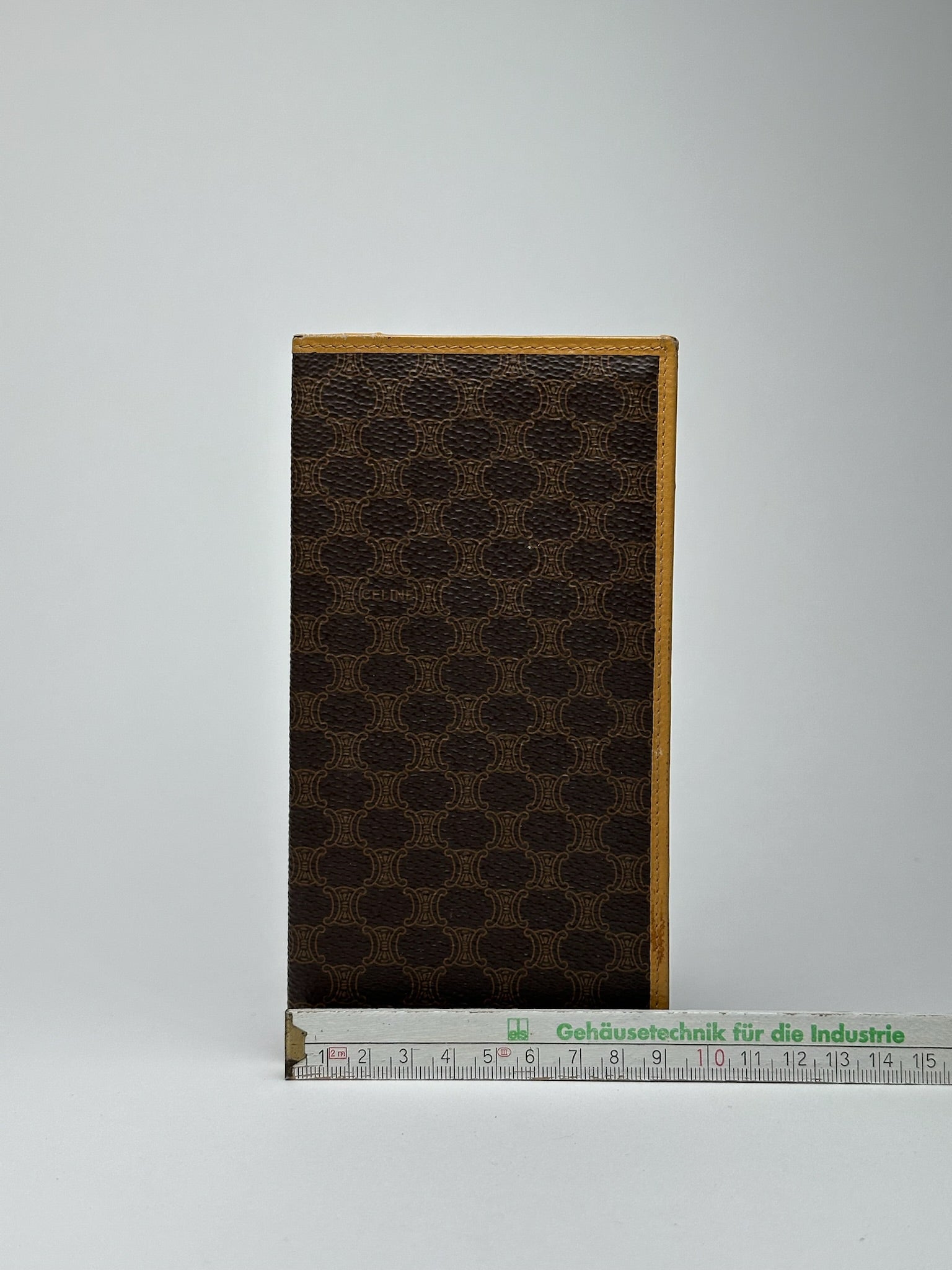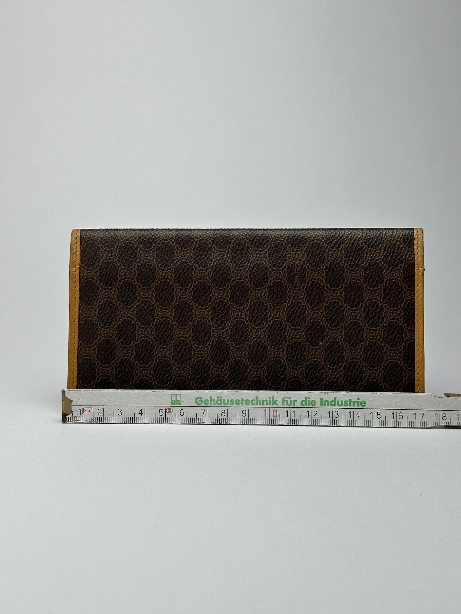 CELINE PARIS Vintage Monogram Cardholder. This chic cardholder is finely crafted of dark brown CELINE monogram leather with sand-colored leather trim. The interior is lined in matching sand-colored leather.