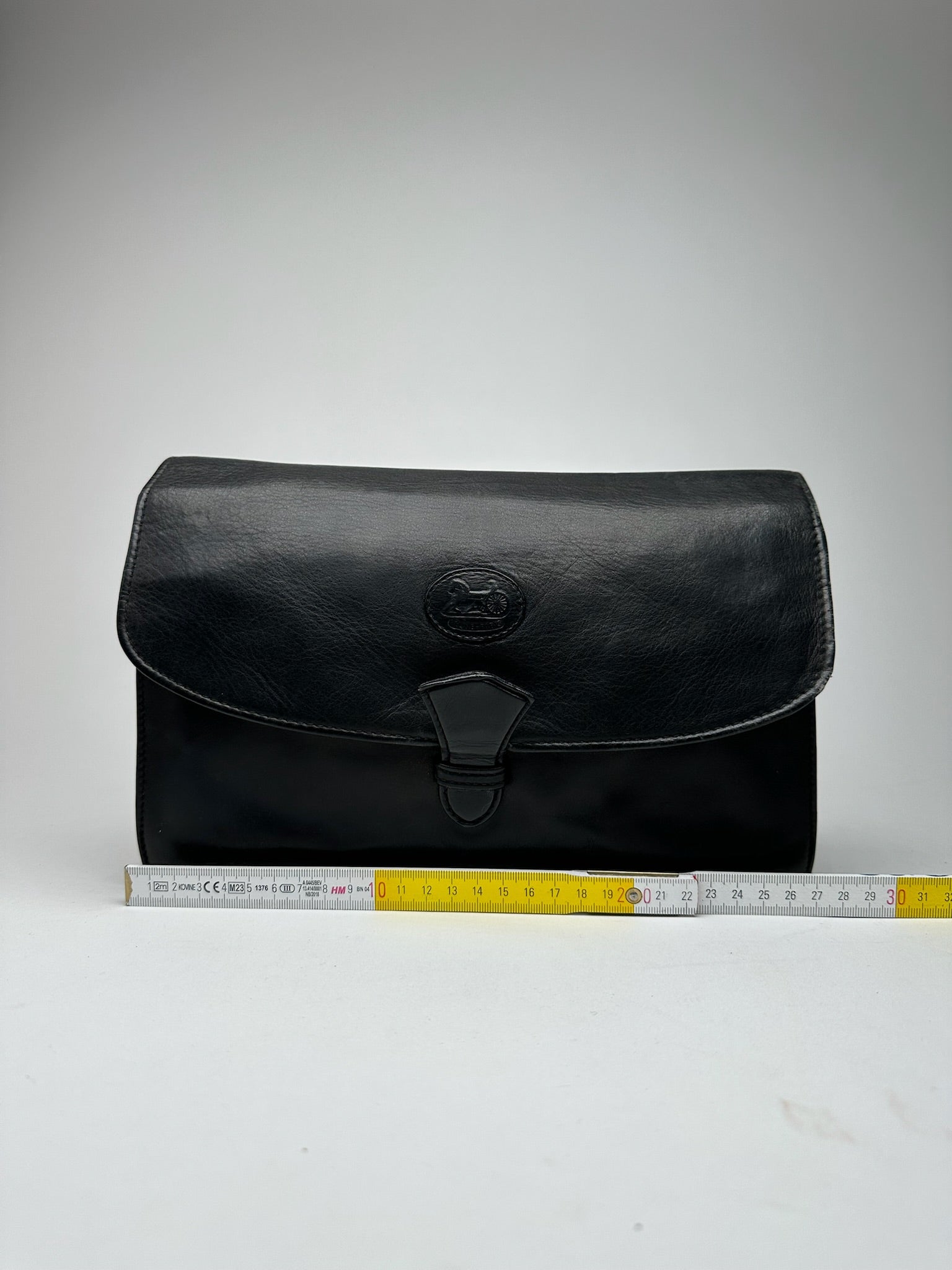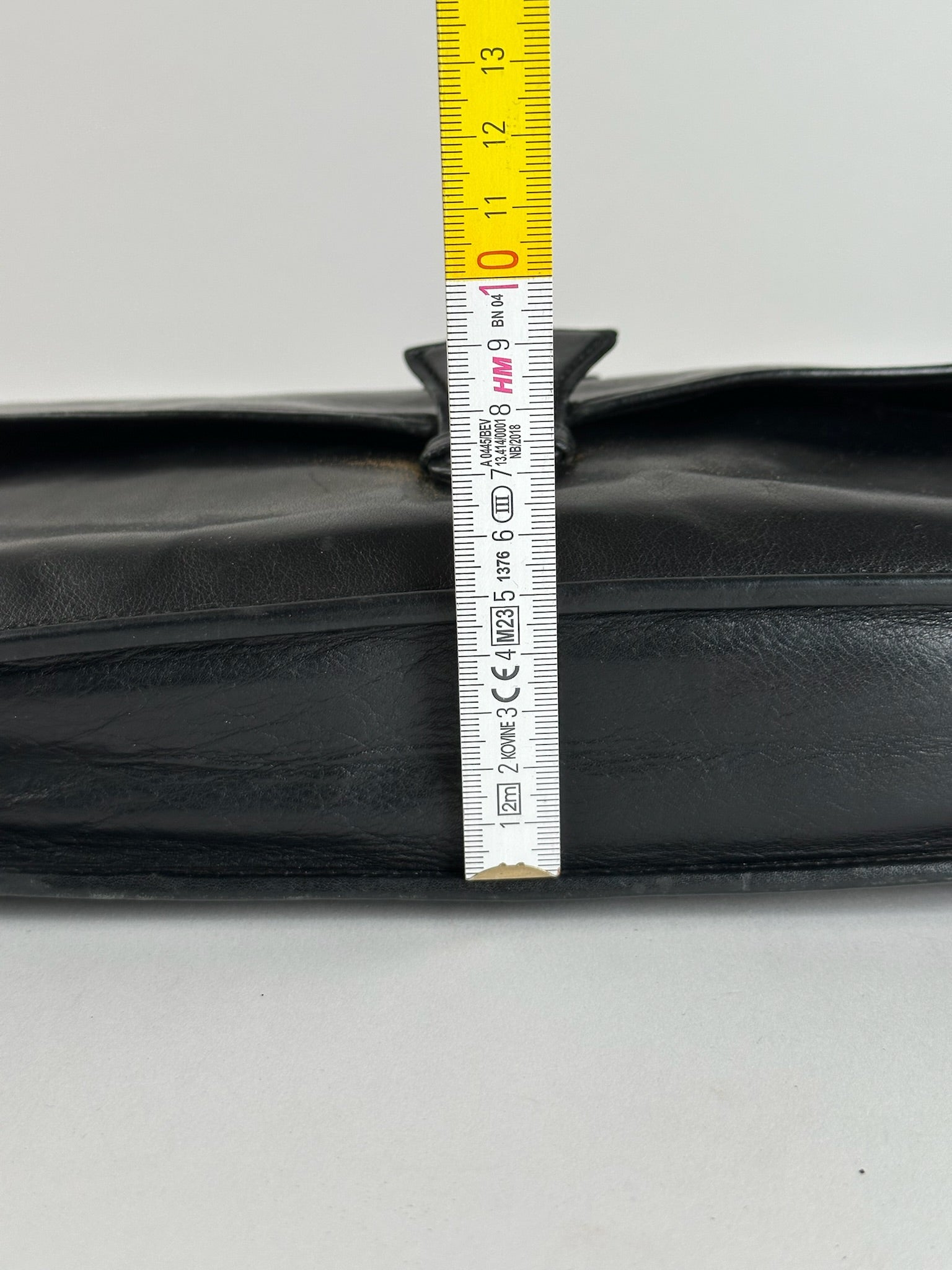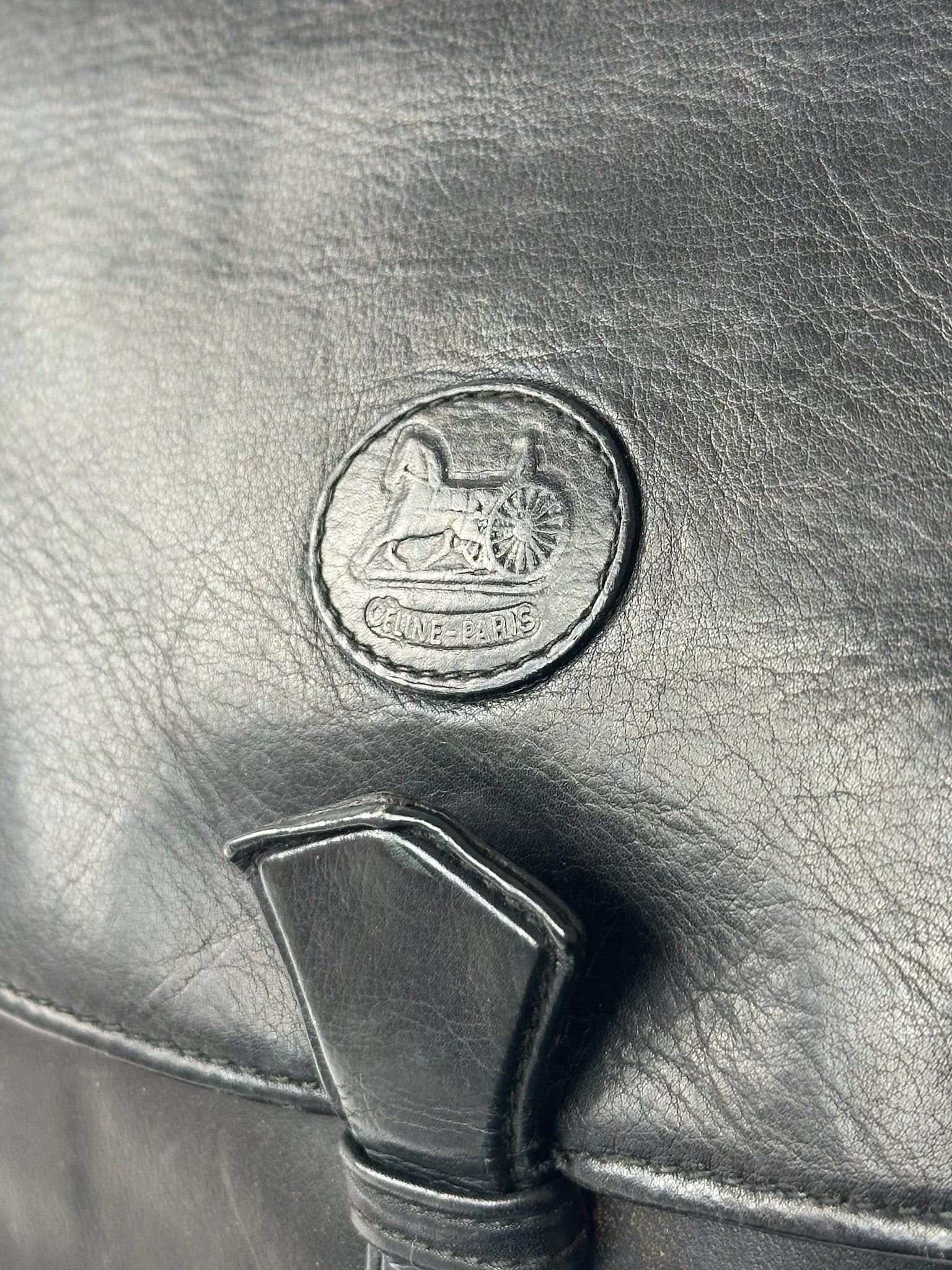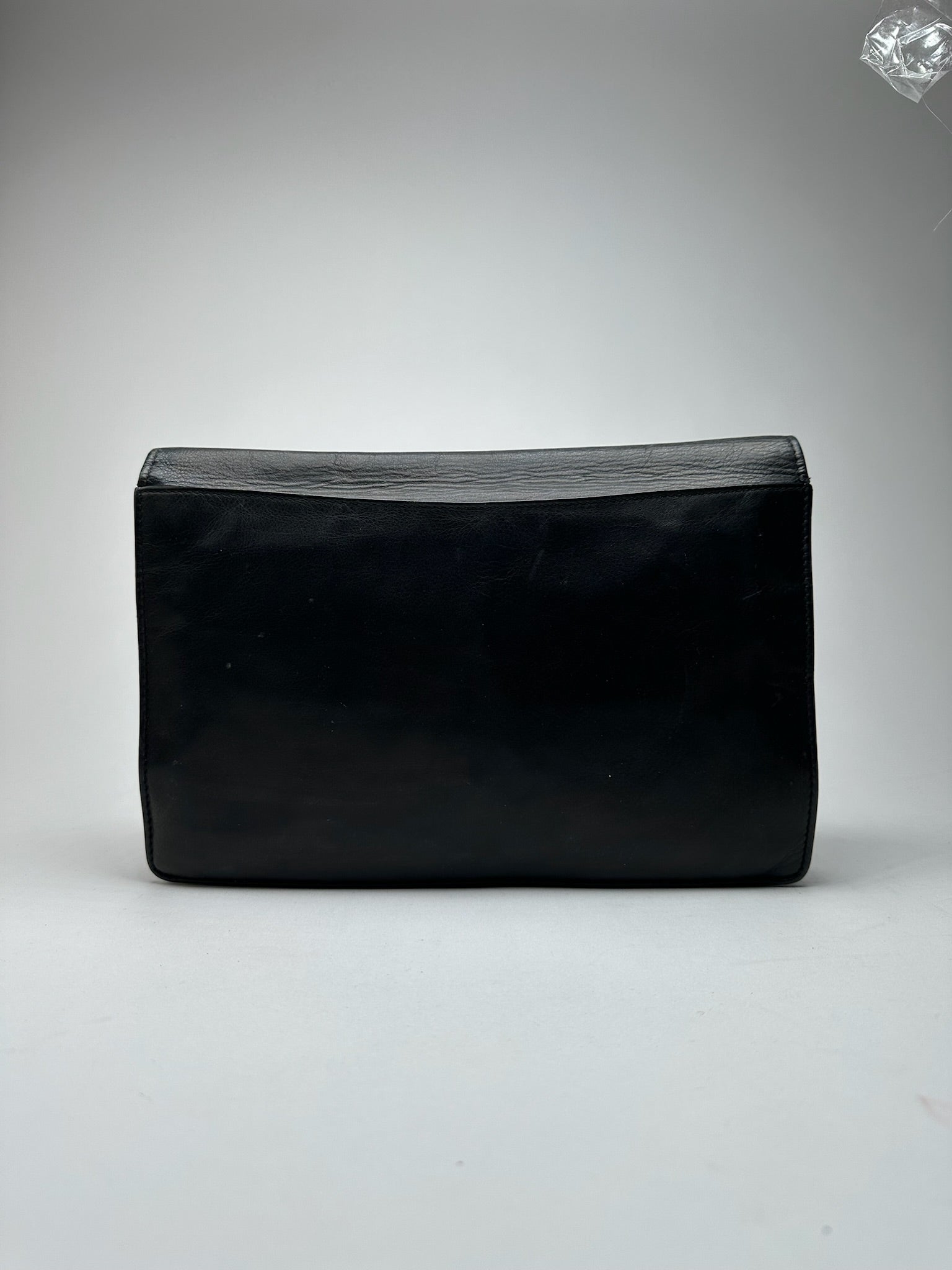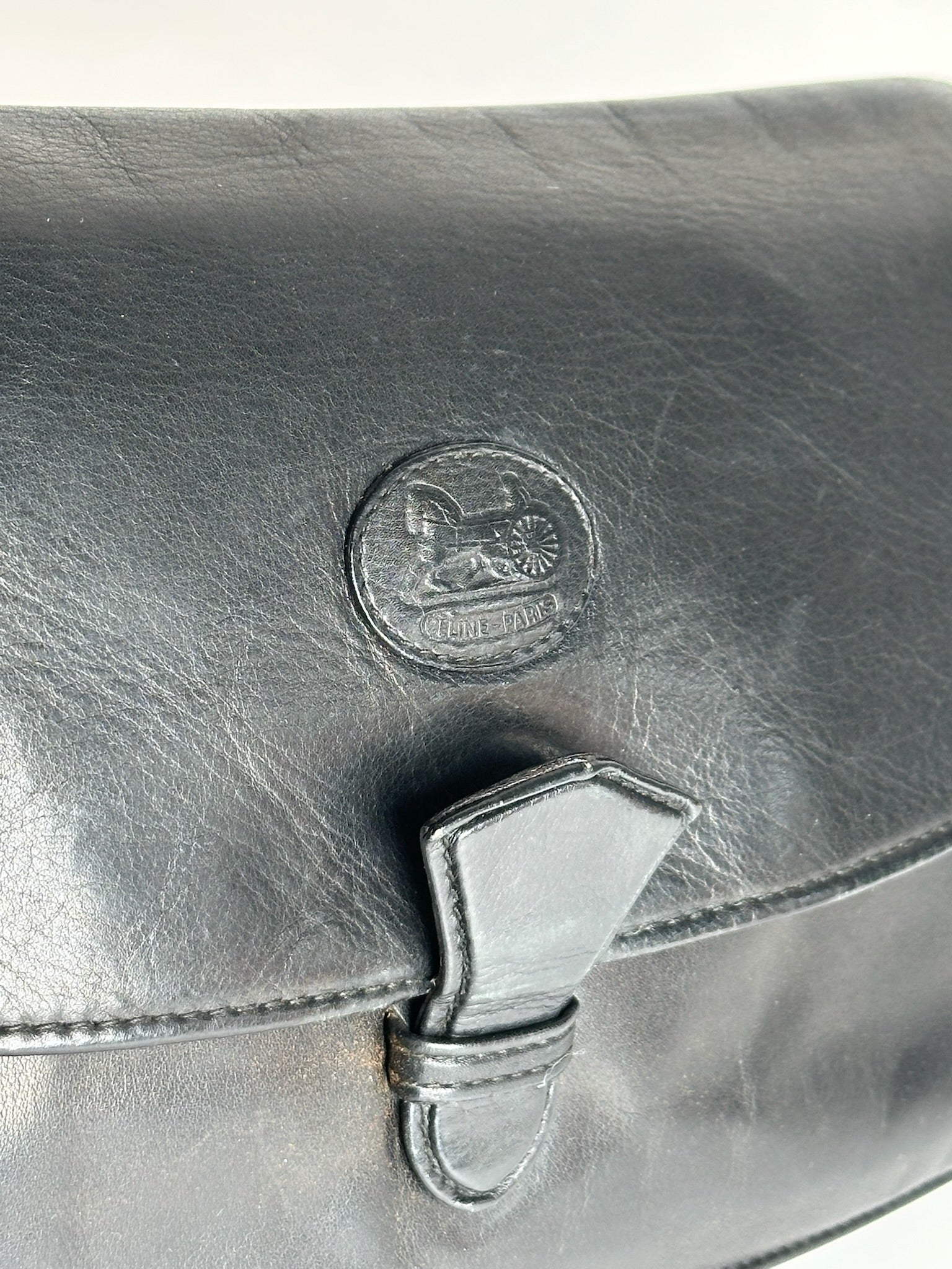 CELINE Triomphe Black Leather Clutch. This chic clutch is finely crafted of smooth black leather with matching black leather trim. The bag features a front flap with a slip-lock closure and is adorned with the iconic CELINE horse carriage logo on the front. The interior is lined with black leather.