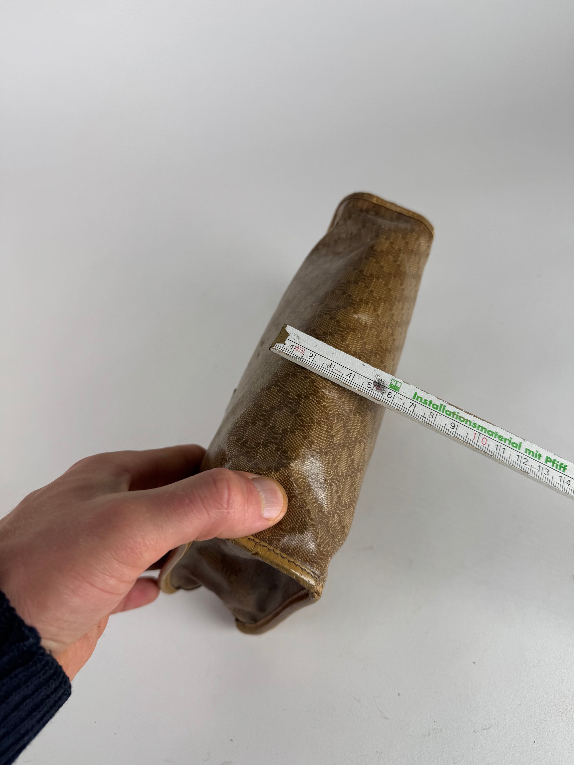 CELINE PARIS vintage Triomphe clutch. This elegant vintage clutch from Celine Paris is crafted from gold-brown leather featuring the iconic Celine monogram. The timeless Triomphe model showcases the brand's signature sophistication and craftsmanship. The interior is lined with dark brown leather, complementing the luxurious exterior. Made in Italy in 2006 , this piece is a classic addition to any collection.