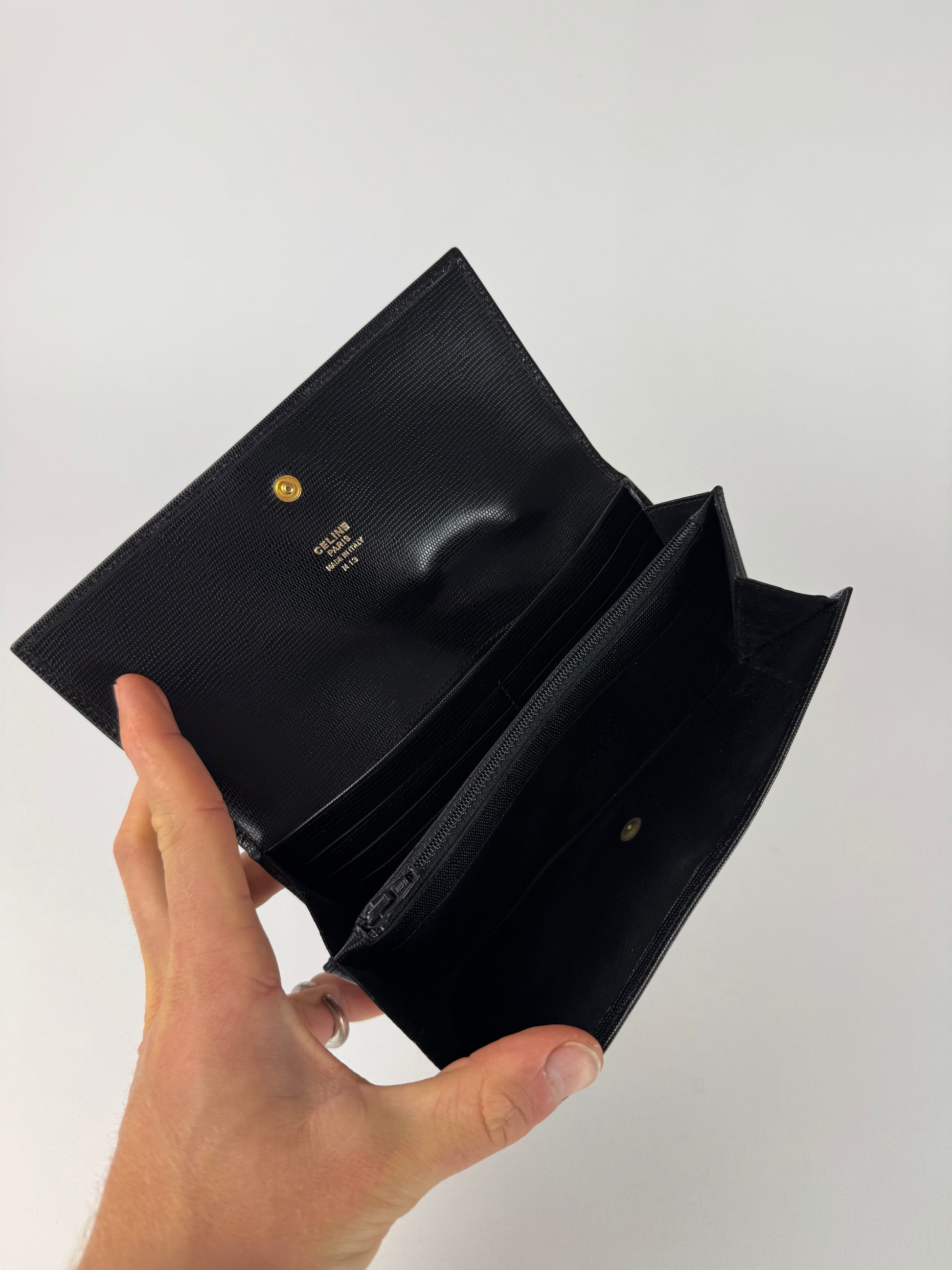 CELINE Vintage Triomphe Wallet. This vintage Celine Triomphe wallet is crafted from black textured leather , offering a refined and timeless design. The gold-tone steel hardware adds a luxurious touch. Despite slightly bent material , the wallet remains in very good condition . Made in Italy in 2013 , it is a classic and elegant piece.