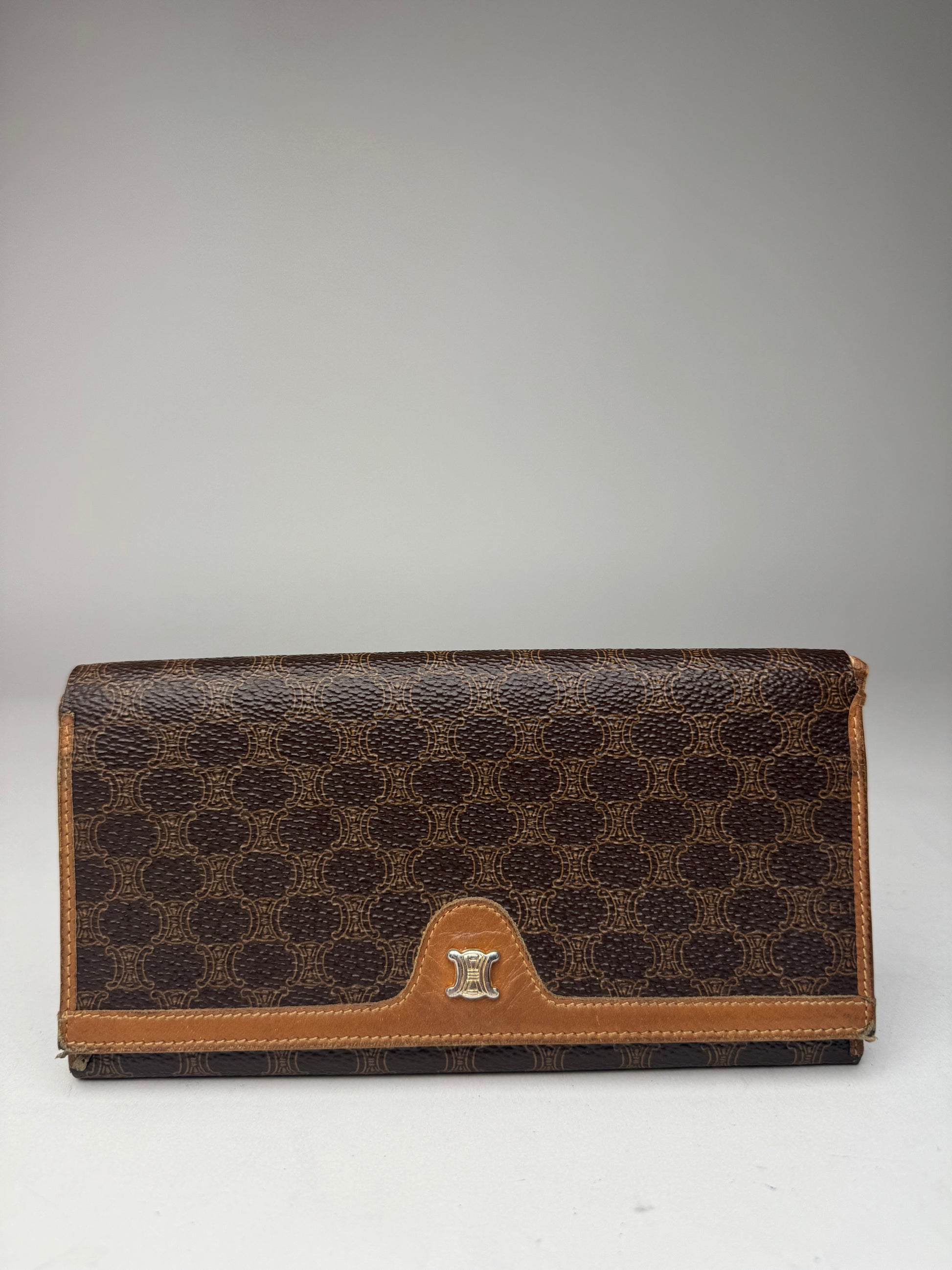 This elegant vintage wallet is finely crafted of dark brown leather in the CELINE Triumph monogram with contrasting light brown leather details. The front is adorned with the CELINE Triumph logo in gold-tone steel and secured with a press-button closure. The interior in light brown leather offers compartments for cards, banknotes, and coins.