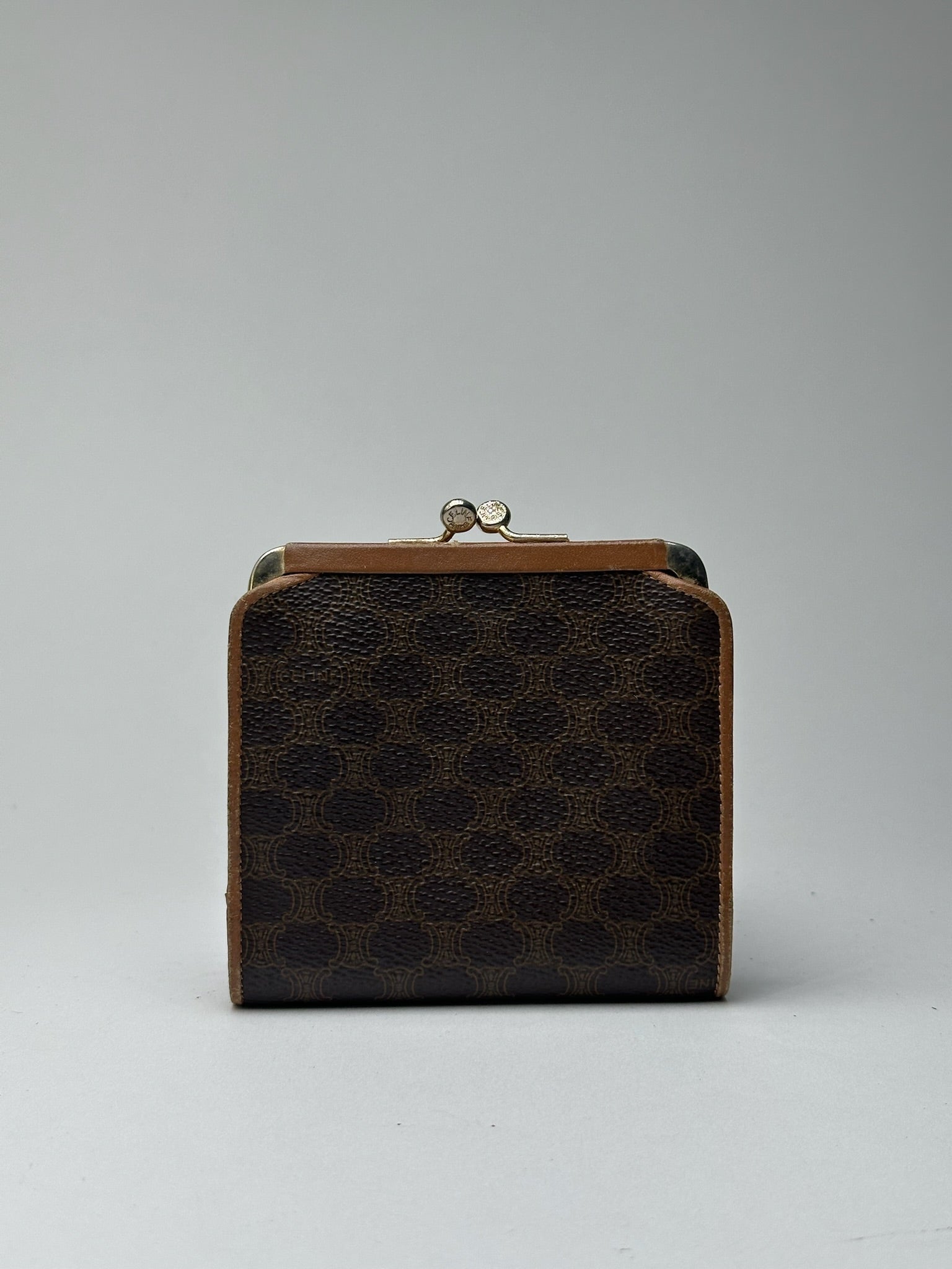 CELINE Macadam Vintage Wallet. This elegant wallet is finely crafted of NB leather featuring the classic brown CELINE logo monogram, a design inspired by the Arc de Triomphe and introduced in the 1970s to represent the Parisian elegance of the brand. The wallet includes light brown leather detailing, a fold-over flap closure for the coin compartment, and a snap button closure for bills and cards.