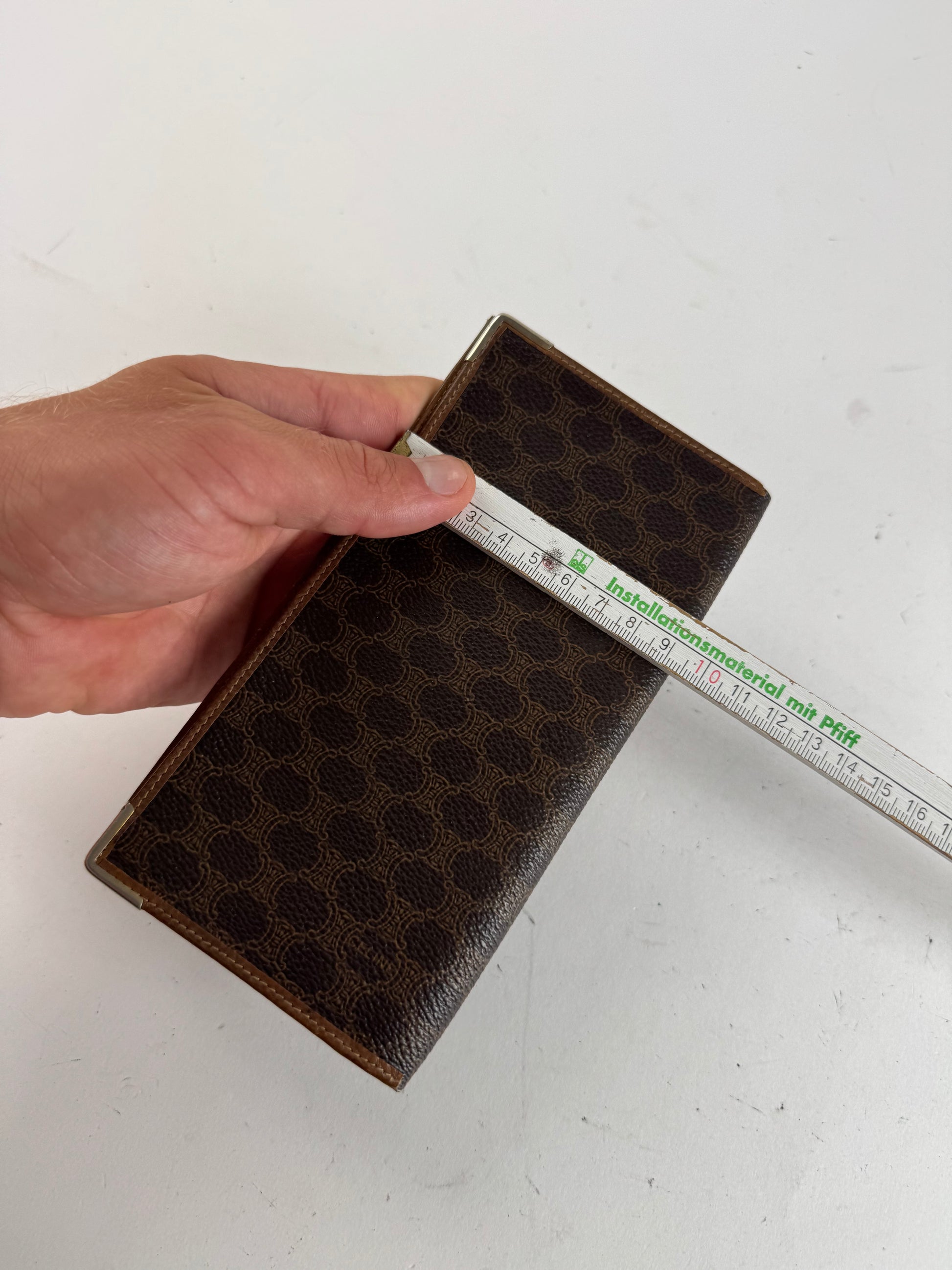 This elegant wallet is finely crafted of dark brown leather with the CELINE Triomphe monogram. The Triomphe emblem, first introduced in 1972 and inspired by the chain surrounding the Arc de Triomphe in Paris, has since become a timeless house icon. The wallet features reinforced golden steel corners on the front and opens to a beige-brown leather interior with compartments for cards, IDs, coins, and bills.
