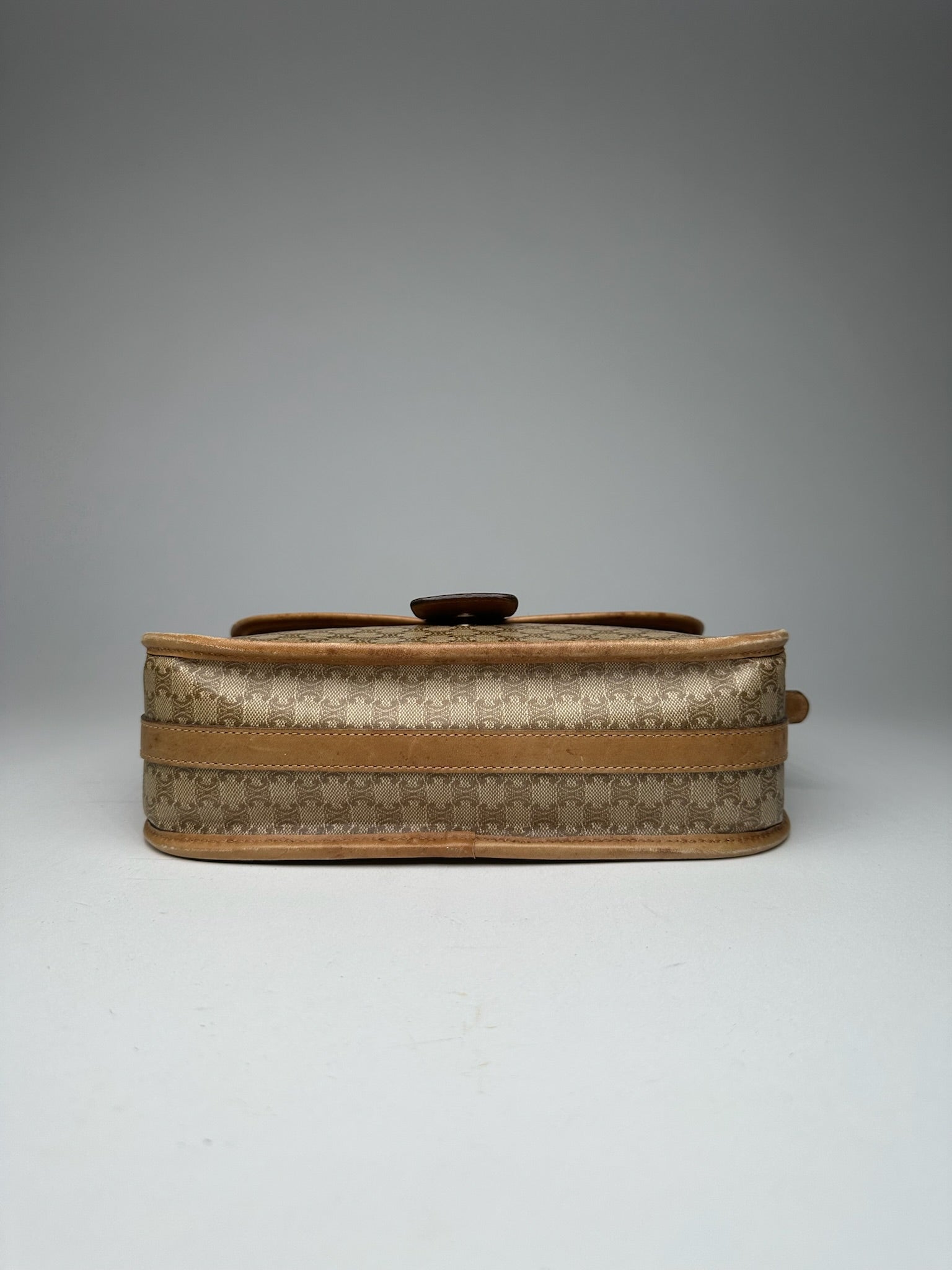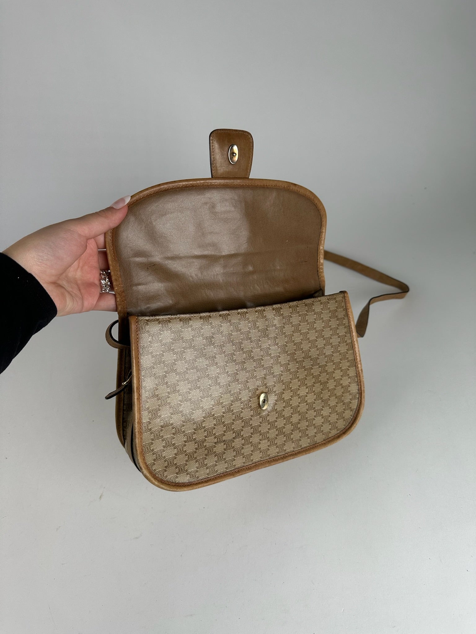 This chic handbag, model Triomphe , is crafted from beige and brown Céline monogram canvas with caramel-brown leather trim. It features a magnetic flap closure with an additional snap button for extra security. The adjustable shoulder strap allows for versatile styling. The interior is lined in smooth brown leather. Made in Italy.