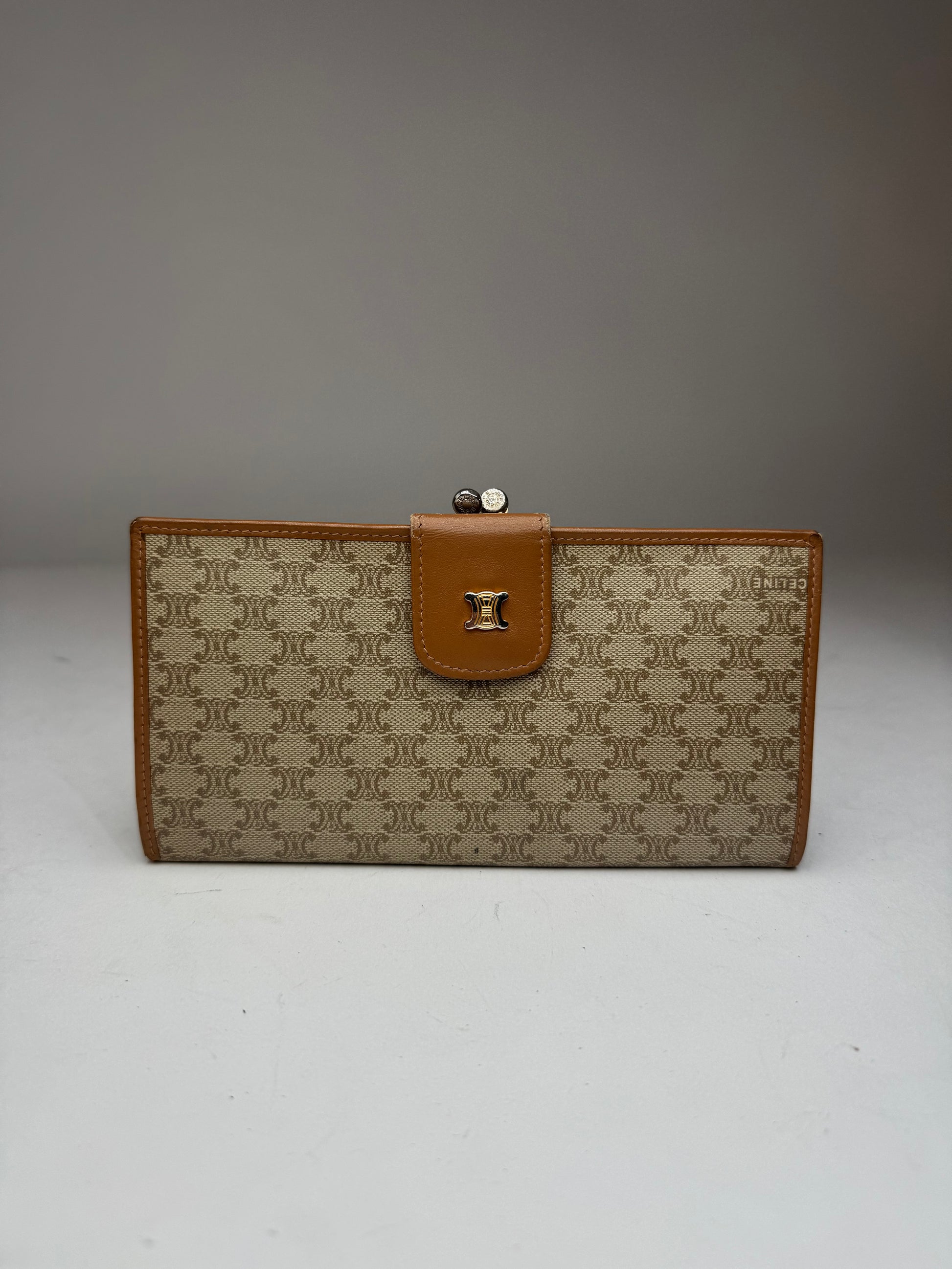 This elegant vintage wallet is finely crafted of beige leather in the CELINE Triumph monogram with beige-brown leather details. The front is adorned with the iconic Triumph logo in gold-tone steel. The interior features two compartments: a press-button closure for banknotes and cards, and a flap closure for coins.