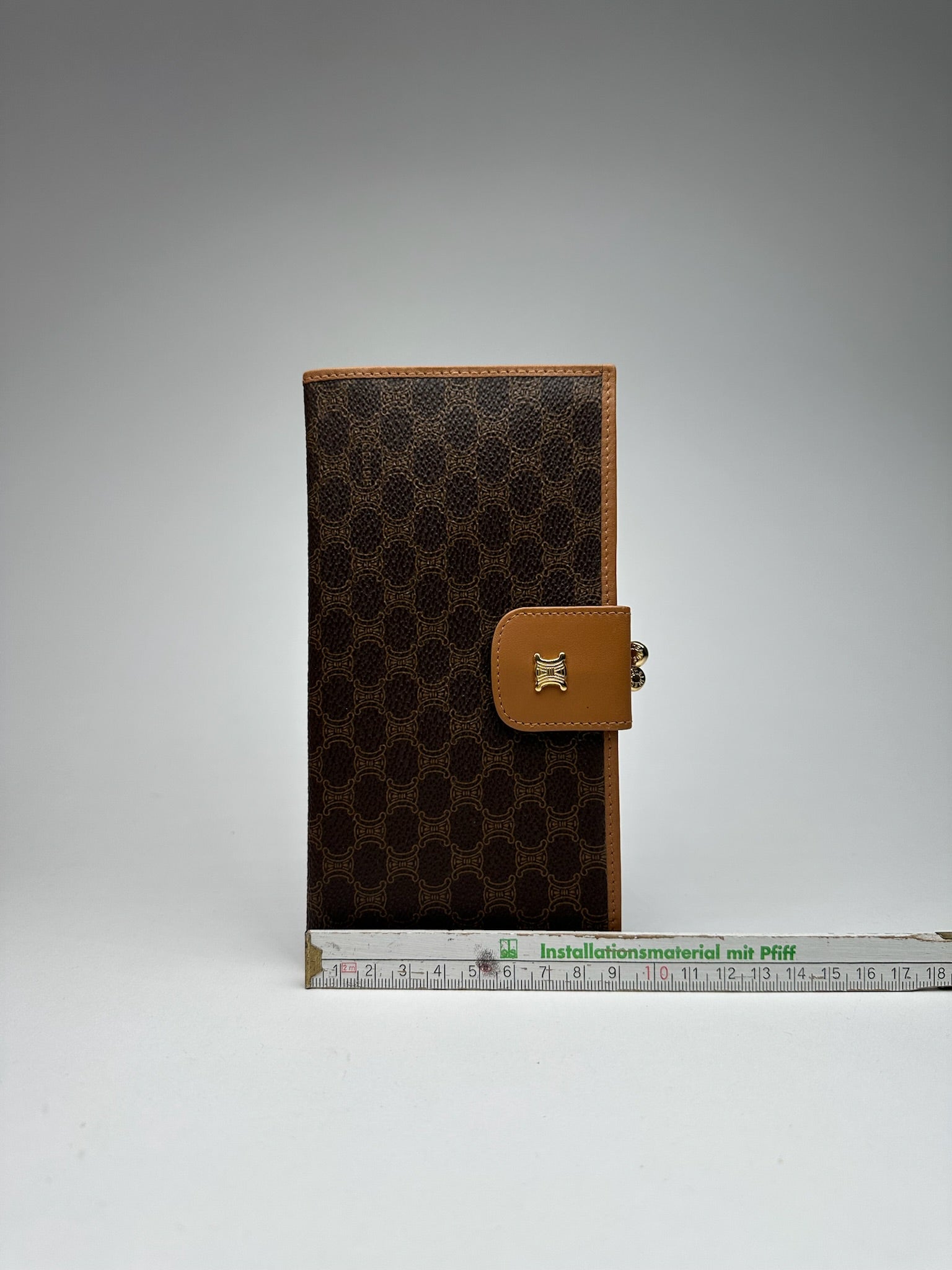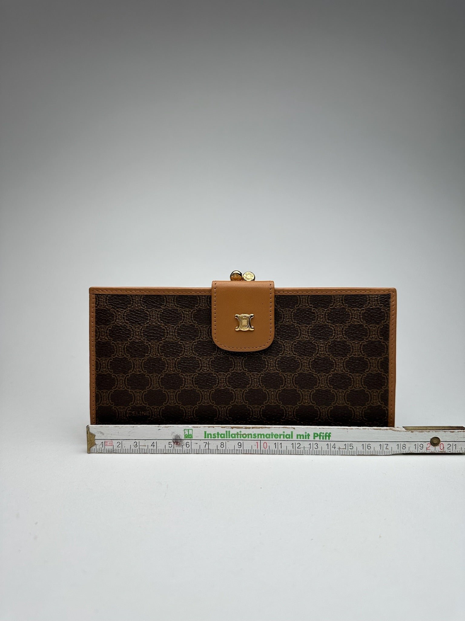 This classic wallet is finely crafted of brown leather with the CELINE monogram and features gold-tone steel hardware. It includes a flap closure with a snap button.