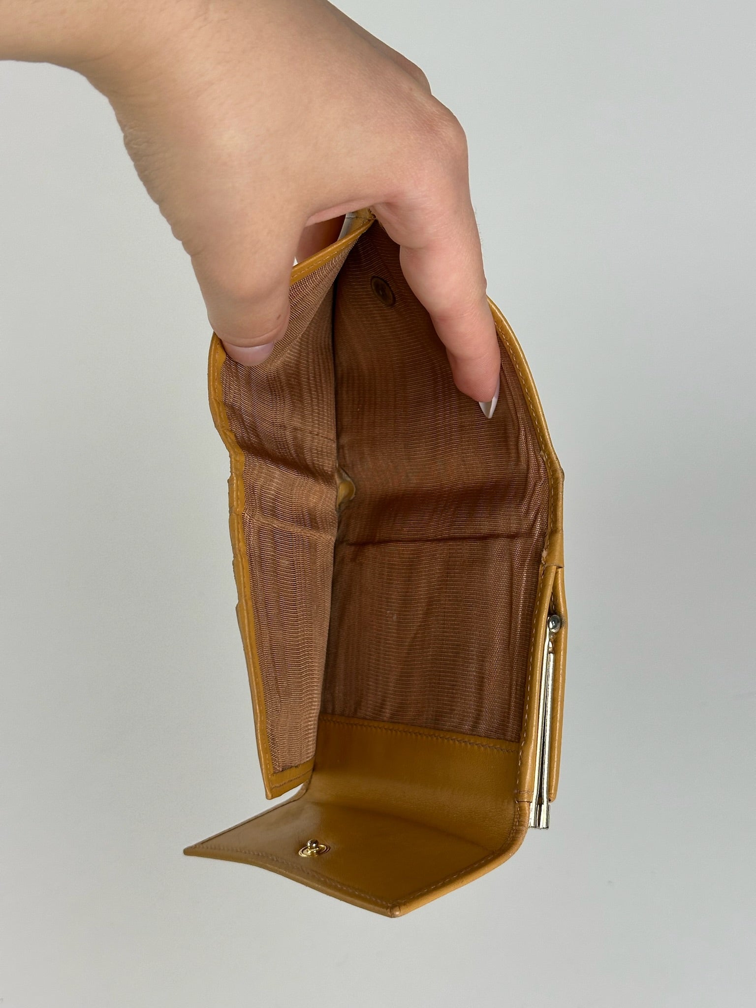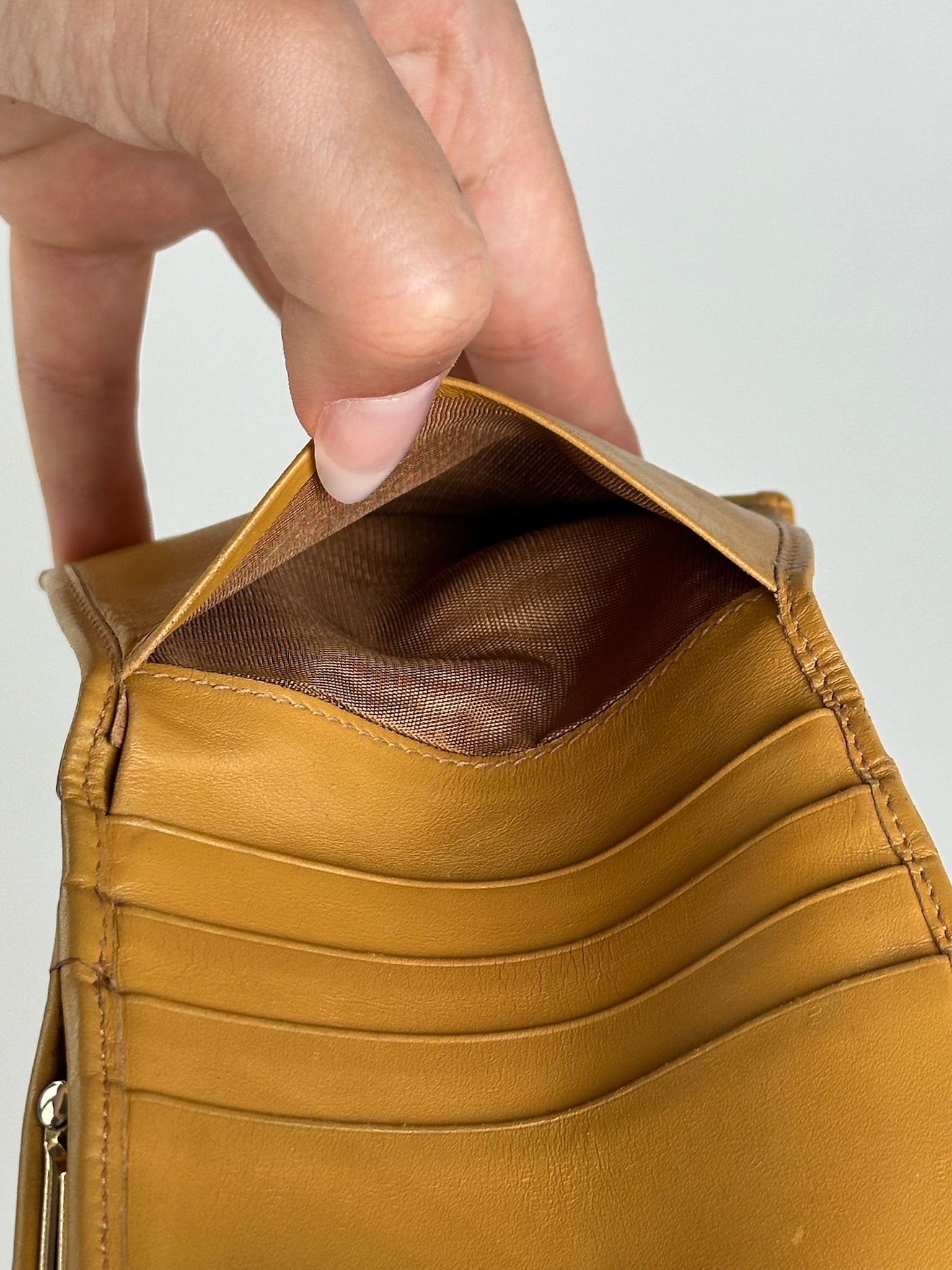 CELINE PARIS Vintage Monogram Leather Wallet. This elegant wallet is finely crafted of dark brown CELINE monogram leather with yellow leather trim. The front features an embossed CELINE logo. It secures with both a snap button and a fold-over closure, opening to a yellow leather interior.