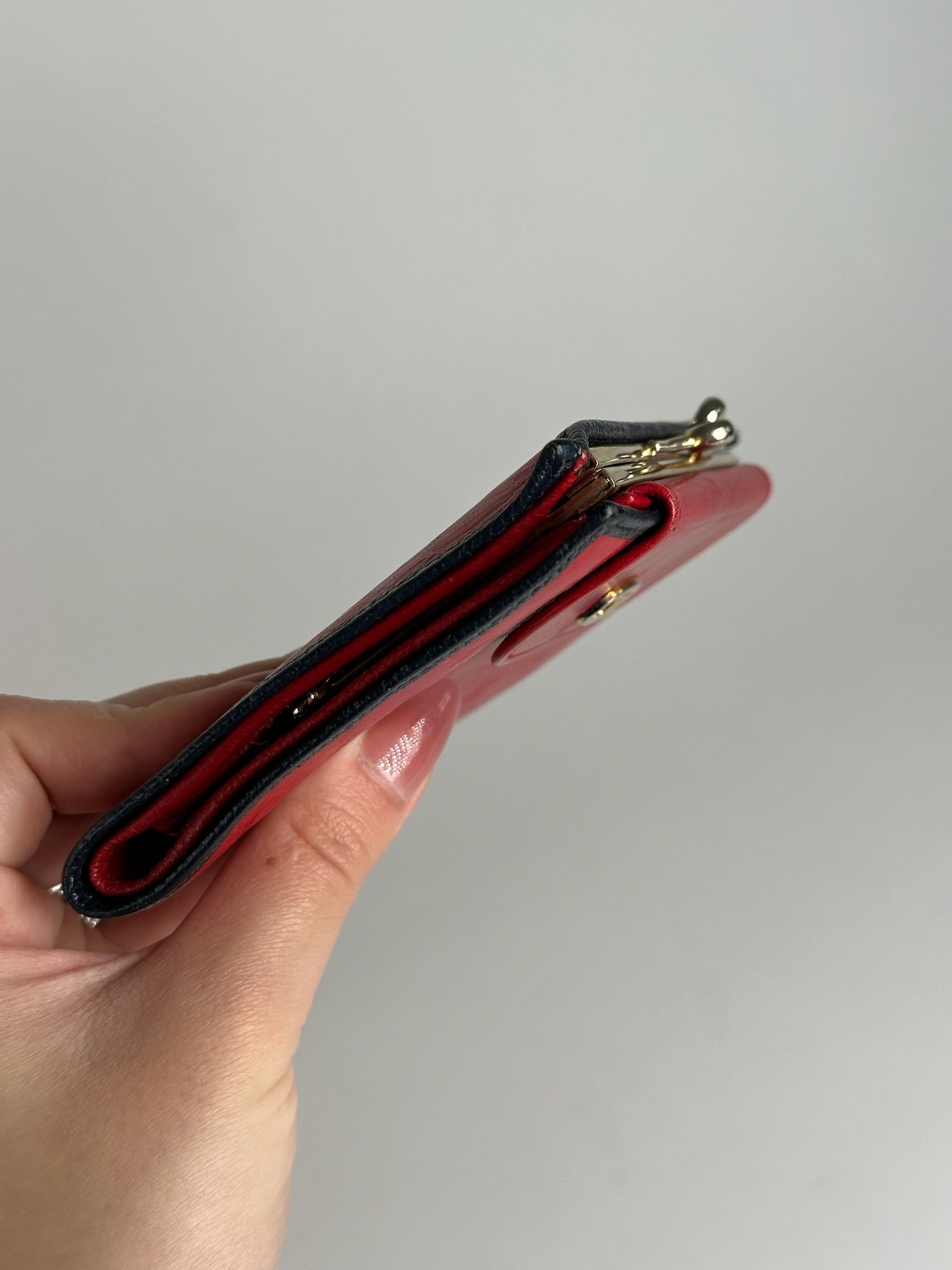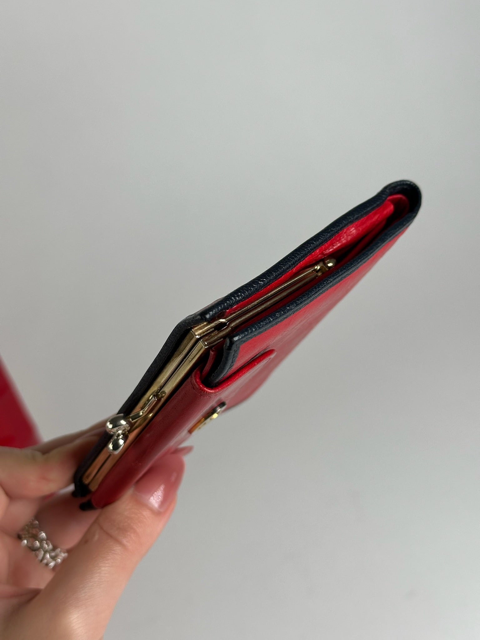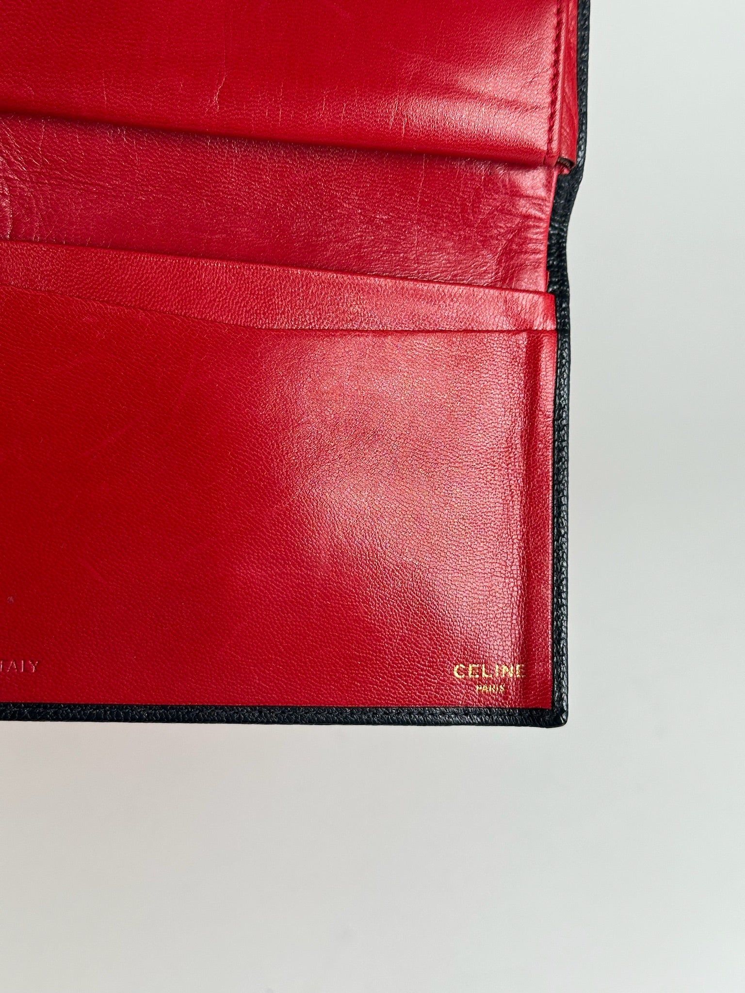 CELINE PARIS Vintage Monogram Leather Wallet. This chic wallet is finely crafted of red leather with an integrated CELINE monogram. The accessory features a white-gold tone steel logo on the front, a snap button closure for the bill and card compartment, and a flap closure for the coin section. The interior is lined in red leather.