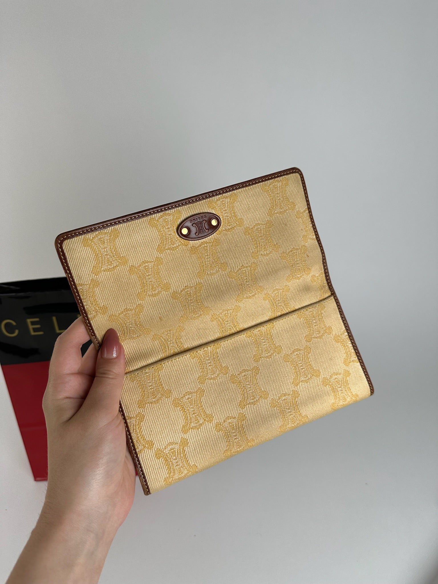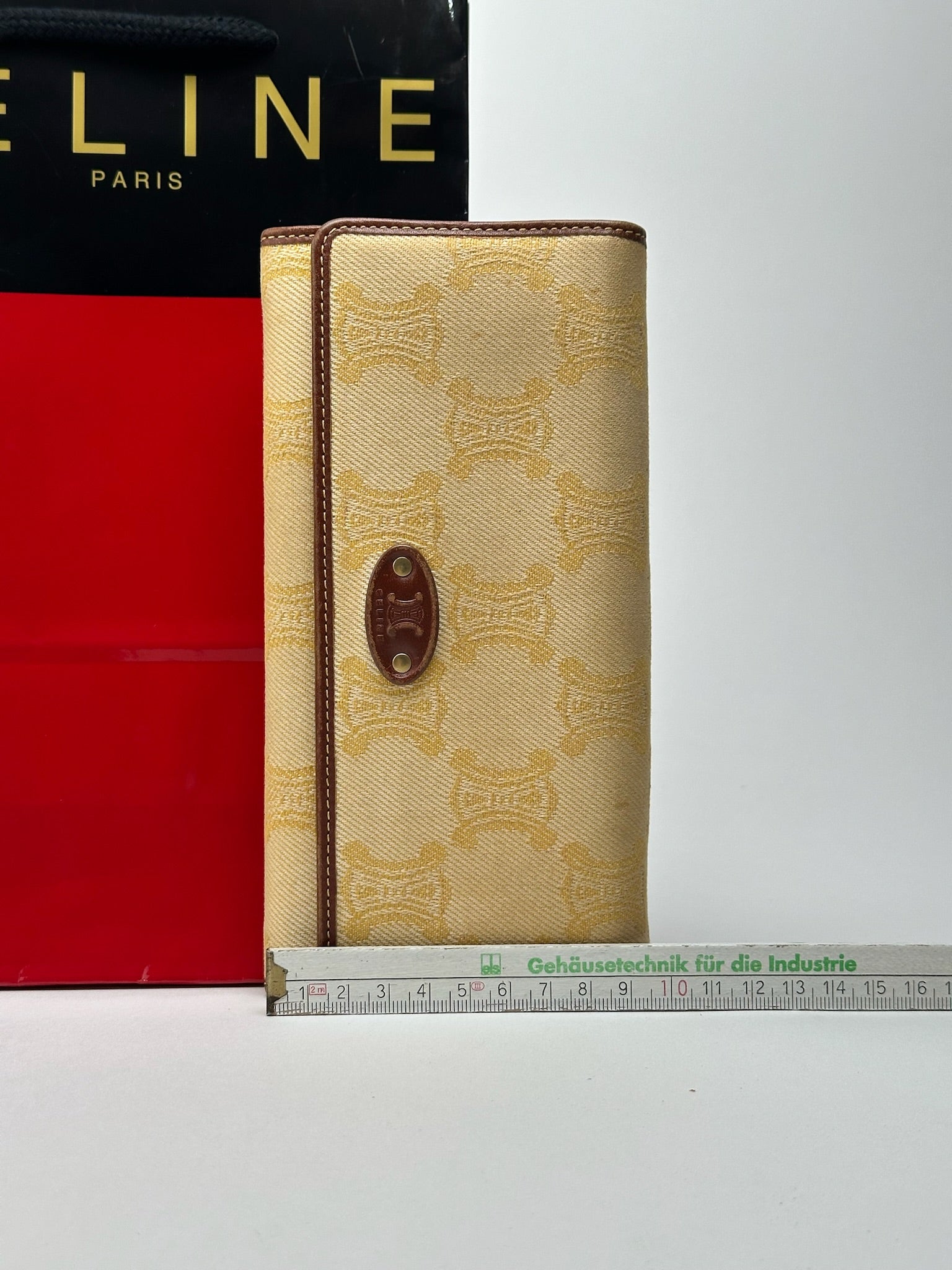 CELINE PARIS Vintage Monogram Canvas Wallet. This chic wallet is finely crafted of gold-yellow CELINE monogram canvas with brown leather trim. The accessory features gold-tone stainless steel hardware and opens to a red-brown leather interior.
