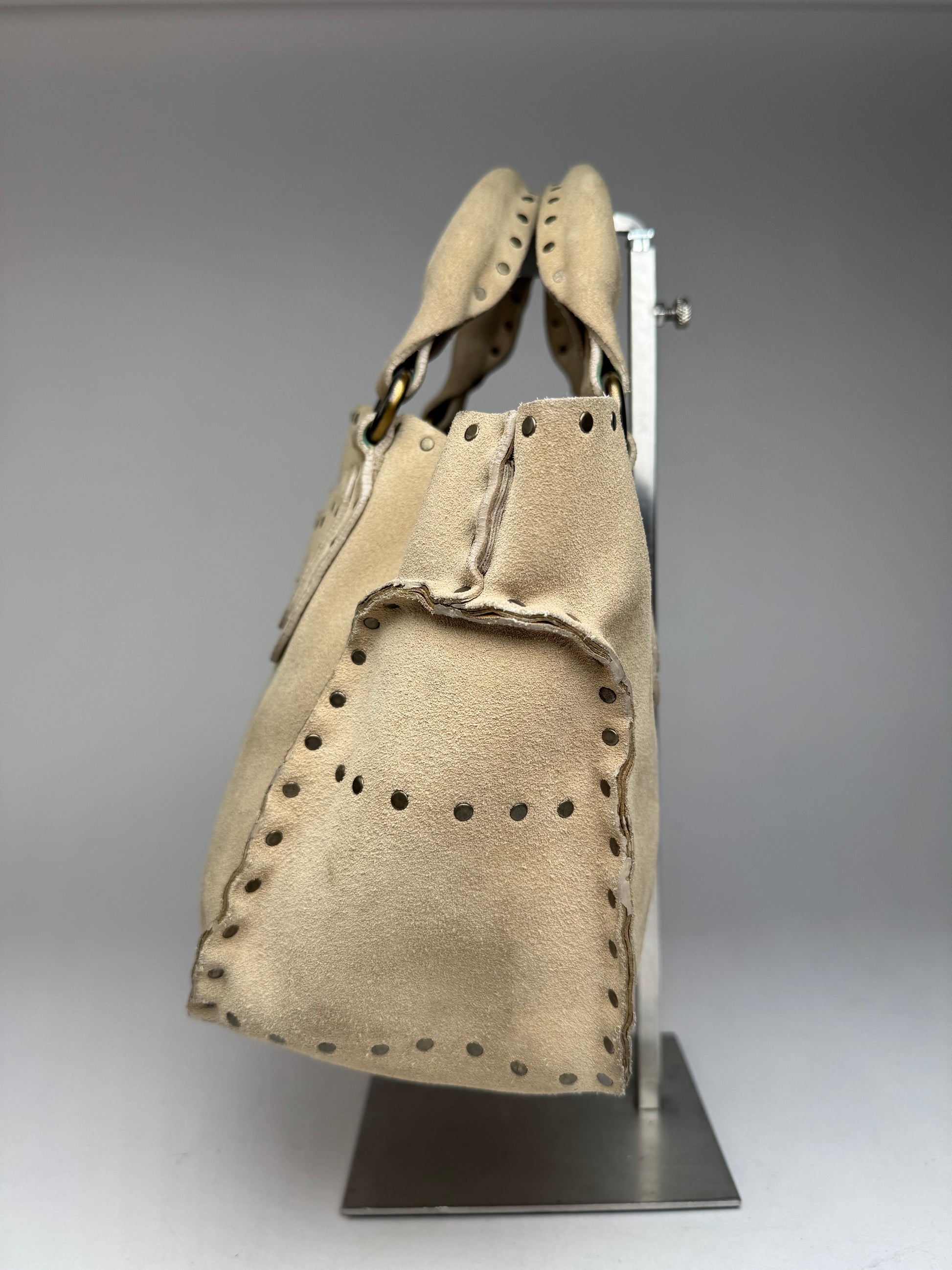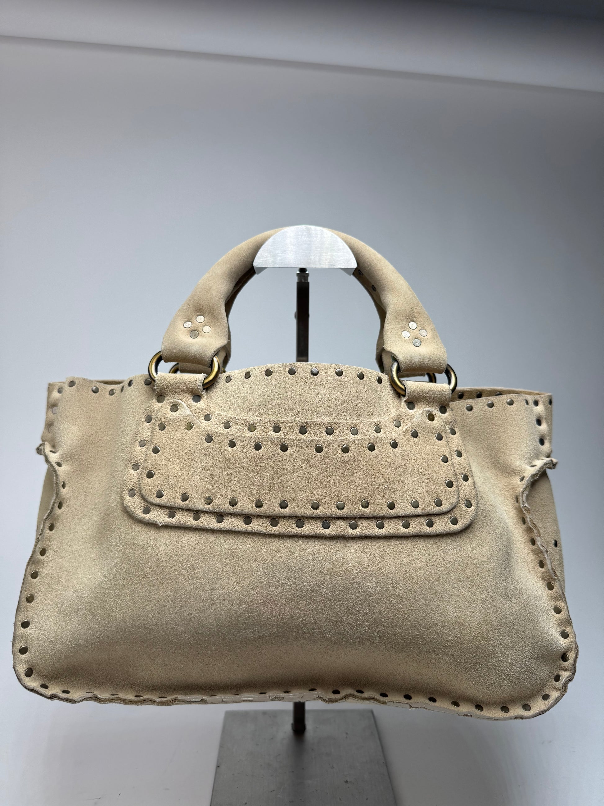 CELINE PARIS vintage handbag. This elegant handbag is crafted from beige suede and embellished with numerous silver-tone studs, creating a bold yet refined look. It features three interior compartments for practical organization. A stylish piece made in Italy.
