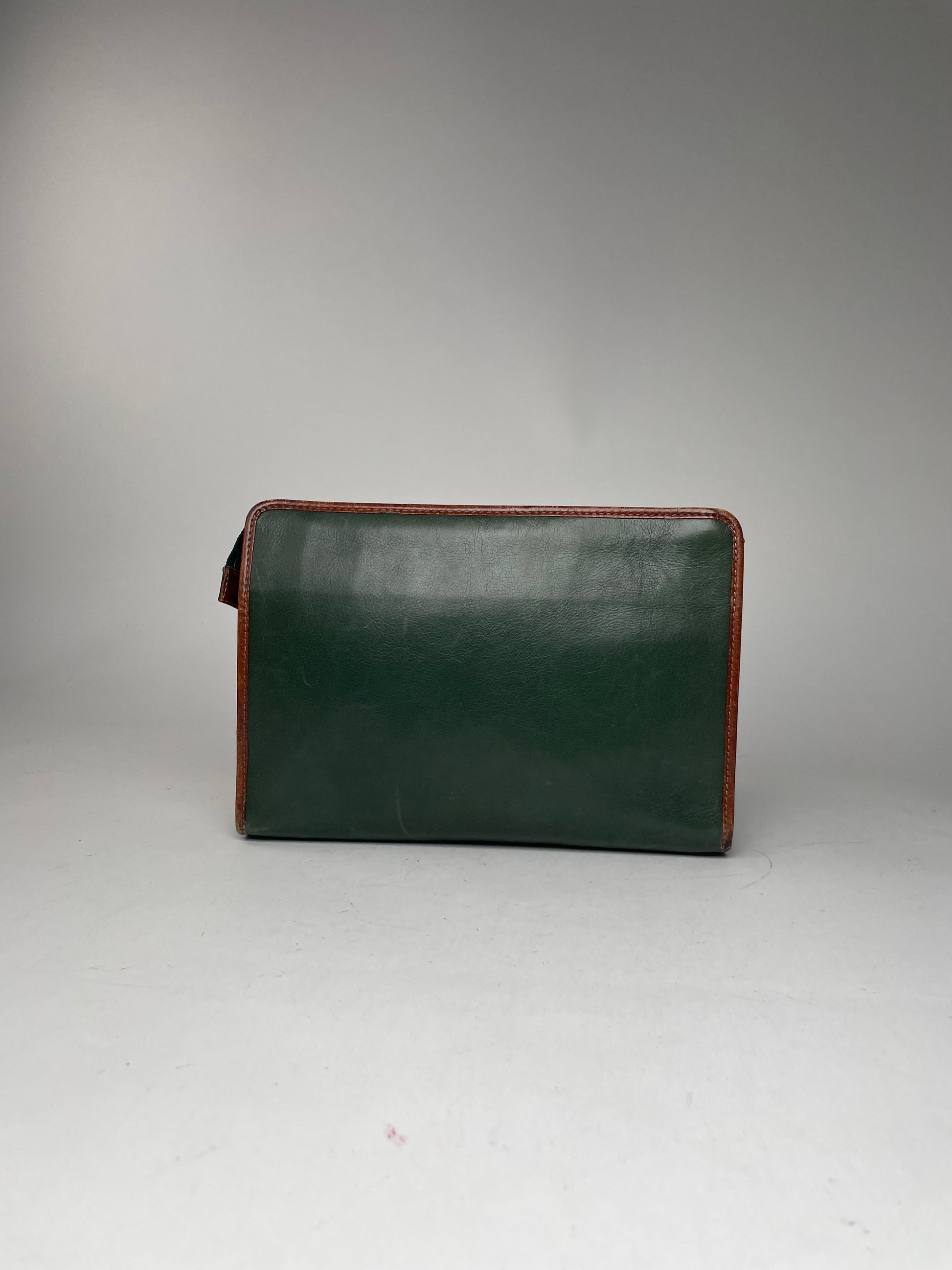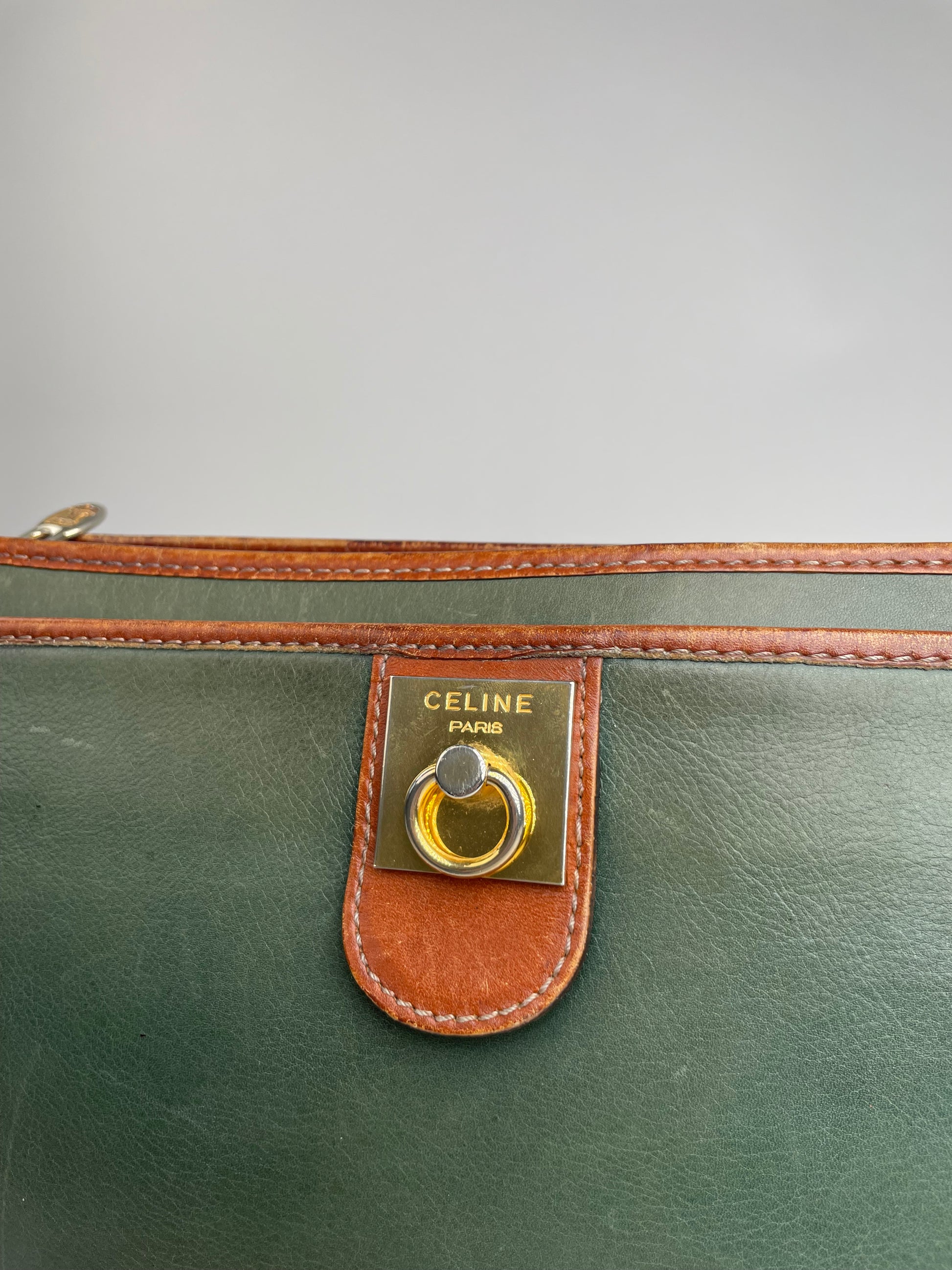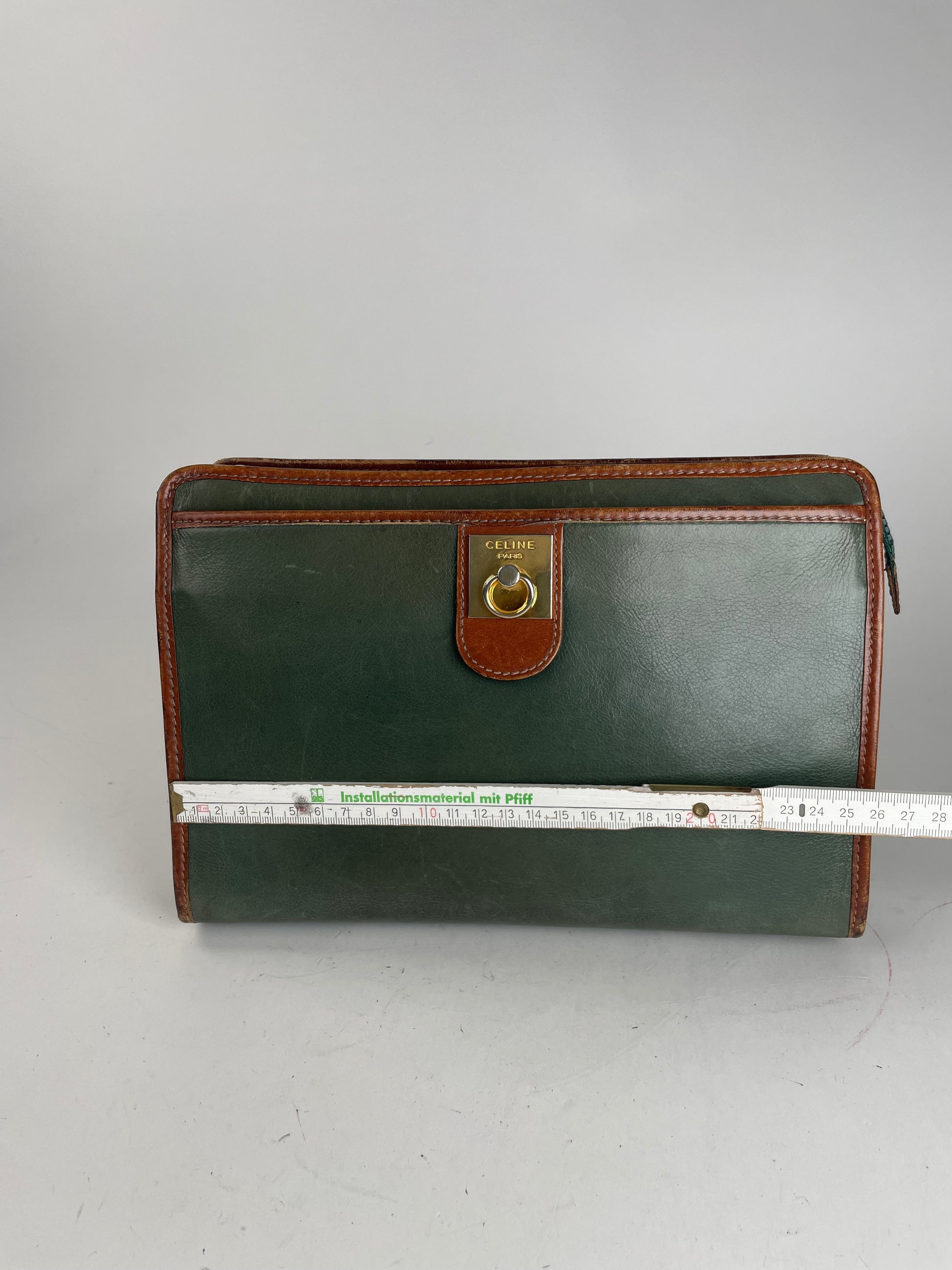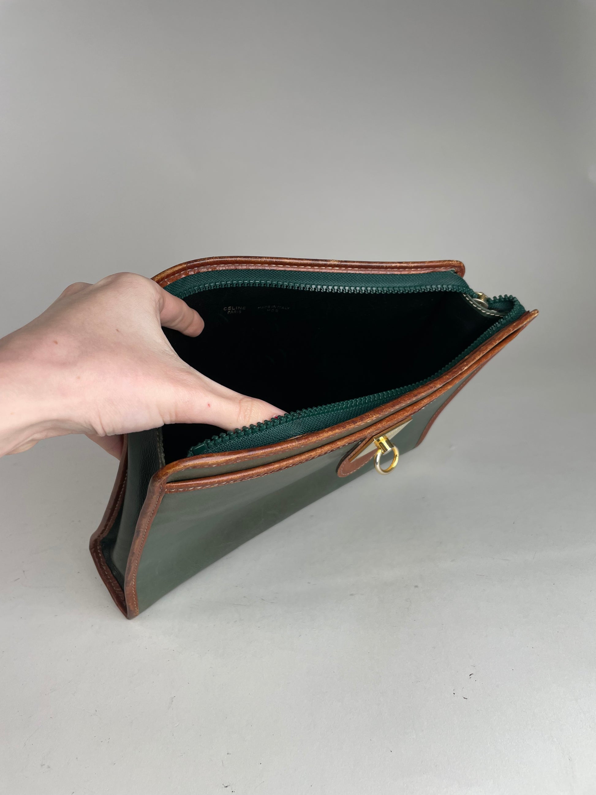 CELINE PARIS vintage Triomphe clutch. This elegant vintage clutch is crafted from green and brown leather, featuring gold-tone steel hardware for a timeless and sophisticated look.