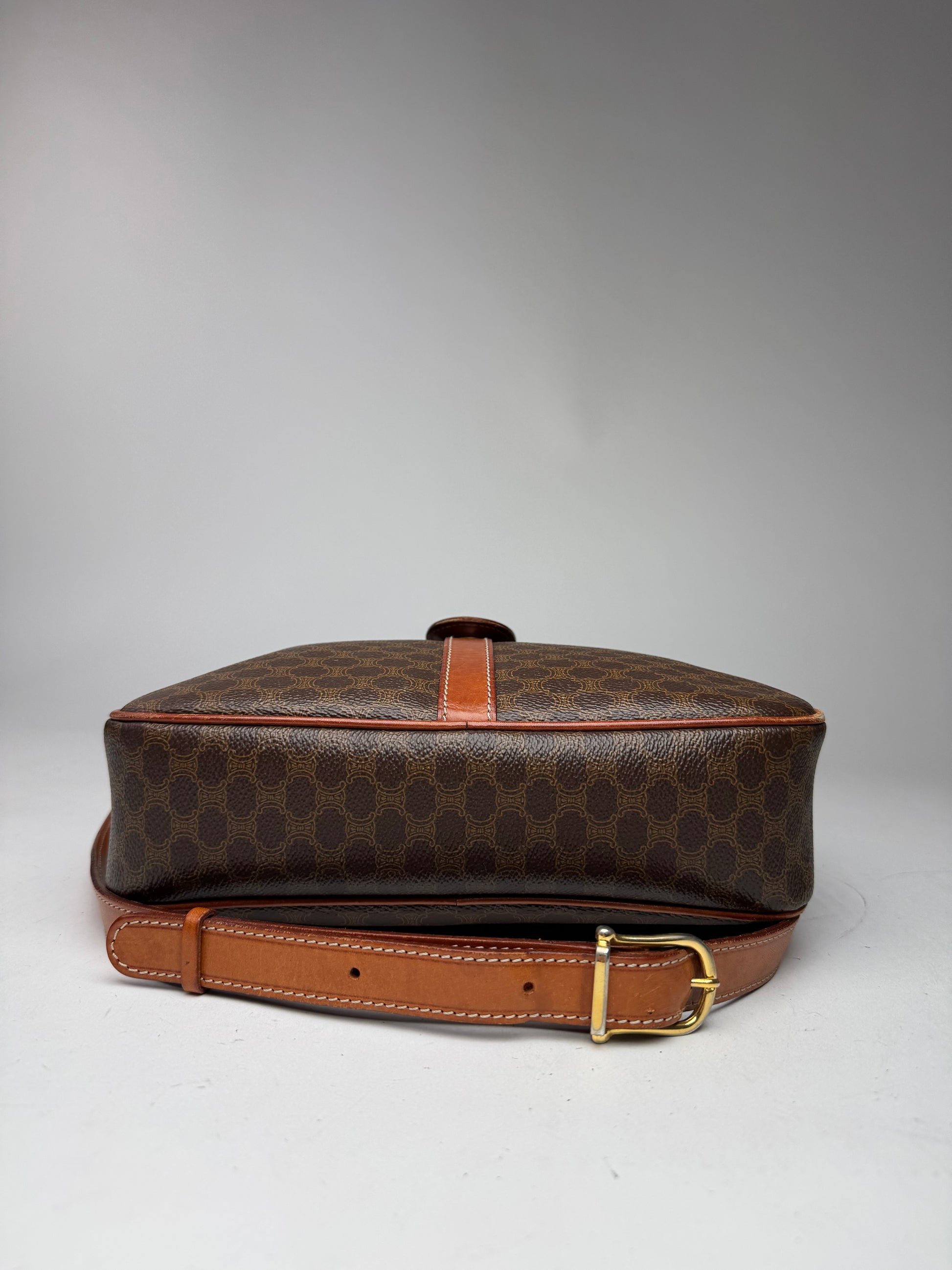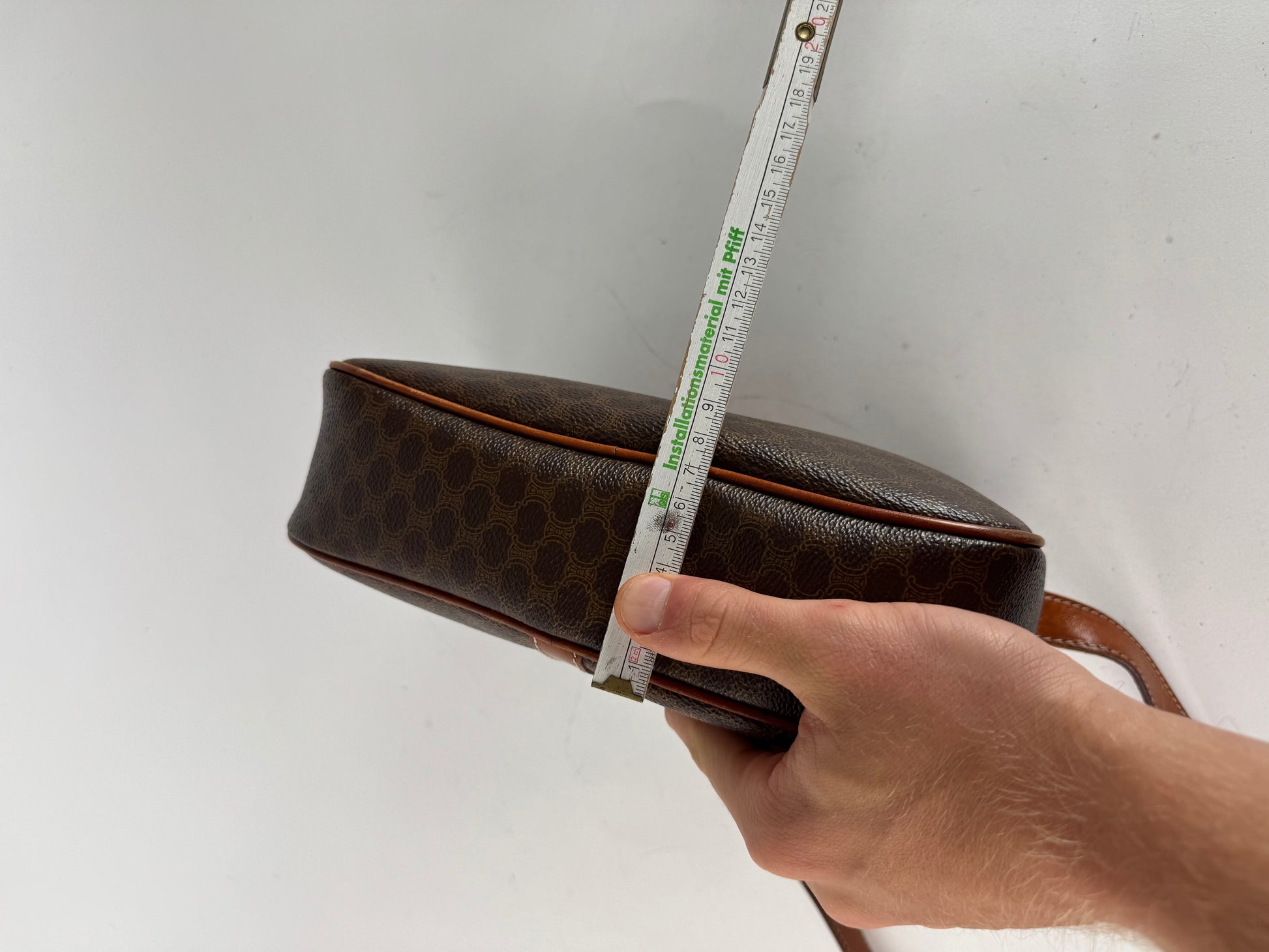 This unisex shoulder/crossbody bag from Celine is crafted from dark brown leather featuring the Celine monogram. The adjustable shoulder strap allows for a customizable fit. The hardware is golden steel, adding a touch of elegance. The interior is lined with beige-brown leather. This model, the Triomphe, is made in Italy and dates back to 2010. The bag is in very good condition, with some minor stains, slight material damage, and the zipper pull is missing.