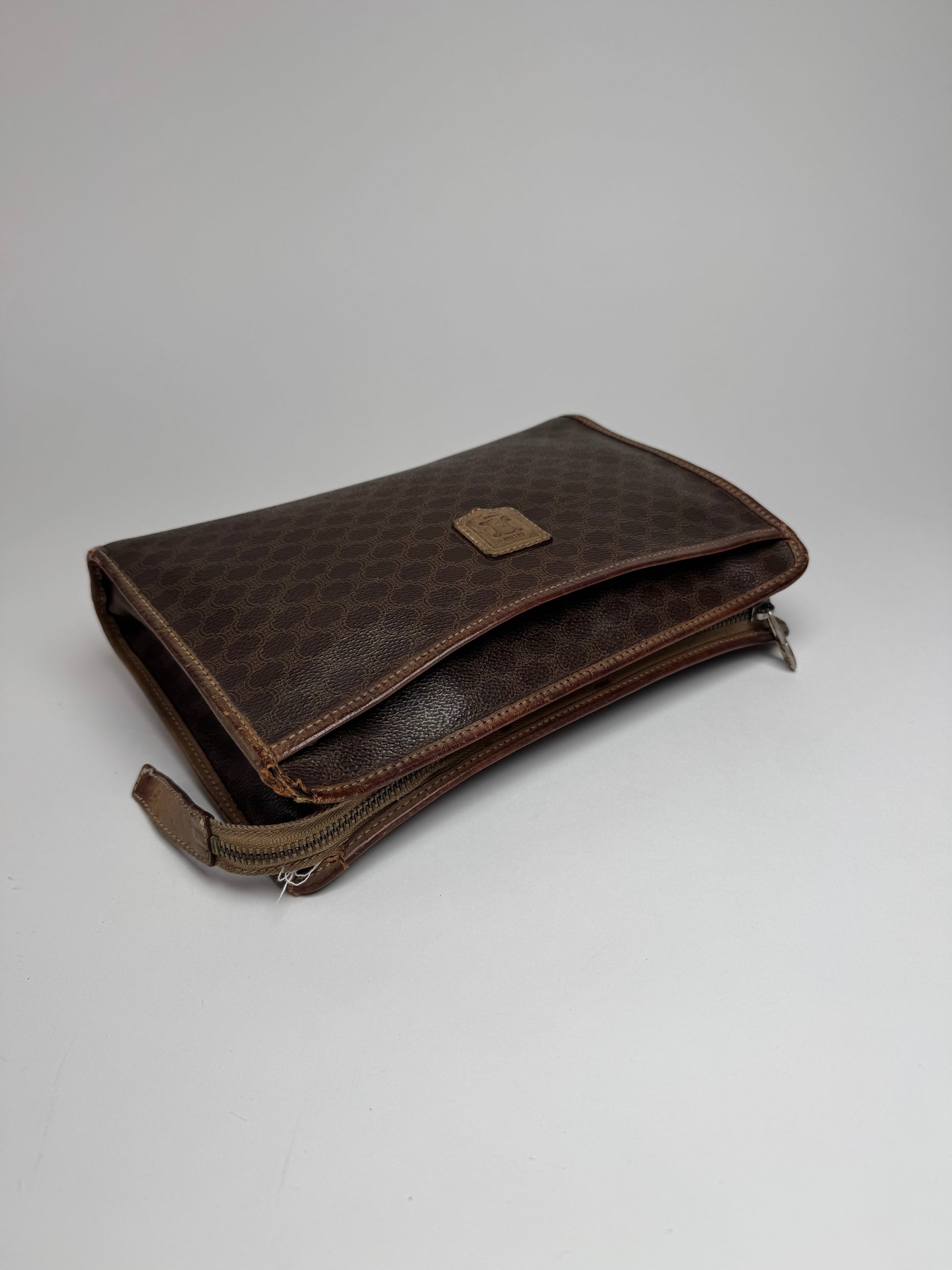 Vintage Celine Paris Triomphe Monogram Leather Clutch Brown