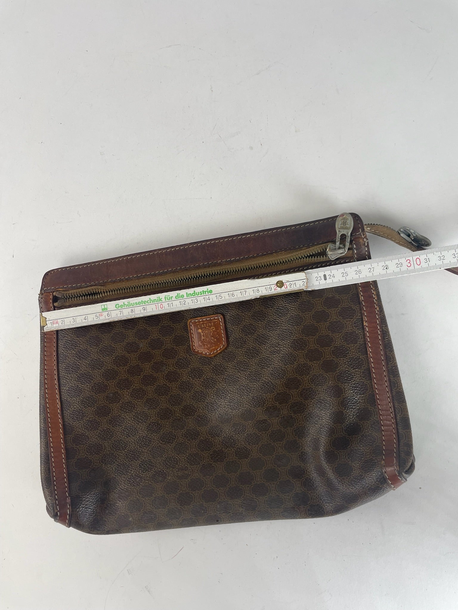 This stylish vintage clutch by Celine Paris is crafted from brown leather featuring a subtle monogram pattern. The interior is lined with light brown leather, adding to its luxurious feel. The bag is made in Italy and is in very good condition, with some minor scratches and scuffs.