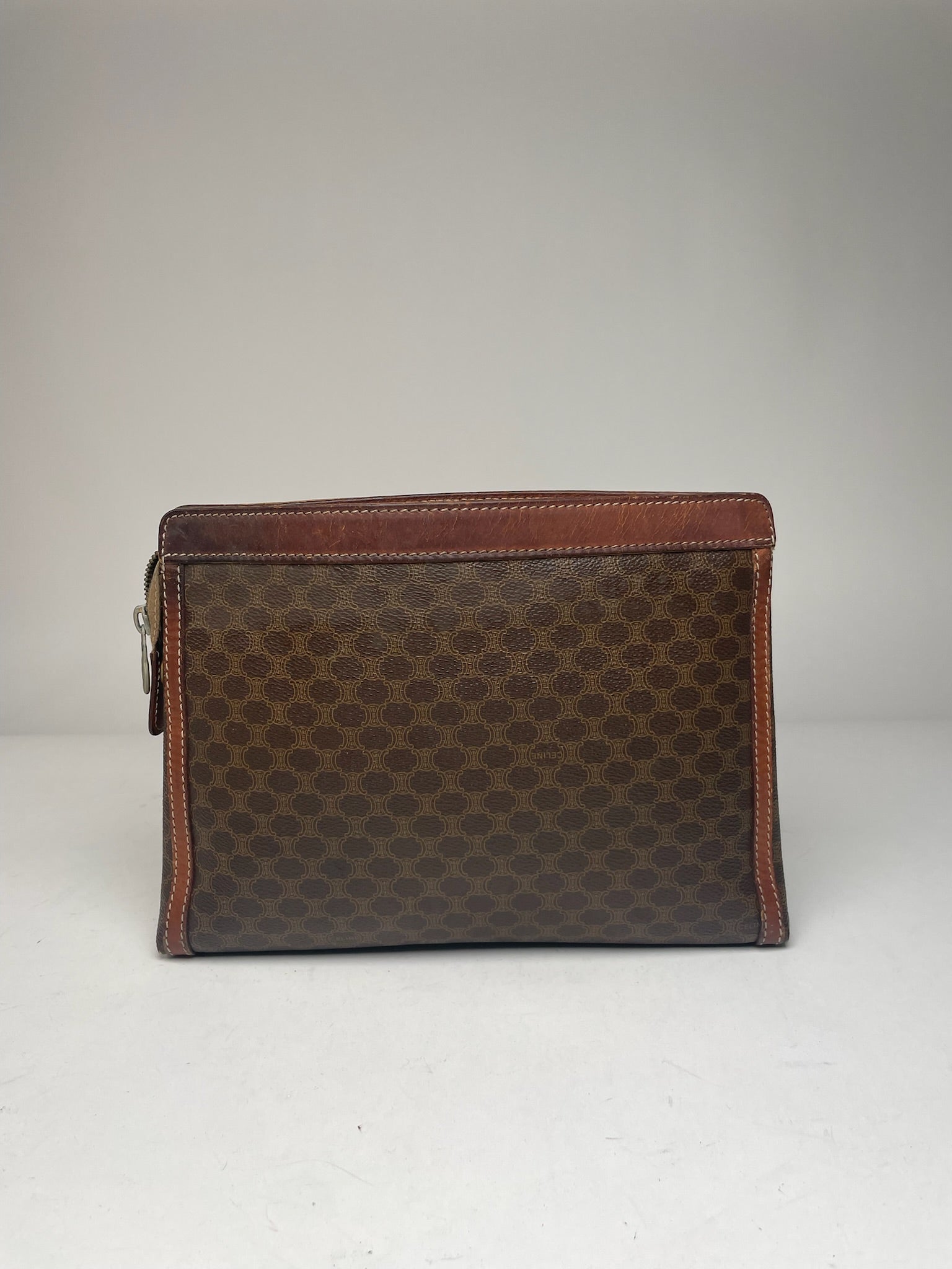 Vintage Celine Paris Triomphe Monogram Leather Clutch Brown