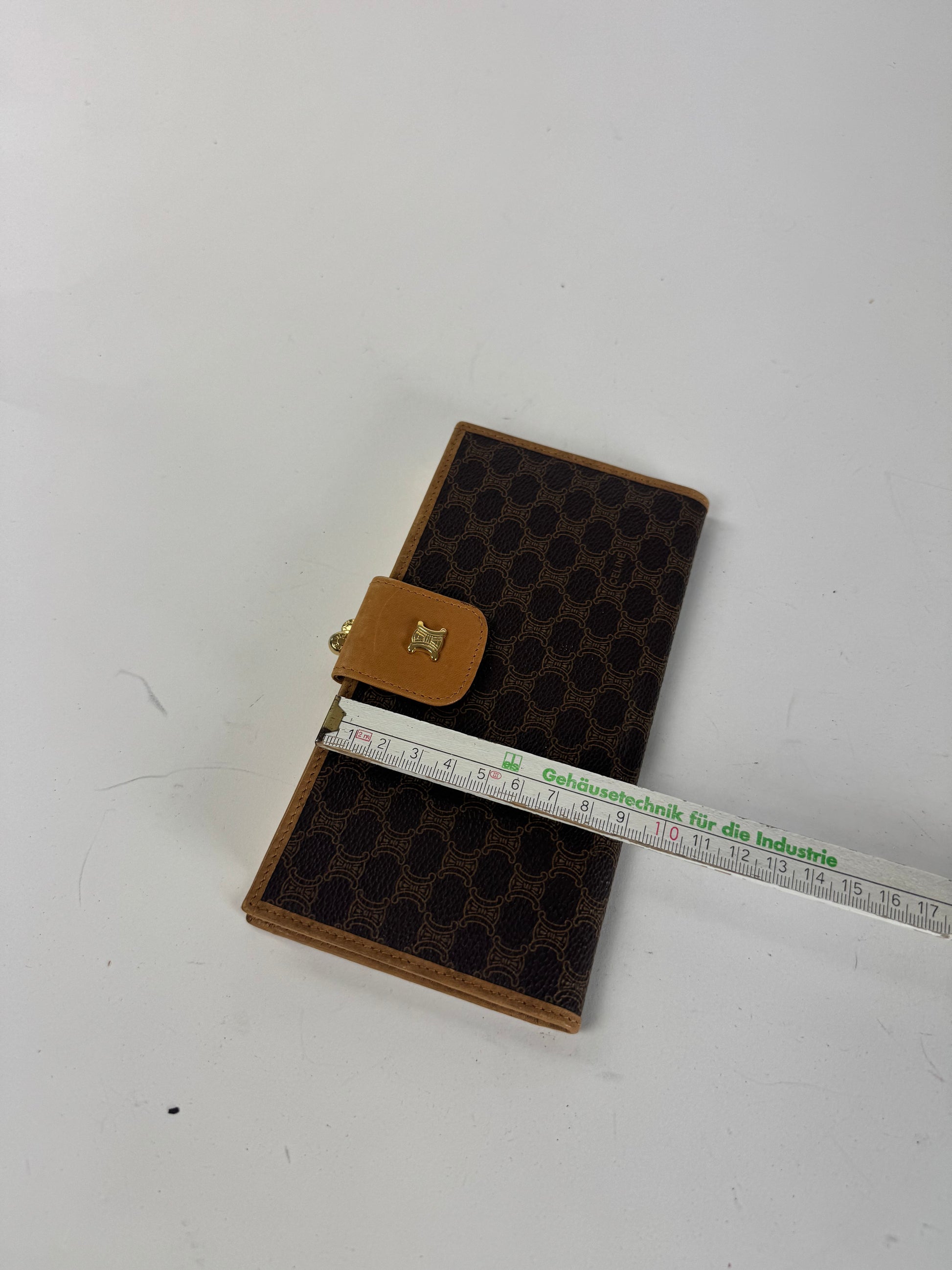 CELINE PARIS vintage wallet. This vintage Celine Paris wallet is crafted from dark brown leather with the iconic Celine monogram , complemented by mustard-colored leather accents . The gold-tone steel hardware adds a luxurious finish. Made in Italy in 2007 , the wallet remains in very good condition despite minor scratches.