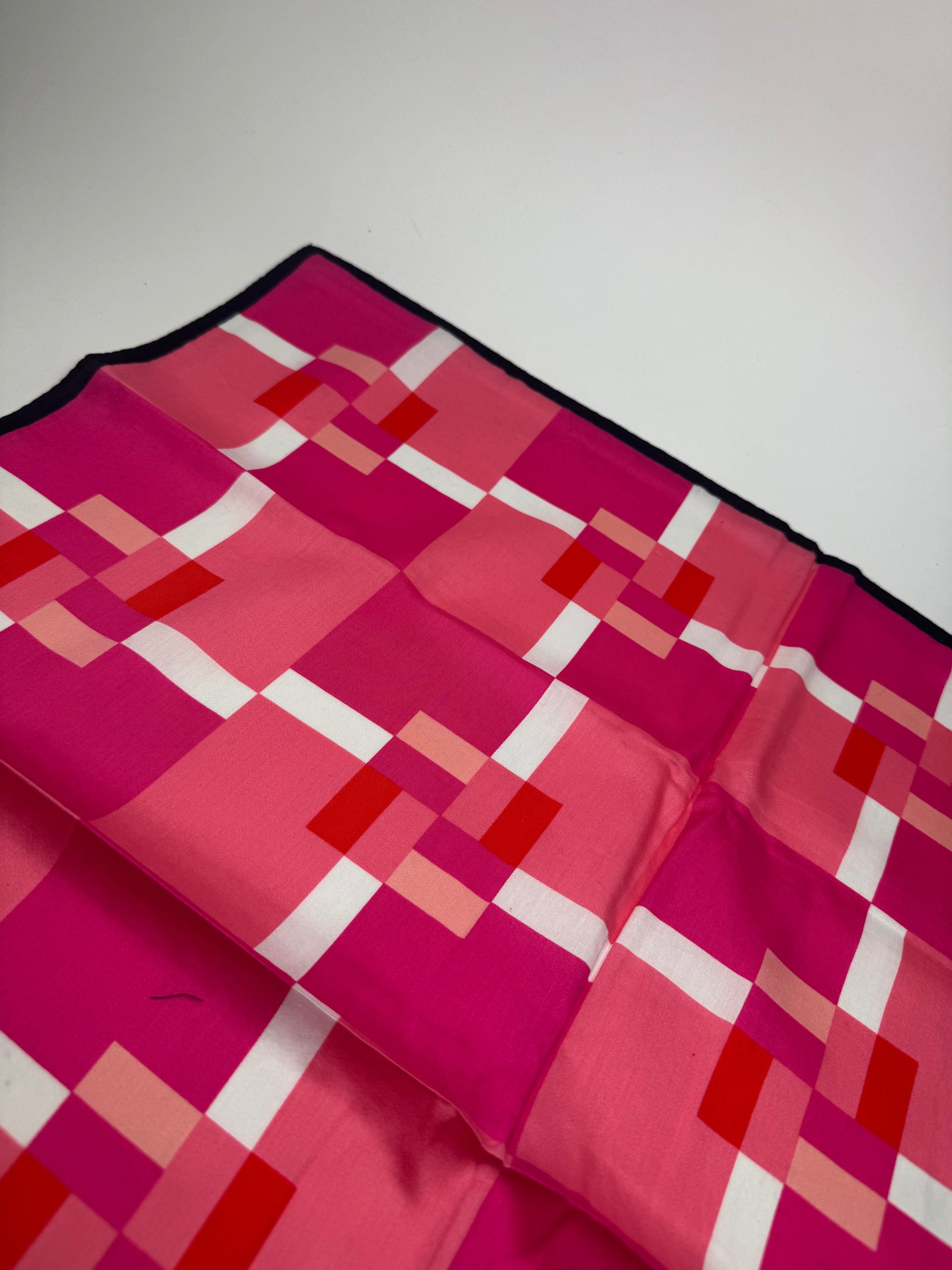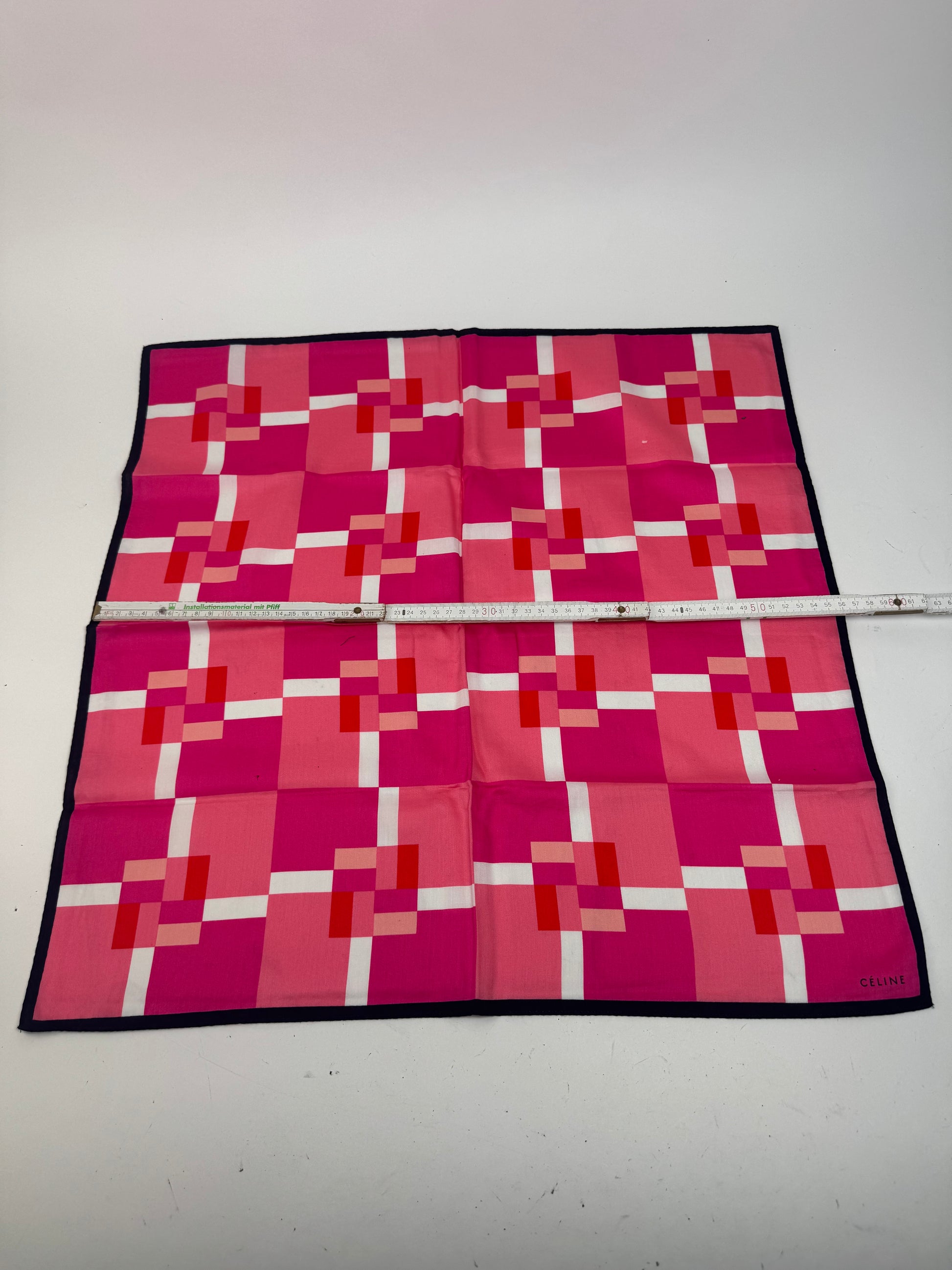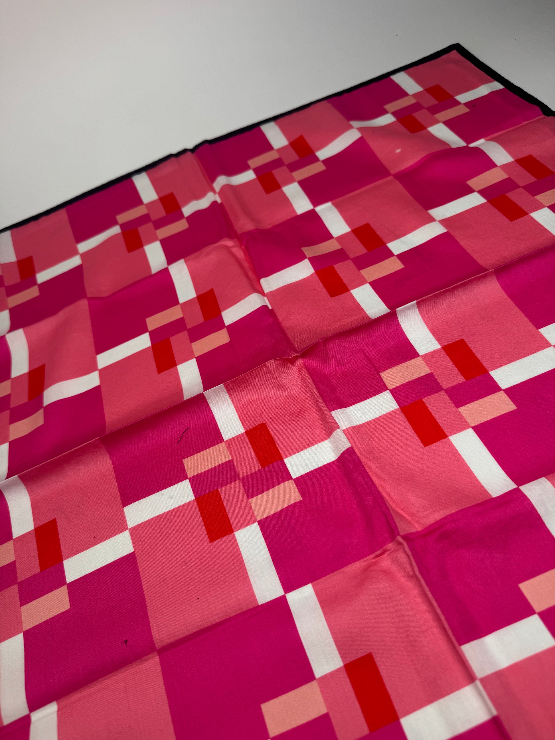 CÉLINE PARIS Vintage Silk Canvas Scarf. This vibrant scarf features a bold pattern in shades of lilac, white, red, and pink, framed by a contrasting black border. Crafted from a refined silk and canvas blend, it showcases Céline's elegant yet expressive design aesthetic.