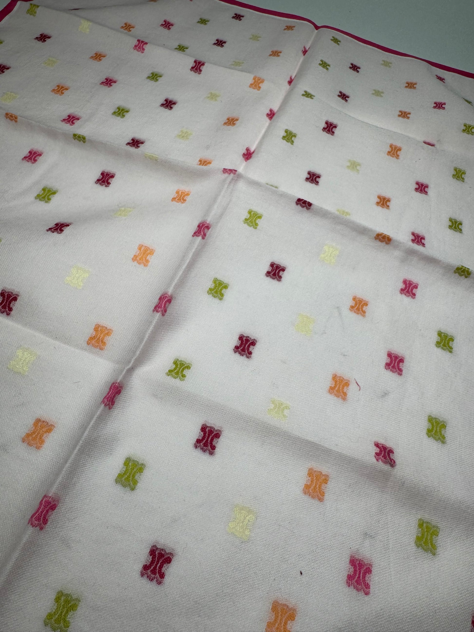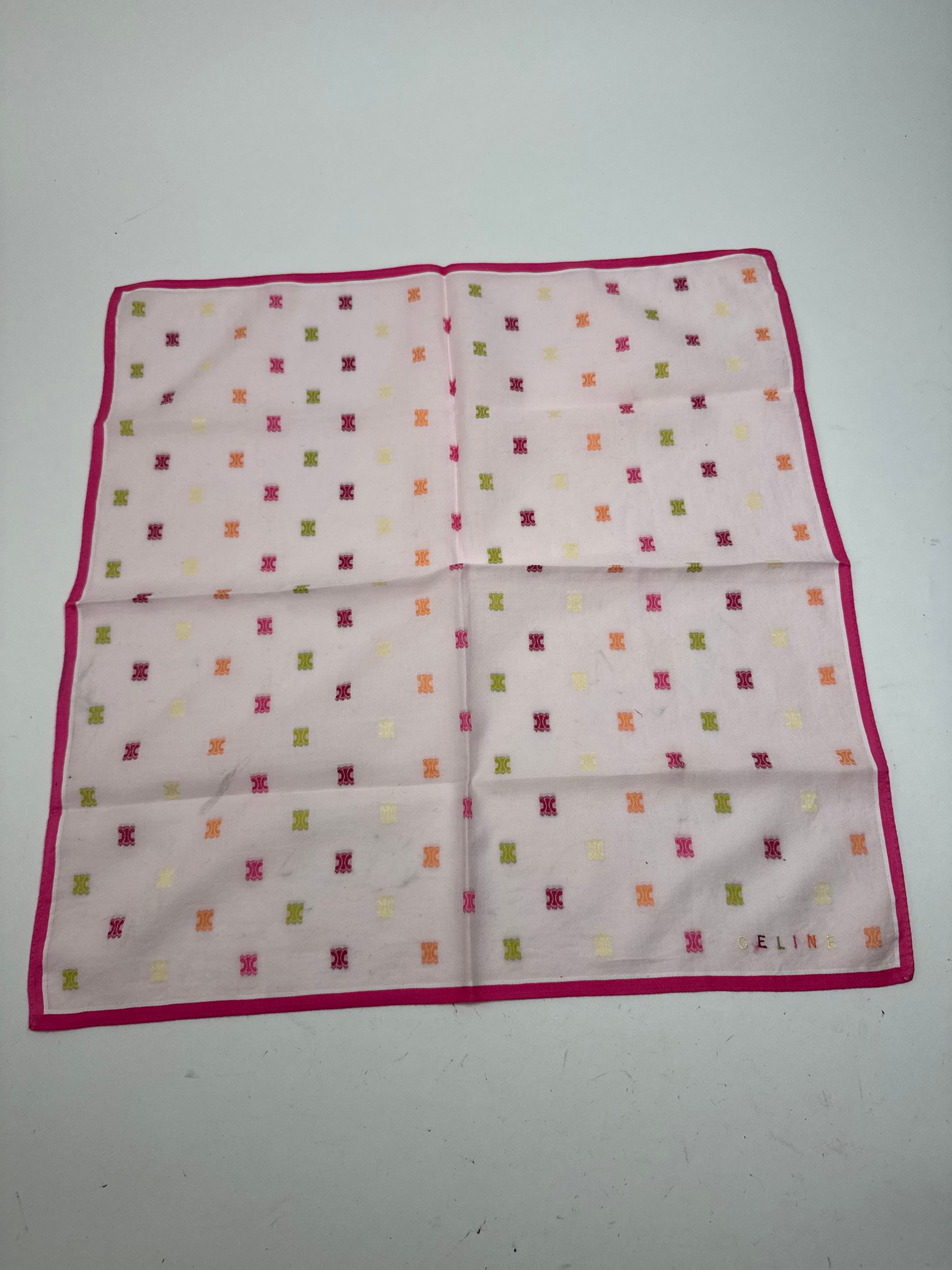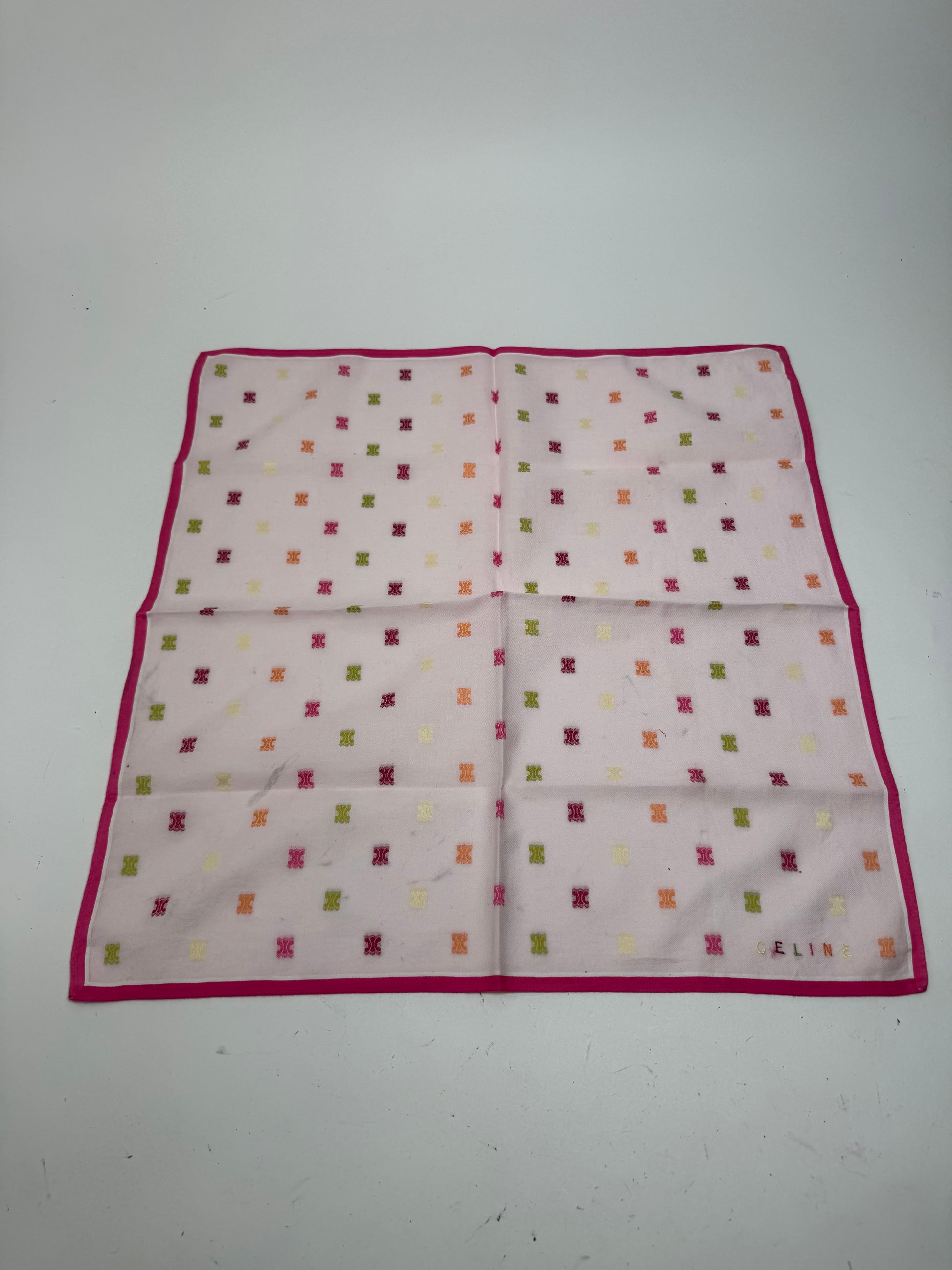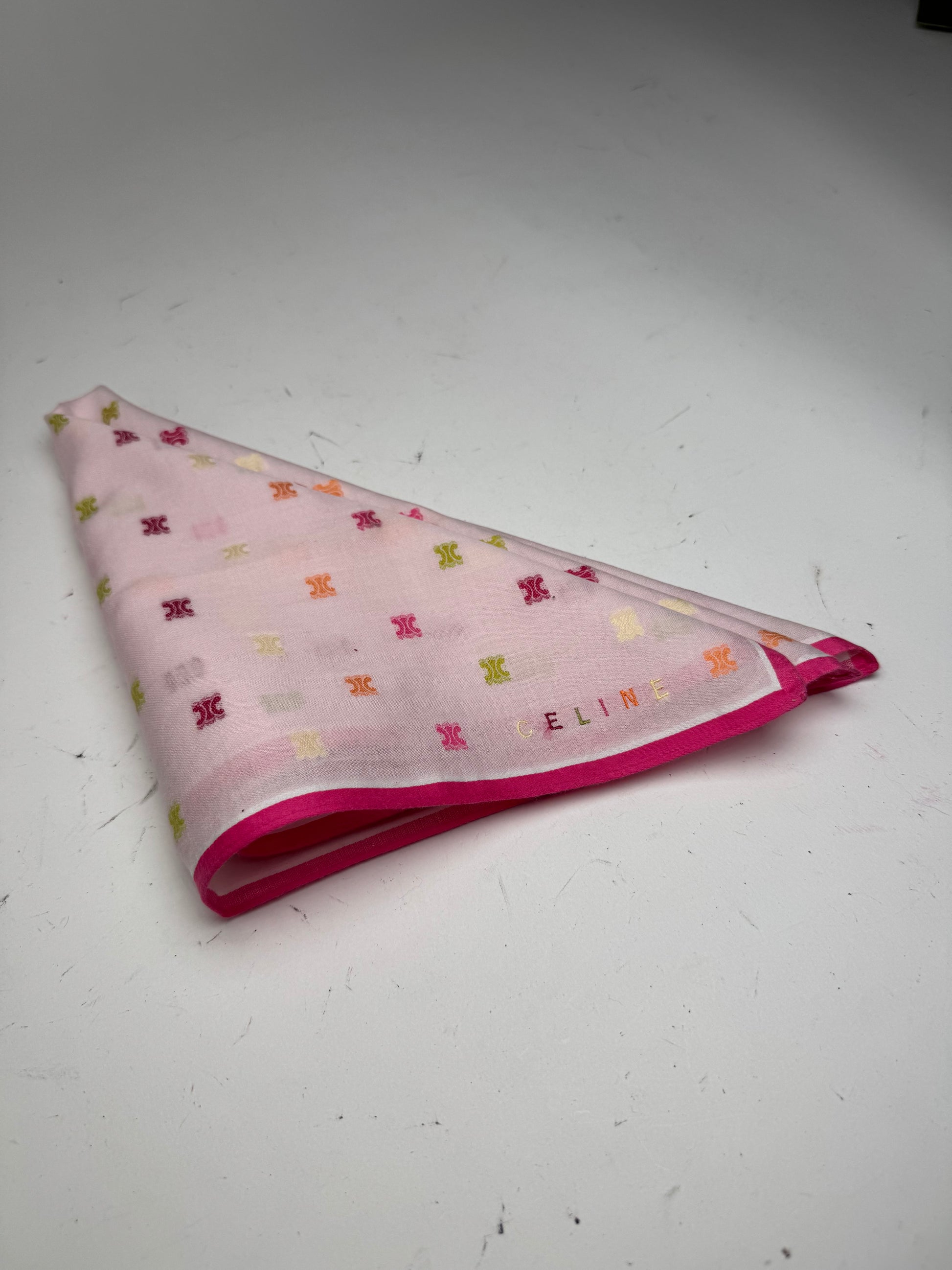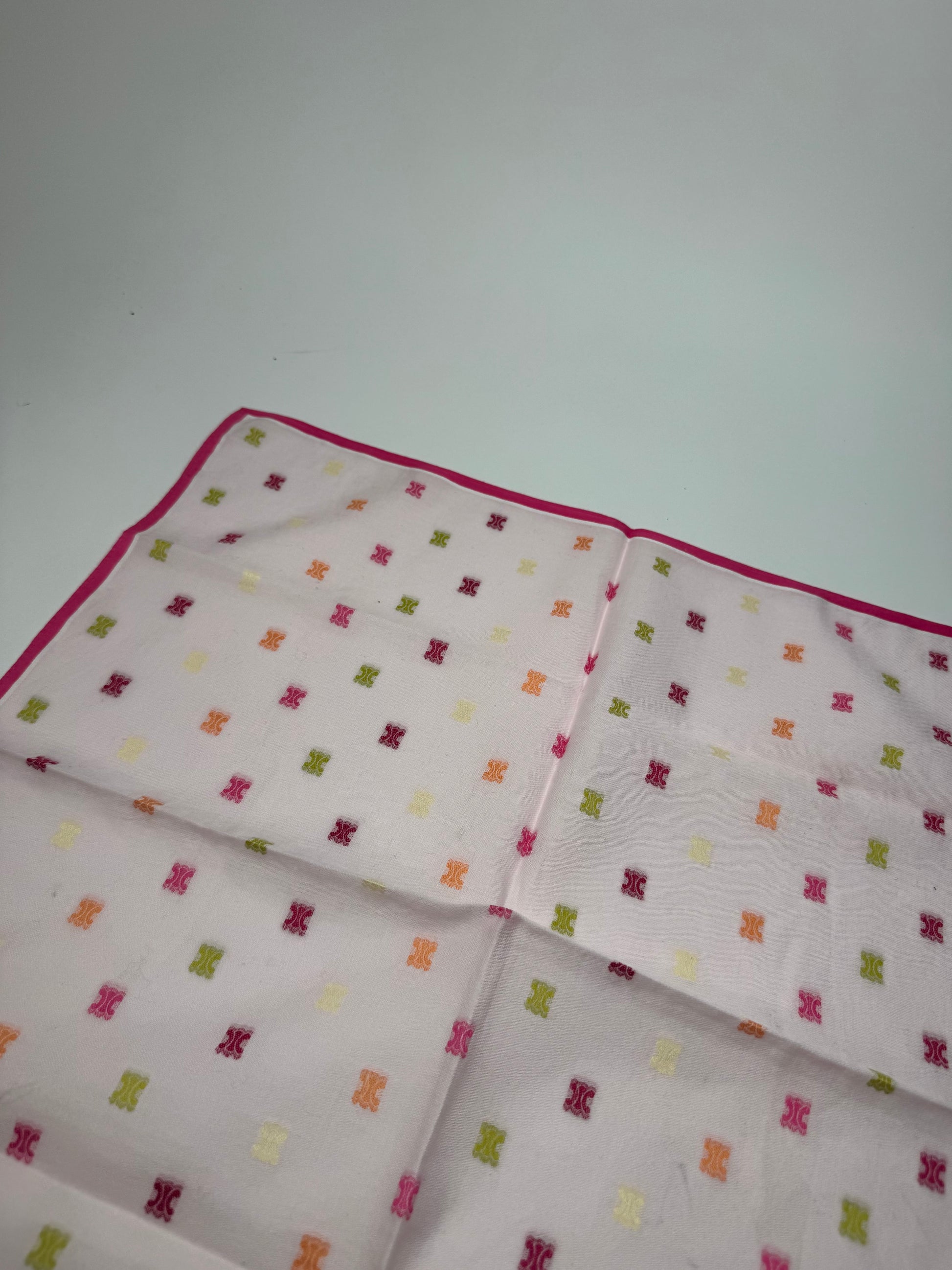 CELINE Triomphe Multicolor Monogram Scarf. This vintage scarf is crafted from a soft blend of raw cotton and silk with a pink base color. The design features Céline's iconic Triomphe logos in orange, white, purple, green, and pink arranged in a full monogram pattern, framed by a bold pink border. The Triomphe motif, introduced in the 1970s, was inspired by the chain surrounding the Arc de Triomphe and remains a core element of the brand's identity.