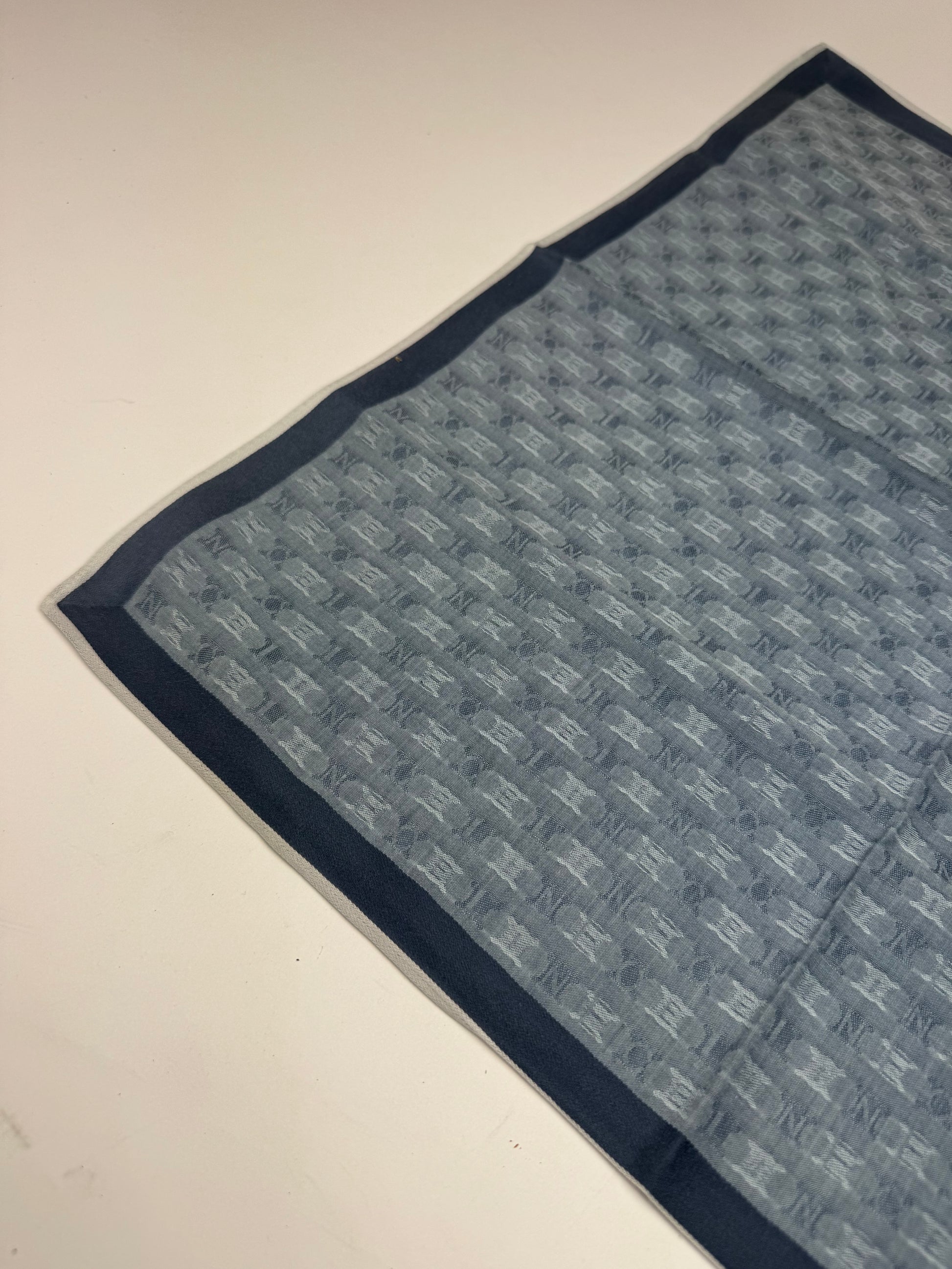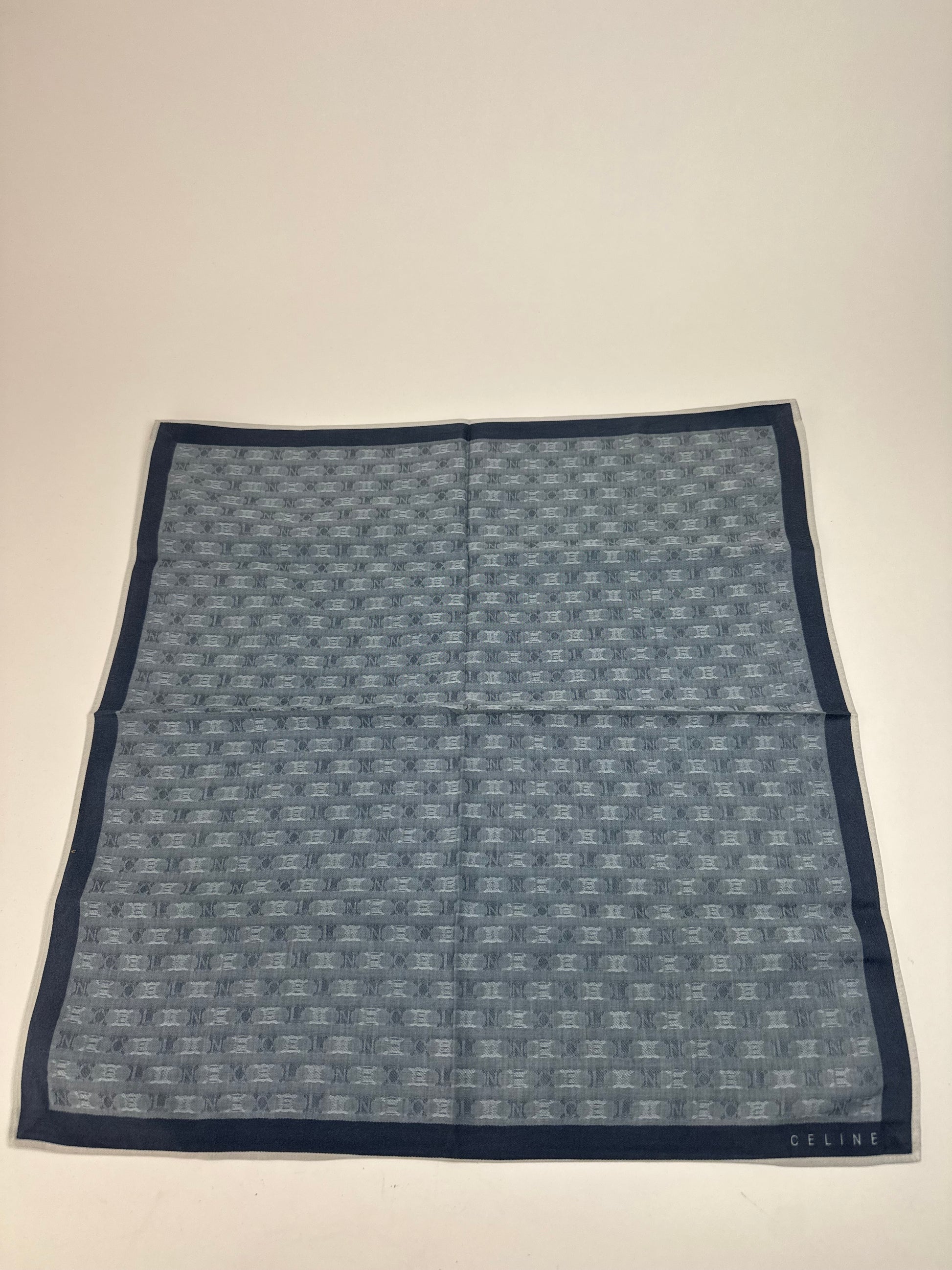 CELINE PARIS Grey Blue Triomphe Monogram Scarf. This vintage scarf is crafted of a soft cotton and silk blend in a grey-blue base, featuring the iconic CELINE Triomphe monogram throughout. CELINE, established in 1945, is celebrated for its minimalist Parisian style and refined elegance. The scarf is bordered in white and navy.