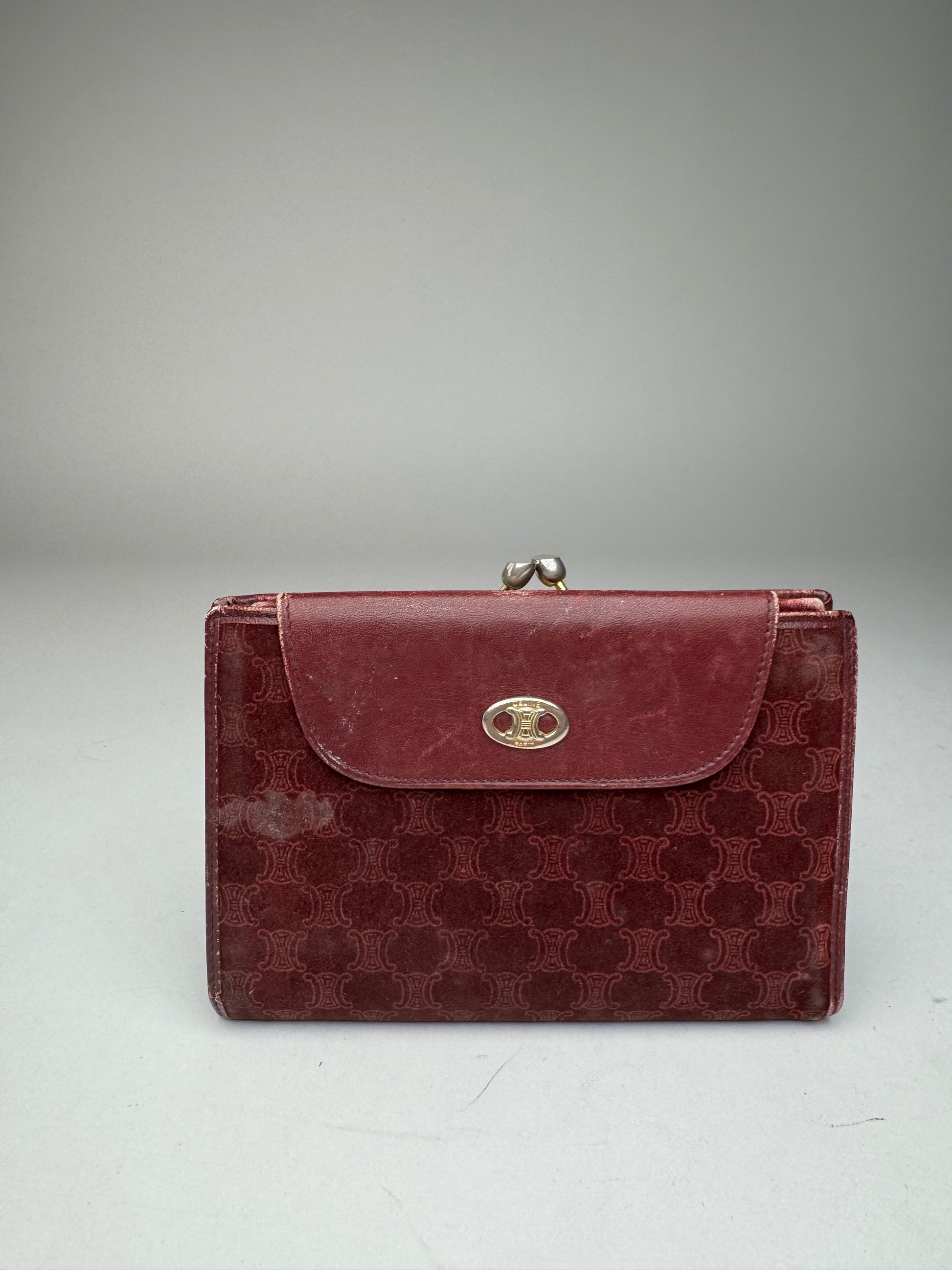 Vintage Celine Triomphe Monogram Suede Leather Wallet Burgundy
